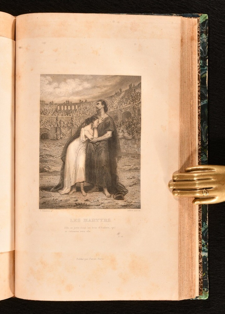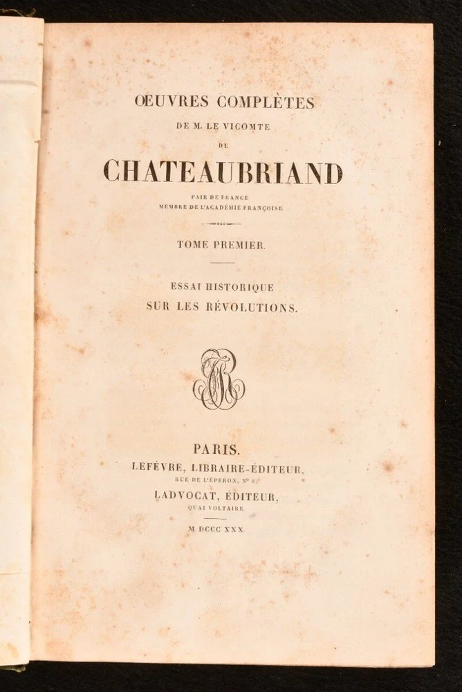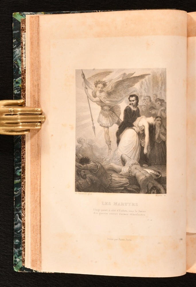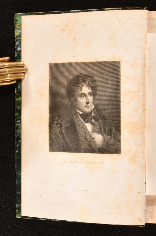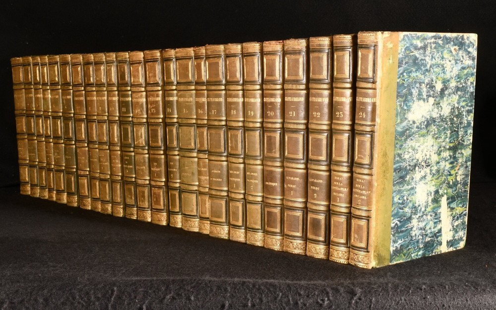 Click here to see our other books! Oeuvres Completes de M. le Vicomte de Chateaubriand François-René, vicomte de Chateaubriand 1830-36 Lefevre : Paris 9" by 5.5" SUMMARY The complete works of François-René in twenty-four uniform bindings, vicomte de Chateaubriand in the original French. Illustrated,Leather Binding,Rebound Overall Condition: Very Good This book weighs 20 KG when packed UK Postage: £ 4.49 US Postage: £ 89.99 EU Postage : £ 45.99 European Postage: £ 85.99 Asia Postage: £ 169.99 Worldwide Postage: £ 259.99 DESCRIPTION An early edition in twenty four volumes of the collected works of François-René, vicomte de Chateaubriand important French author and politician who had a great influence on French literature of the nineteenth century, dominating the literary scene of the time. In the original French. In uniform half calf bindings. Complete with half titles. Comprising his historical essays and studies, travelogues, works on Christianity including his defence of the Catholic faith, novellas, poems, &c. Notably featuring his works 'Les Martyrs' (in two volumes), 'Atala' and 'Rene', celebrated long prose epics, and his exotic novel 'Les Natchez' among others. Comprising: Historical essays, illustrated with a frontispiece to vol. I; Historical miscellanies with two portraits to vol. II; Travelogues in three volumes, with five plates of engravings to vol. VI, eight to vol. VII, one to vol. VIII; 'Genie du Christianism' in three volumes, with one full page plate to vol. IX, one to vol. X, and one to vol. XI; 'Atala' and 'Rene' with his poems, featuring three full page plates to vol. XII; 'Les Martyrs' in two volumes, with two plates to vol XIII, two to vol. XIV; 'Les Natchez' with one full page plate to vol. XV; Miscellaneous literary works; Opinions and speeches; Political miscellanies in two volumes; Argumentative essays; 'Paradise Lost' by Milton translated to French by Chateaubriand in two volumes; Essays on English literature in two volumes. CONDITION In uniform half calf bindings over marbled boards, with four raised bands, gilt tooling and titles to spine. Externally smart with minor shelf wear only, lightly chipped and bumped to head and tail of spine, rubbed to boards and extremities, back strip faded. Sticker to front pastedowns. Internally, firmly bound. Light foxing scattered to leaves. Overall Condition: Very Good GLOSSARY OF TERMS Overall Condition (Dustwrapper condition rating is shown after that for the book itself, where a dustwrapper is present) Fine - Very well preserved copy showing very little wear Very Good Indeed - Only one or two minor faults, really a very attractive copy Very Good - Quite a wide term meaning no major faults but probably several smaller ones often expected given the age of the book, but still a respectable copy Good - Meaning not very good. Some more serious faults as will be described in the condition report under 'condition' Good Only - Meaning one or more faults that could really do with repair Fair - As with good only above but with other faults leaving a compromised copy even after repair Poor - Really bad and possibly seriously incomplete. We only sell books in this condition where their rarity or value makes them attractive none the less. Major defects will be described. GUARANTEE We offer a full money back guarantee on our descriptions. Please ask for details and conditions. We prefer PAYPAL. If you pay via PAYPAL we will post the item off the same or the next working day with the postage you have selected. Please note we cannot accept USD cheques