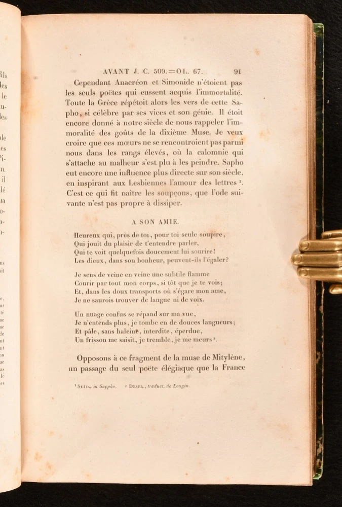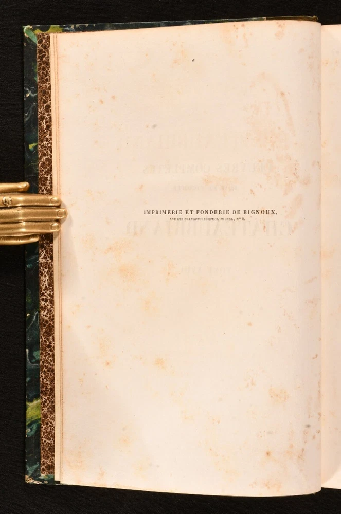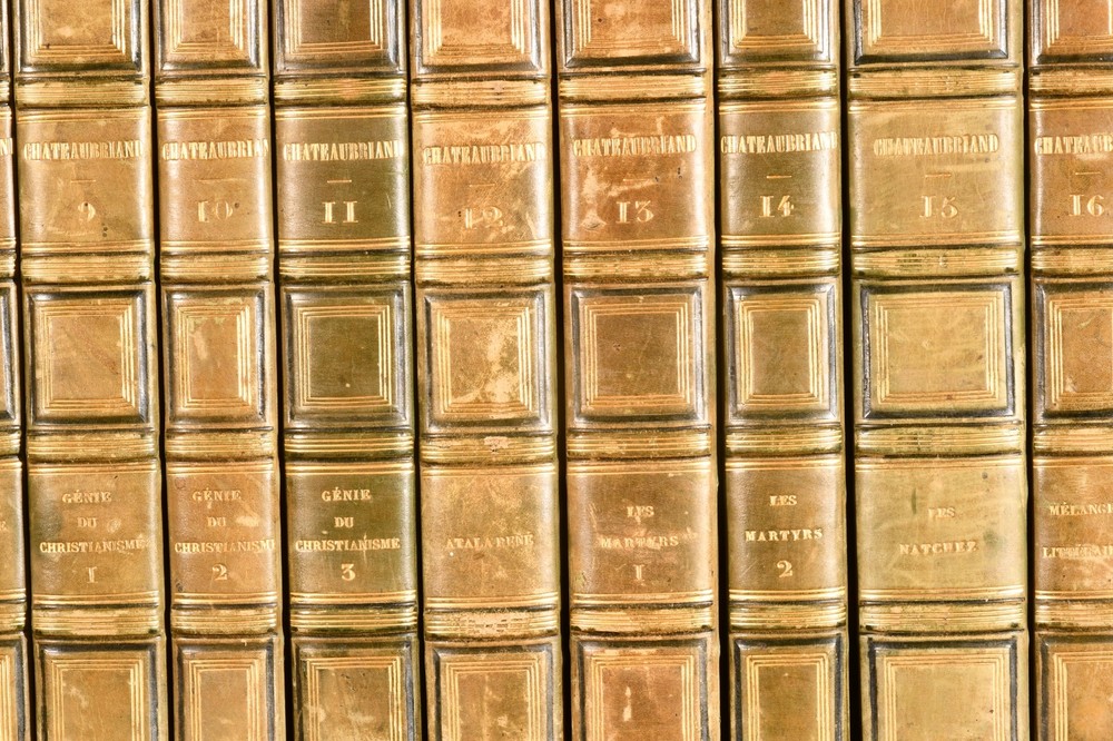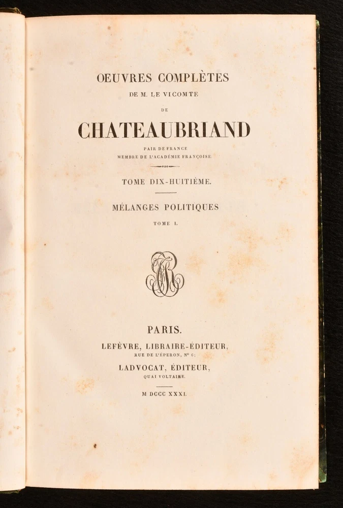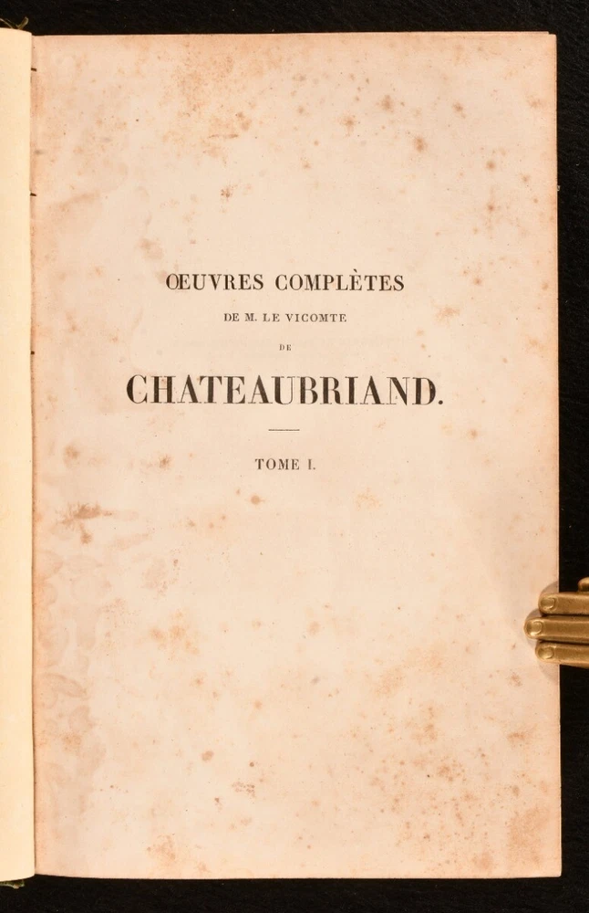 Click here to see our other books! Oeuvres Completes de M. le Vicomte de Chateaubriand François-René, vicomte de Chateaubriand 1830-36 Lefevre : Paris 9" by 5.5" SUMMARY The complete works of François-René in twenty-four uniform bindings, vicomte de Chateaubriand in the original French. Illustrated,Leather Binding,Rebound Overall Condition: Very Good This book weighs 20 KG when packed UK Postage: £ 4.49 US Postage: £ 89.99 EU Postage : £ 45.99 European Postage: £ 85.99 Asia Postage: £ 169.99 Worldwide Postage: £ 259.99 DESCRIPTION An early edition in twenty four volumes of the collected works of François-René, vicomte de Chateaubriand important French author and politician who had a great influence on French literature of the nineteenth century, dominating the literary scene of the time. In the original French. In uniform half calf bindings. Complete with half titles. Comprising his historical essays and studies, travelogues, works on Christianity including his defence of the Catholic faith, novellas, poems, &c. Notably featuring his works 'Les Martyrs' (in two volumes), 'Atala' and 'Rene', celebrated long prose epics, and his exotic novel 'Les Natchez' among others. Comprising: Historical essays, illustrated with a frontispiece to vol. I; Historical miscellanies with two portraits to vol. II; Travelogues in three volumes, with five plates of engravings to vol. VI, eight to vol. VII, one to vol. VIII; 'Genie du Christianism' in three volumes, with one full page plate to vol. IX, one to vol. X, and one to vol. XI; 'Atala' and 'Rene' with his poems, featuring three full page plates to vol. XII; 'Les Martyrs' in two volumes, with two plates to vol XIII, two to vol. XIV; 'Les Natchez' with one full page plate to vol. XV; Miscellaneous literary works; Opinions and speeches; Political miscellanies in two volumes; Argumentative essays; 'Paradise Lost' by Milton translated to French by Chateaubriand in two volumes; Essays on English literature in two volumes. CONDITION In uniform half calf bindings over marbled boards, with four raised bands, gilt tooling and titles to spine. Externally smart with minor shelf wear only, lightly chipped and bumped to head and tail of spine, rubbed to boards and extremities, back strip faded. Sticker to front pastedowns. Internally, firmly bound. Light foxing scattered to leaves. Overall Condition: Very Good GLOSSARY OF TERMS Overall Condition (Dustwrapper condition rating is shown after that for the book itself, where a dustwrapper is present) Fine - Very well preserved copy showing very little wear Very Good Indeed - Only one or two minor faults, really a very attractive copy Very Good - Quite a wide term meaning no major faults but probably several smaller ones often expected given the age of the book, but still a respectable copy Good - Meaning not very good. Some more serious faults as will be described in the condition report under 'condition' Good Only - Meaning one or more faults that could really do with repair Fair - As with good only above but with other faults leaving a compromised copy even after repair Poor - Really bad and possibly seriously incomplete. We only sell books in this condition where their rarity or value makes them attractive none the less. Major defects will be described. GUARANTEE We offer a full money back guarantee on our descriptions. Please ask for details and conditions. We prefer PAYPAL. If you pay via PAYPAL we will post the item off the same or the next working day with the postage you have selected. Please note we cannot accept USD cheques