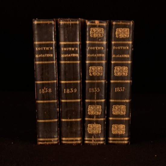Click here to see our other books! The Youth's Magazine or Evangelical Miscellany Anonymous 1835-1839 Hamilton Adams and Co. : London 7" by 4.5" 432; 432; 432; 432pp SUMMARY A four volume set of this popular magazine for young people, 'The Youth's Magazine or Evangelical Miscellany', in leather binding. Illustrated Overall Condition: Good This book weighs 2 KG when packed UK Postage: £ 3.99 US Postage: £ 29.99 EU Postage : £ 21.99 European Postage: £ 23.99 Asia Postage: £ 37.99 Worldwide Postage: £ 38.99 DESCRIPTION Comprising volumes: Vol VIII Third Series (1835), Vol X Third Series (1837), Vol I Fourth Series (1838), Vol II Fourth Series (1839). A magazine designed for young people with short stories, bible passages, poems, songs and informational pieces Most articles with a Christian spiritual or moral message, others educational and covering a variety of subjects including architecture, geography, history and other cultures. . Illustrated throughout with plates, maps and wood-cuts. CONDITION In half calf bindings. Externally, sound with some rubbing and bumping. Joints starting but still reasonably firm. Ink inscription to front free-endpaper of 1837 with loss to rear endpaper. Internally, generally firmly bound. Pages generally bright with patches of spotting. Pages slightly cockled to all volumes with tidemarks to 1838. Loss to frontispiece of 1837. Overall Condition: Good GLOSSARY OF TERMS Overall Condition (Dustwrapper condition rating is shown after that for the book itself, where a dustwrapper is present) Fine - Very well preserved copy showing very little wear Very Good Indeed - Only one or two minor faults, really a very attractive copy Very Good - Quite a wide term meaning no major faults but probably several smaller ones often expected given the age of the book, but still a respectable copy Good - Meaning not very good. Some more serious faults as will be described in the condition report under 'condition' Good Only - Meaning one or more faults that could really do with repair Fair - As with good only above but with other faults leaving a compromised copy even after repair Poor - Really bad and possibly seriously incomplete. We only sell books in this condition where their rarity or value makes them attractive none the less. Major defects will be described. GUARANTEE We offer a full money back guarantee on our descriptions. Please ask for details and conditions. We prefer PAYPAL. If you pay via PAYPAL we will post the item off the same or the next working day with the postage you have selected. Please note we cannot accept USD cheques
