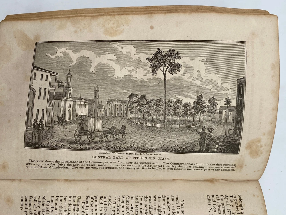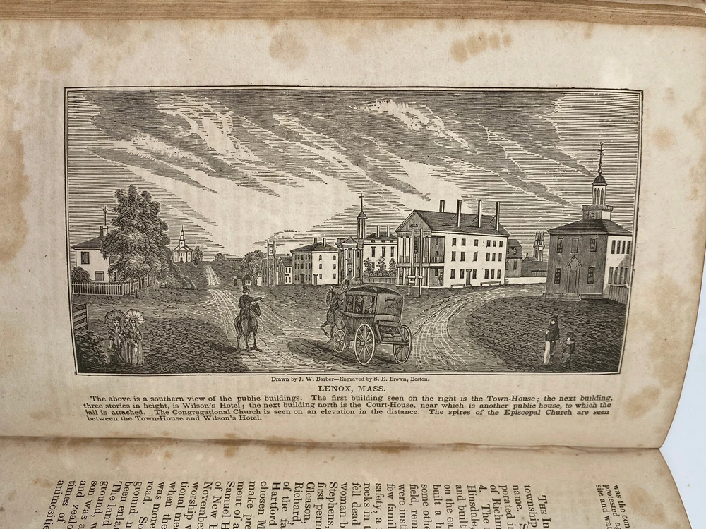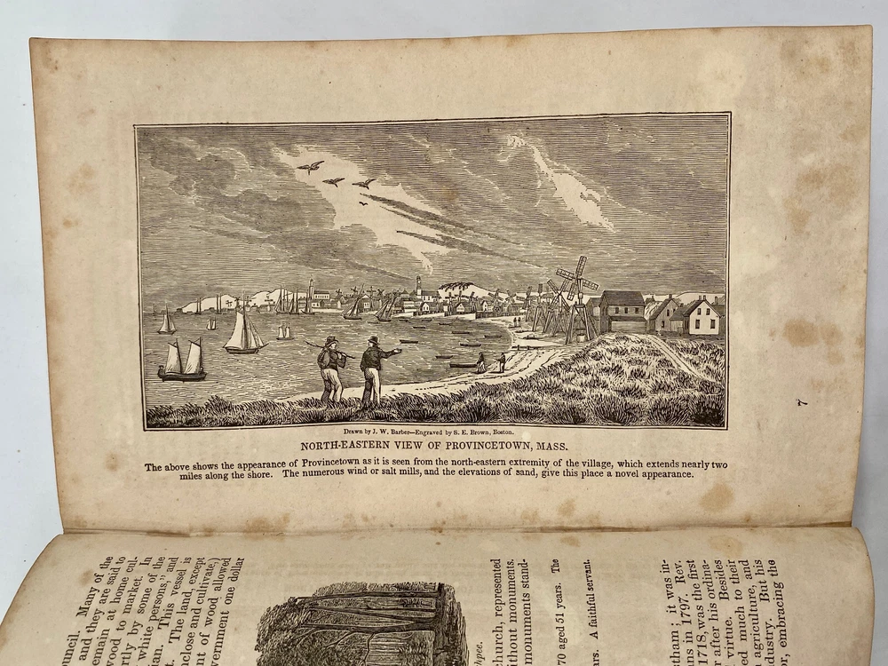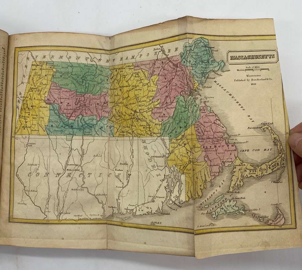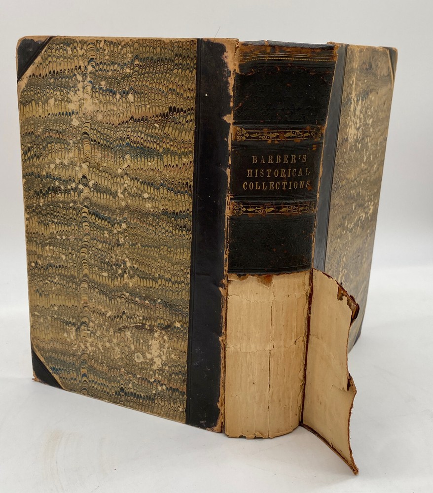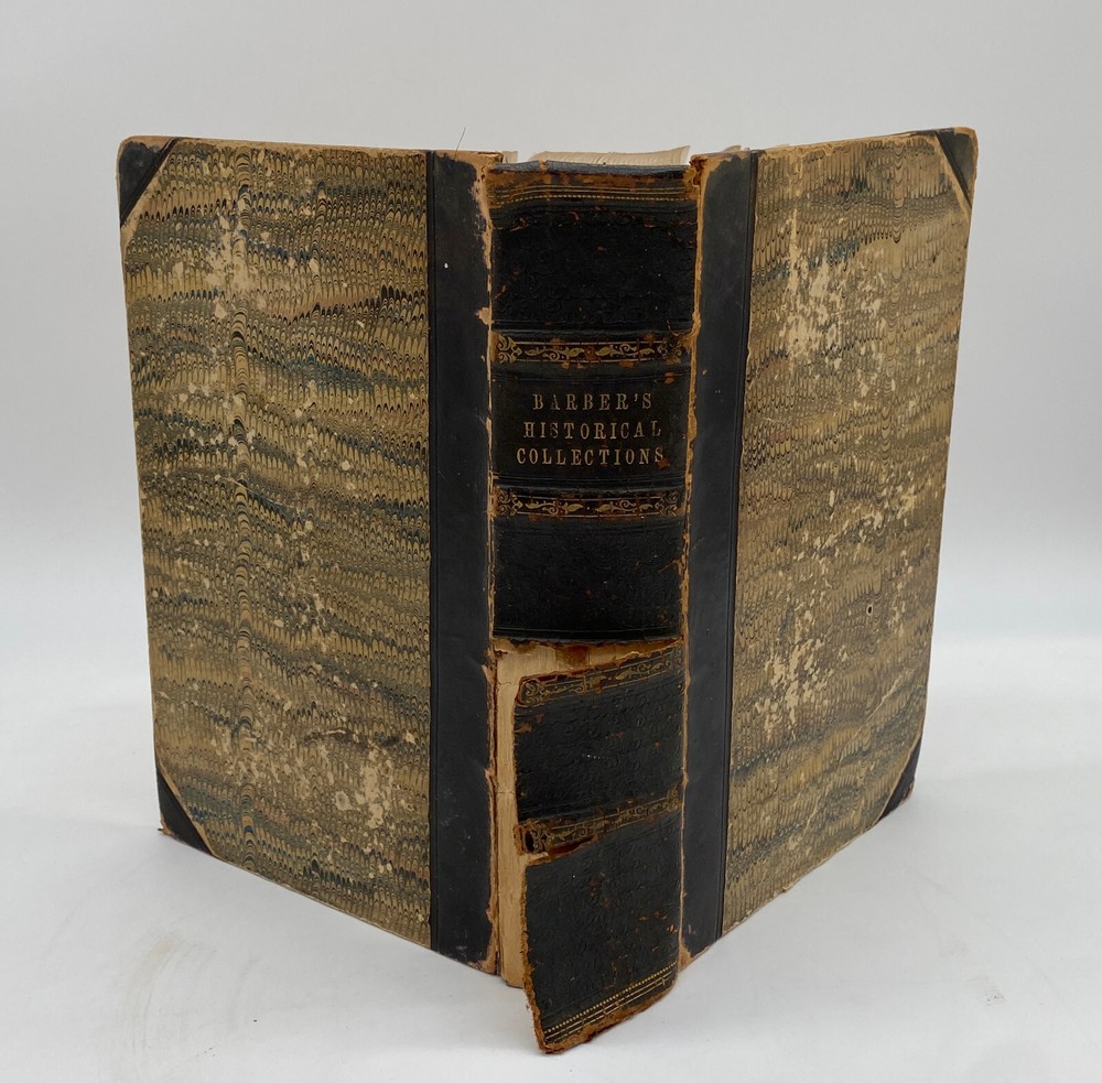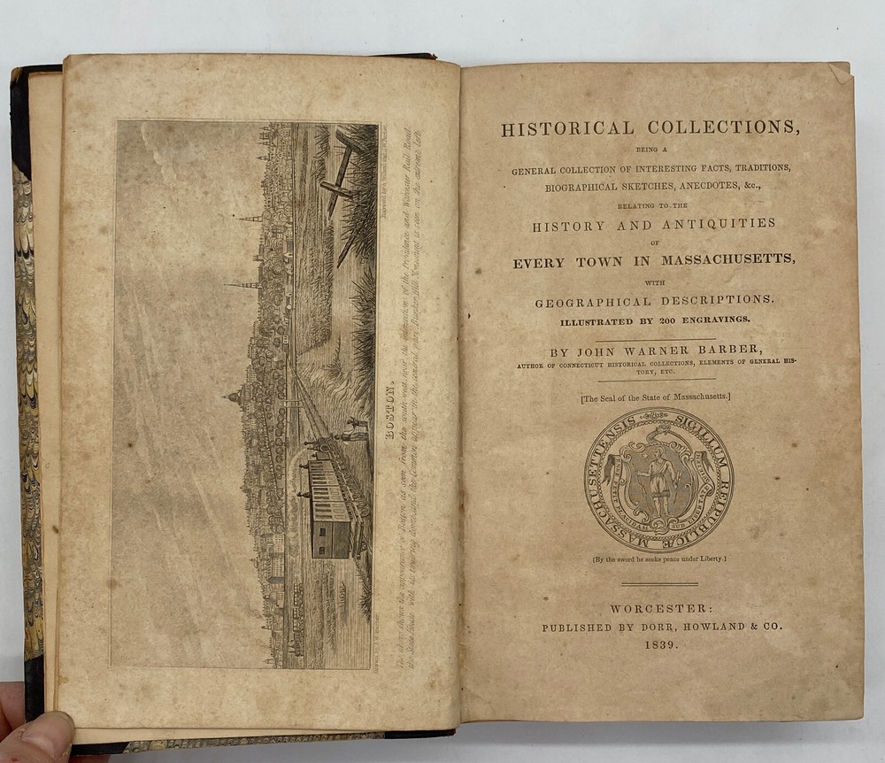 Historical Collections by John Warner Barber. First edition published in Worcester by Dorr, Howland & Co., 1839. Illustrated with 200 engravings and a color fold-out map of Massachusetts. Subtitled: Being a general collection of interesting facts, traditions, biographical sketches, anecdotes, &c., relating to the history and antiquities of every town in Massachusetts, with geographical descriptions. Very good condition but for leather lifting away from the spine at top and bottom. Foldout map is reinforced on the back, and missing just the border on one corner, apparently the paper was cut wrong originally. Paper is tanned and foxed from age. (B3C)