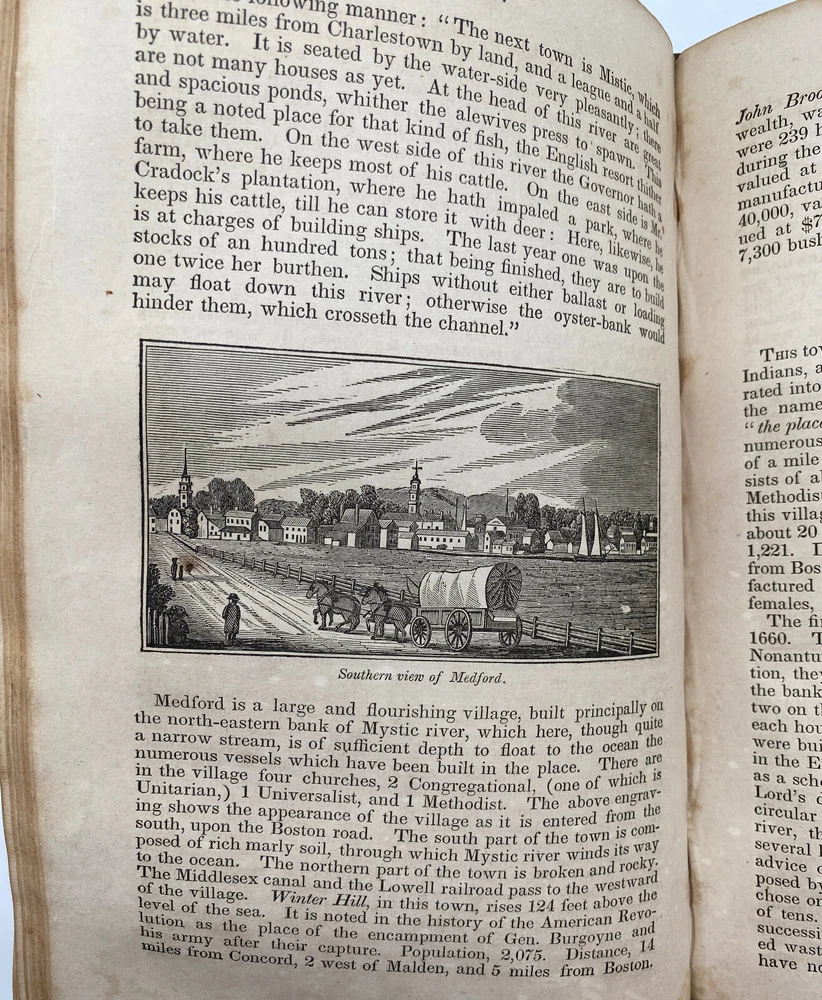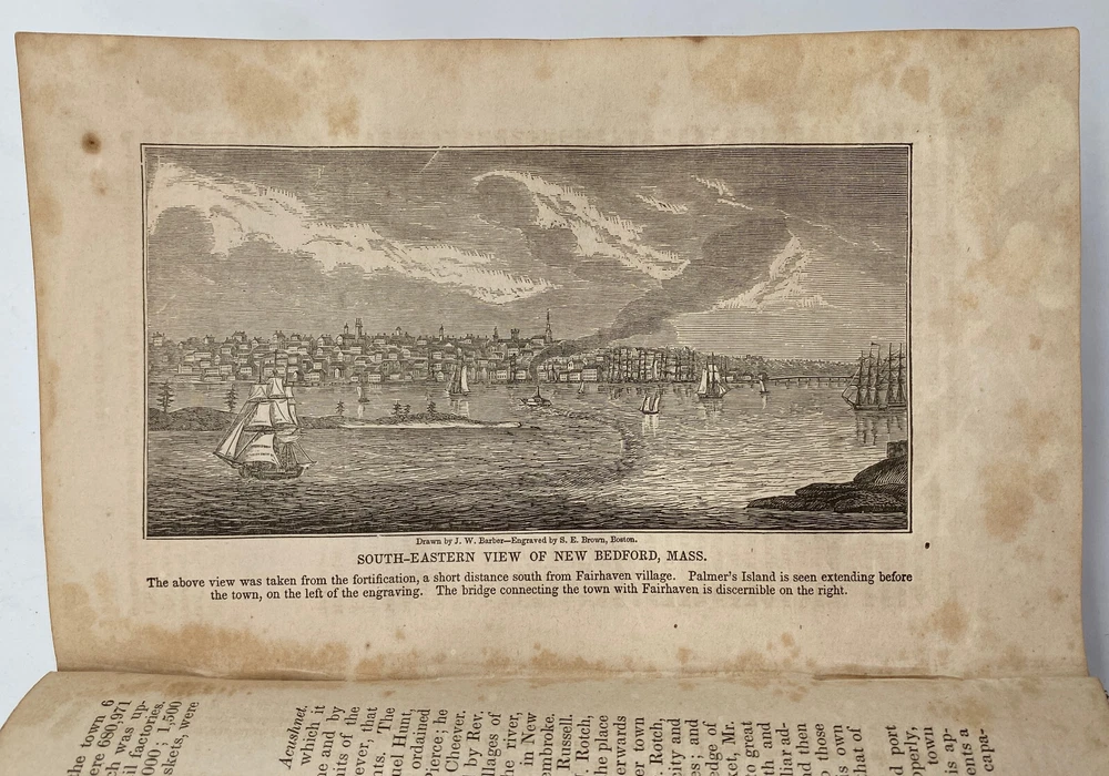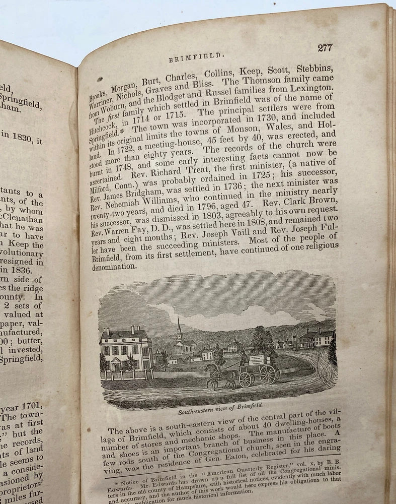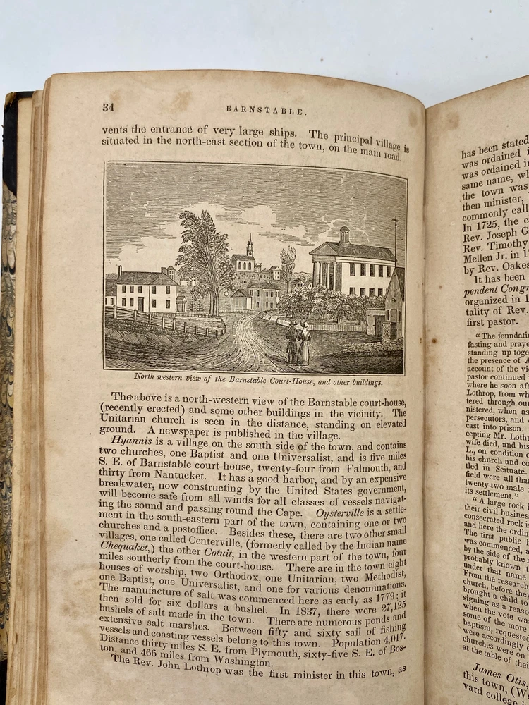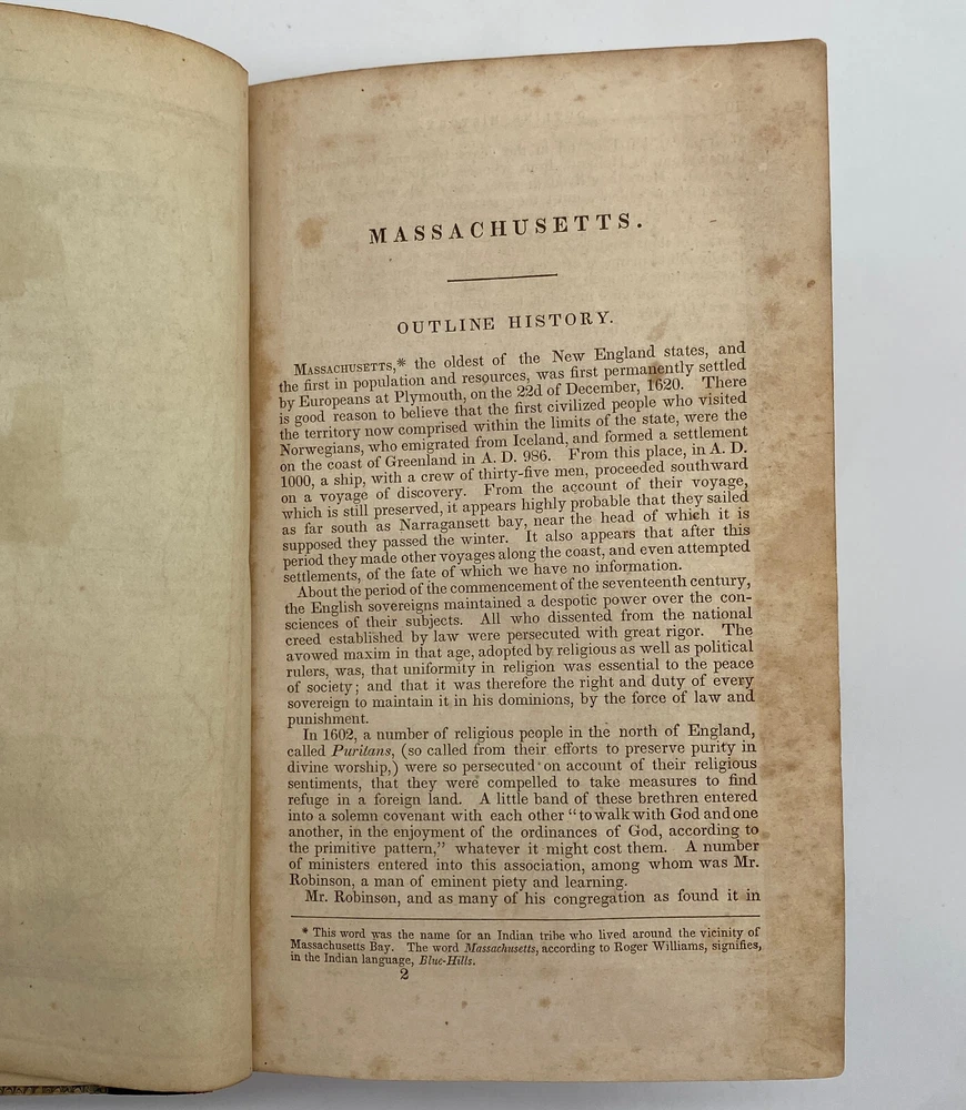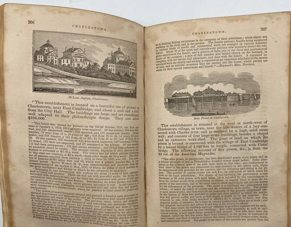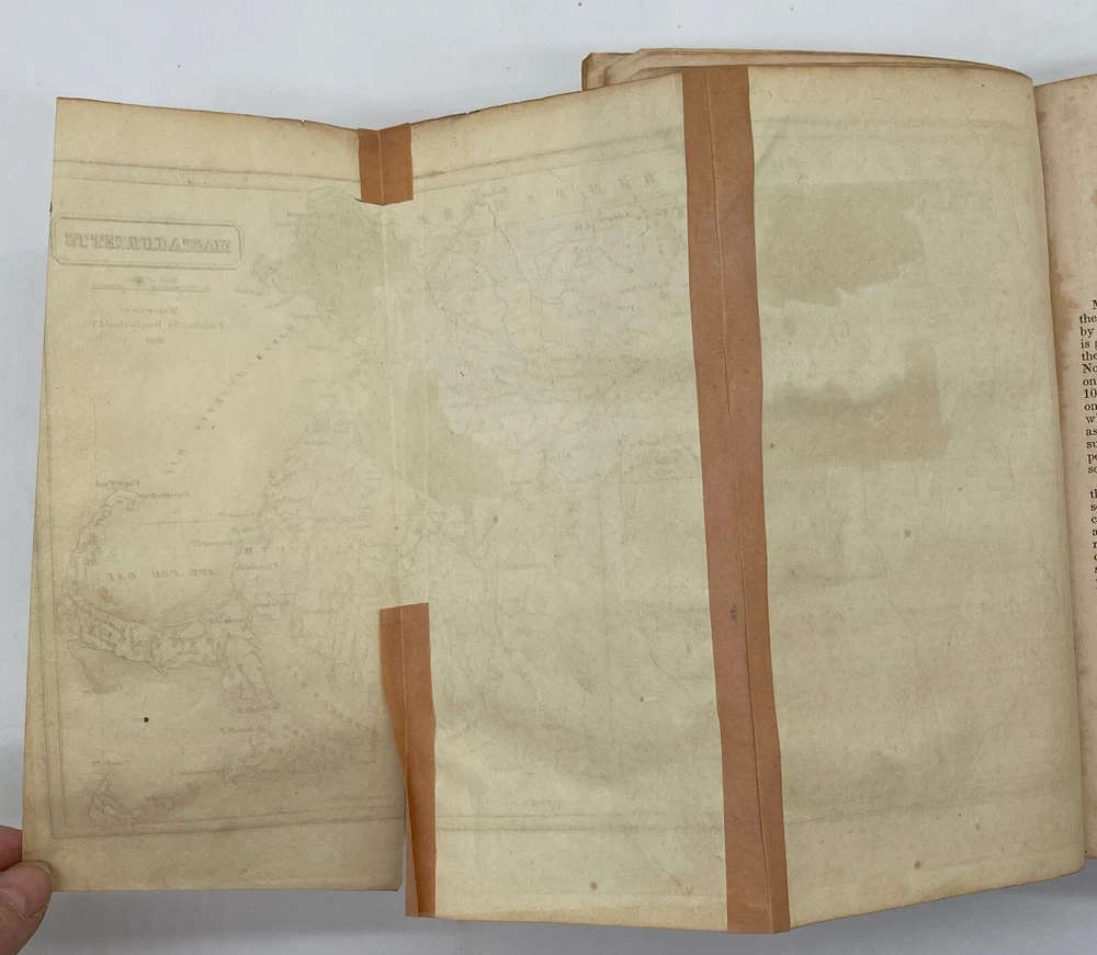 Historical Collections by John Warner Barber. First edition published in Worcester by Dorr, Howland & Co., 1839. Illustrated with 200 engravings and a color fold-out map of Massachusetts. Subtitled: Being a general collection of interesting facts, traditions, biographical sketches, anecdotes, &c., relating to the history and antiquities of every town in Massachusetts, with geographical descriptions. Very good condition but for leather lifting away from the spine at top and bottom. Foldout map is reinforced on the back, and missing just the border on one corner, apparently the paper was cut wrong originally. Paper is tanned and foxed from age. (B3C)