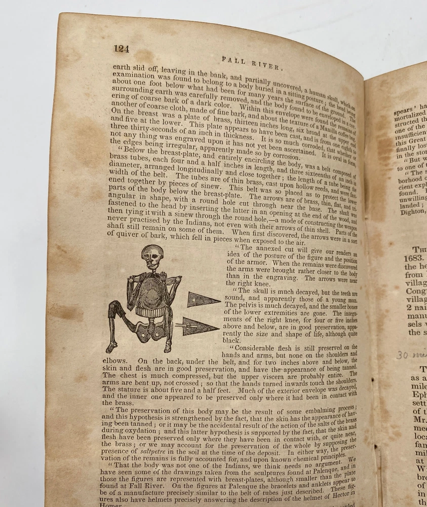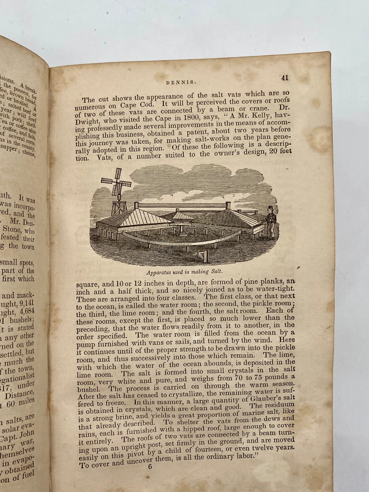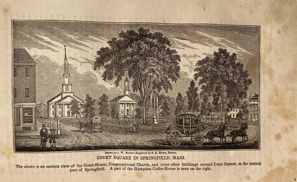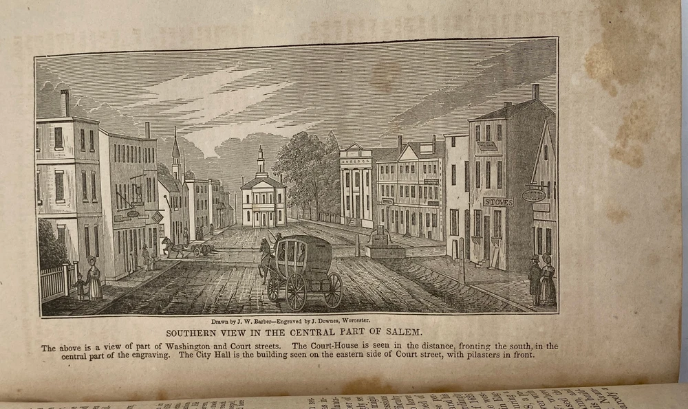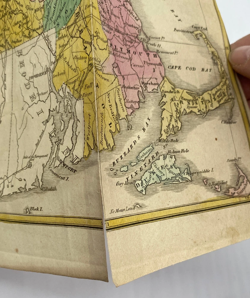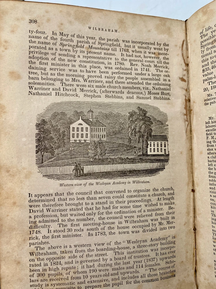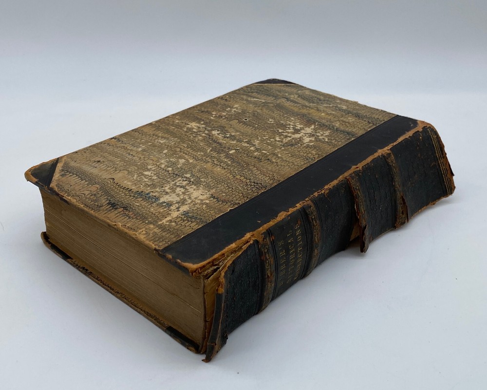 Historical Collections by John Warner Barber. First edition published in Worcester by Dorr, Howland & Co., 1839. Illustrated with 200 engravings and a color fold-out map of Massachusetts. Subtitled: Being a general collection of interesting facts, traditions, biographical sketches, anecdotes, &c., relating to the history and antiquities of every town in Massachusetts, with geographical descriptions. Very good condition but for leather lifting away from the spine at top and bottom. Foldout map is reinforced on the back, and missing just the border on one corner, apparently the paper was cut wrong originally. Paper is tanned and foxed from age. (B3C)