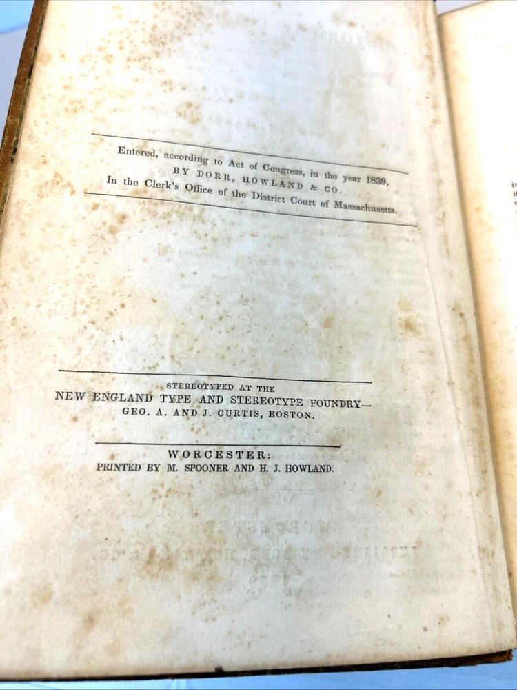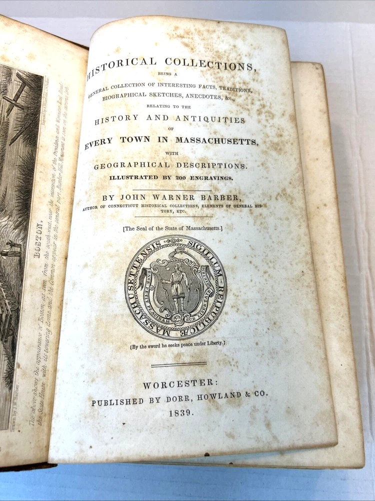 Historical Collections Being A General Collection of Interesting Facts, Traditions, Biographical Sketches, Anecdotes, etc. Relating To The History and Antiquities of Every Town In Massachusetts With Geographical Descriptions. Illustrated By 200 Engravings with Hand-Colored Massachusetts Map By John Warner Barber Worcester: Published by Dorr, Howland & Co. 1839 5 1/2'' by 9" 624 Pages I have been an eBay seller since 2000, and a collector/treasure hunter since I was in elementary school. I love being able to rescue items that were destined for the trash heap and find new homes for them with people who will appreciate them. All reasonable offers will be considered! I do my best to describe my items as accurately as possible, but may miss details or make mistakes from time to time. However, if you are unsatisfied for any reason, please reach out to me so I can work to make things right. Thank you for your interest! 100% satisfaction guarantee or receive a quick refund 20% of the sale of this item will be donated to a youth-serving organization WS 53.2