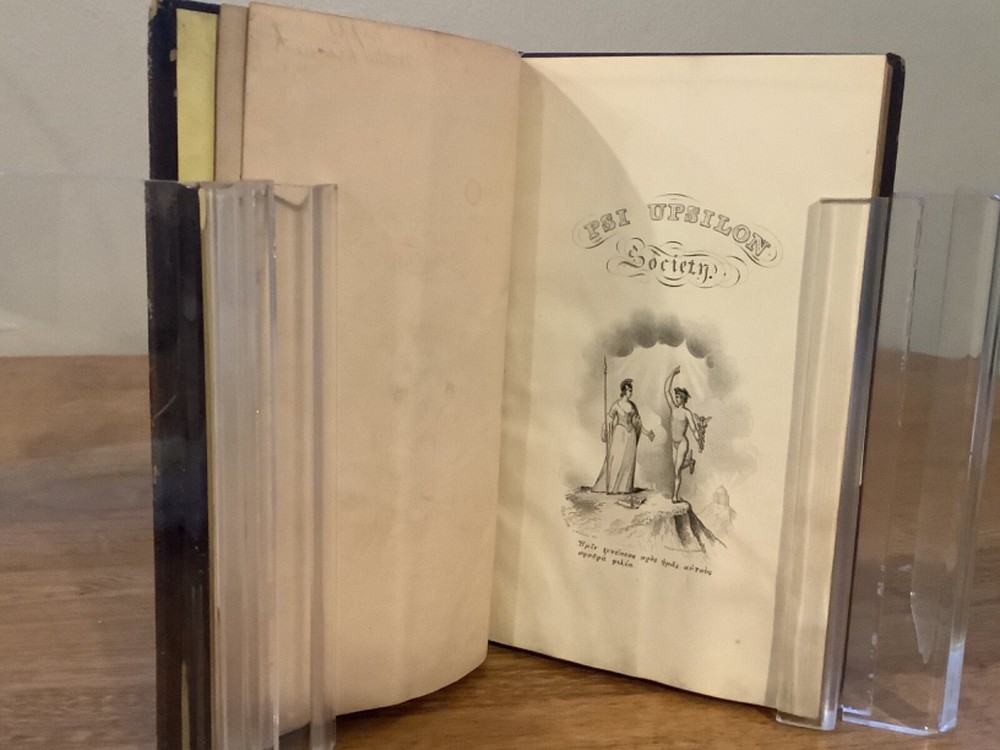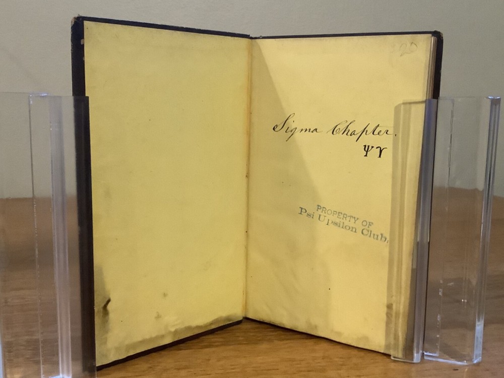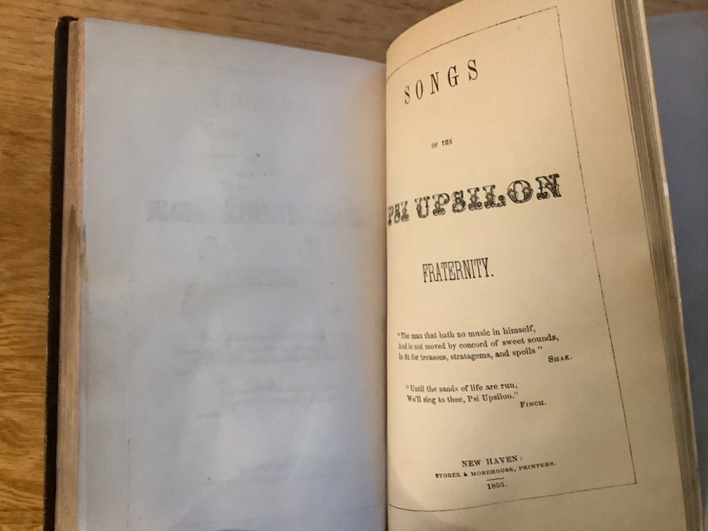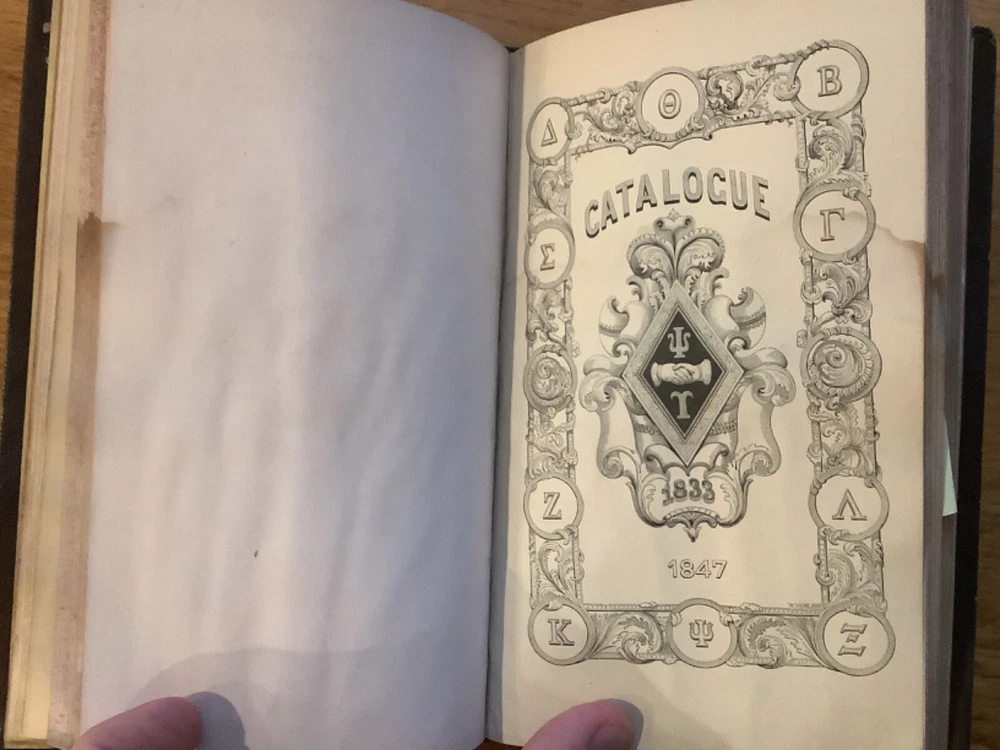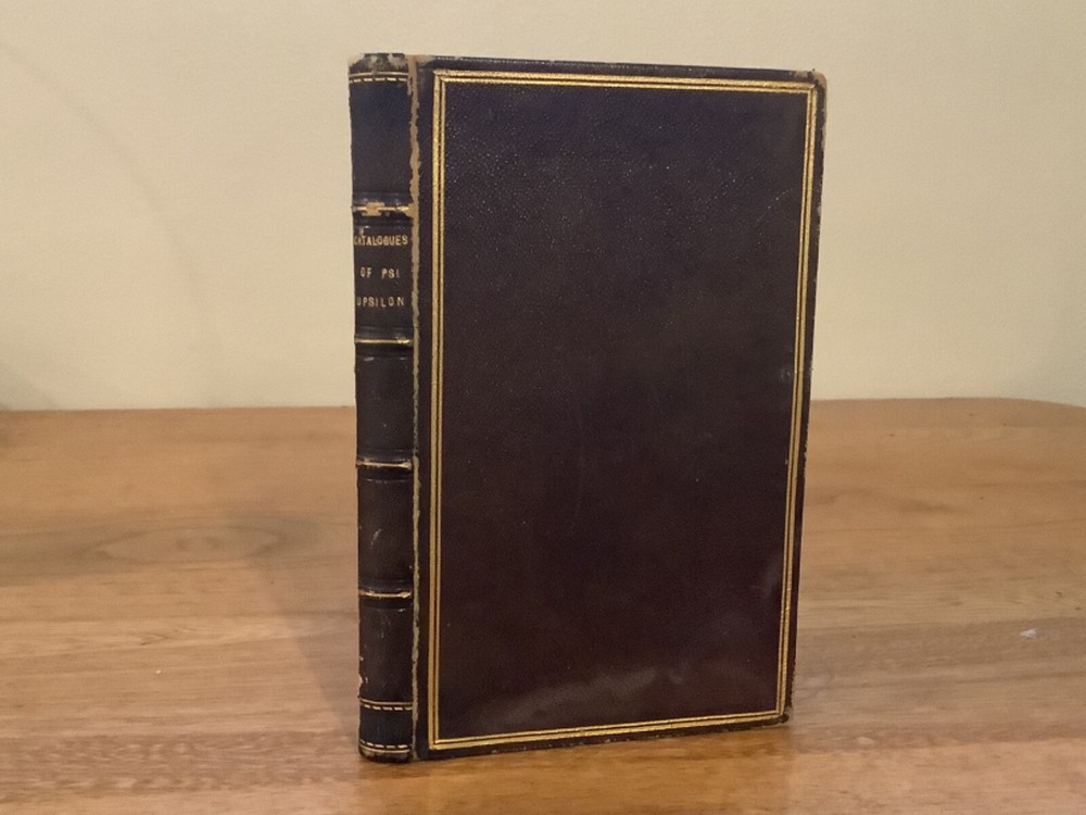 Bound collection of three Catalogues of Members of Psi Upsilon for 1842, 1844, and 1847, and the 1853 Songs of the Psi Upsilon Fraternity. Bound sometime in the mid-late 19th Century into a larger leather volume. 7.5 x 4.75”. In fair condition, with rubbing and wear to boards and spine. Staining and wear from water to bottom half of boards and pages. Occasional marginalia and markings, including an indication that the book once belonged to the Brown University Sigma chapter. Decorative title pages to each. General age-related toning to pages, along with periodic foxing and wear. Please see photographs and ask any questions prior to purchasing. An extremely scarce collection of early catalogues from the Psi Upsilon fraternity, showing membership to its original chapters. The fraternity, founded in 1833, is especially active and prominent in more esteemed universities. FORN-ABE-MSB-0623-Shelf-702-aj0170
