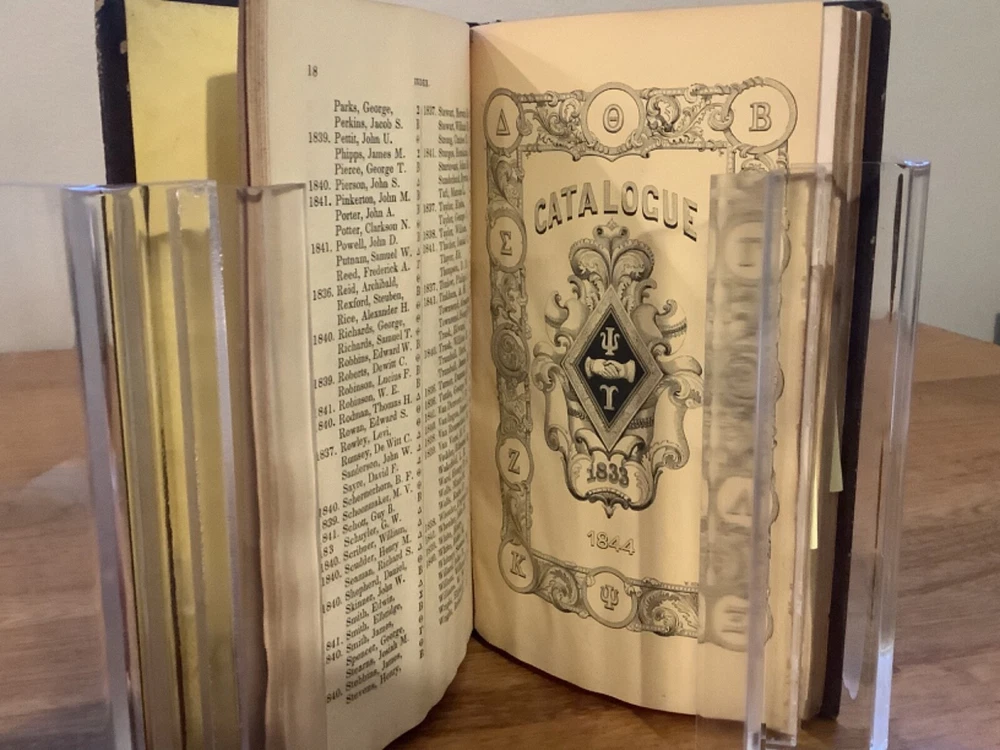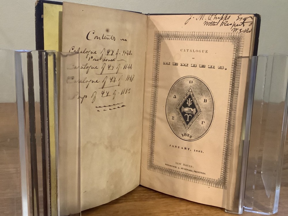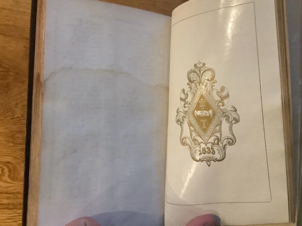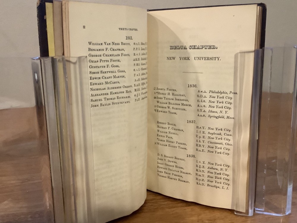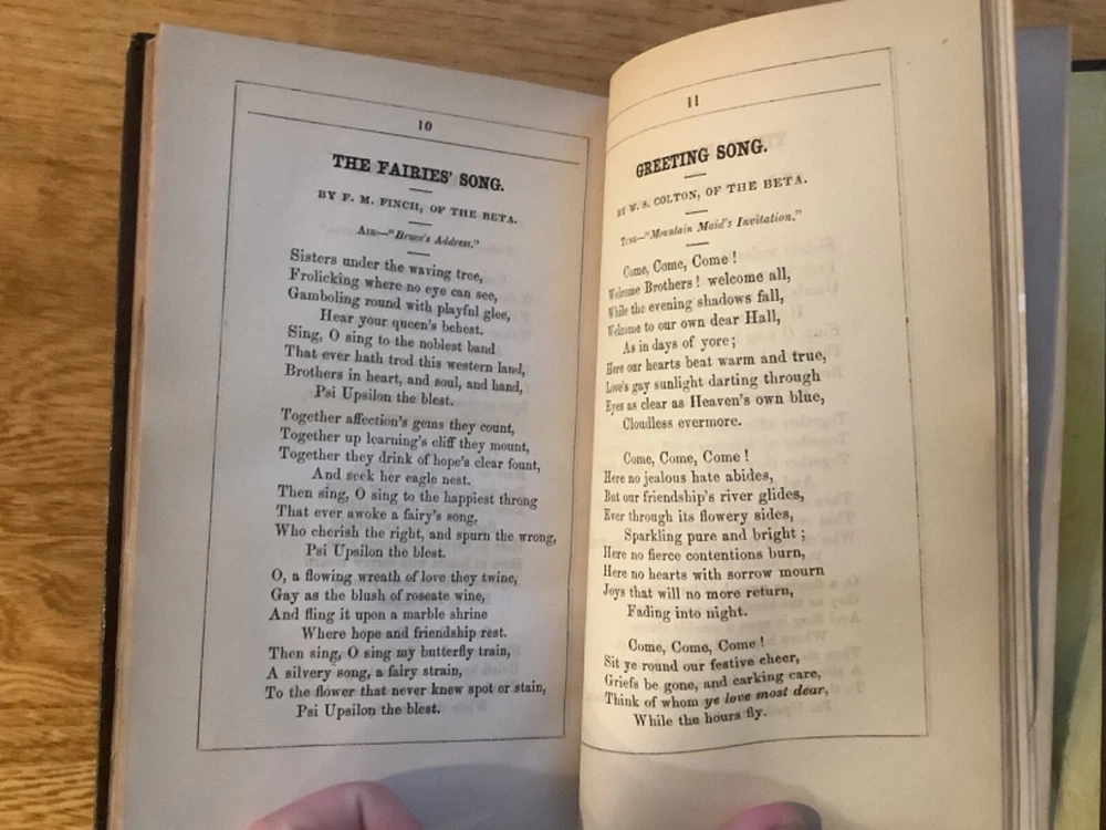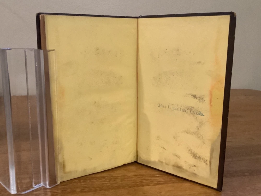 Bound collection of three Catalogues of Members of Psi Upsilon for 1842, 1844, and 1847, and the 1853 Songs of the Psi Upsilon Fraternity. Bound sometime in the mid-late 19th Century into a larger leather volume. 7.5 x 4.75”. In fair condition, with rubbing and wear to boards and spine. Staining and wear from water to bottom half of boards and pages. Occasional marginalia and markings, including an indication that the book once belonged to the Brown University Sigma chapter. Decorative title pages to each. General age-related toning to pages, along with periodic foxing and wear. Please see photographs and ask any questions prior to purchasing. An extremely scarce collection of early catalogues from the Psi Upsilon fraternity, showing membership to its original chapters. The fraternity, founded in 1833, is especially active and prominent in more esteemed universities. FORN-ABE-MSB-0623-Shelf-702-aj0170