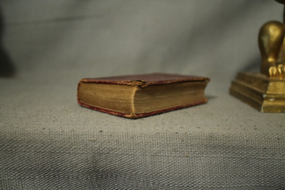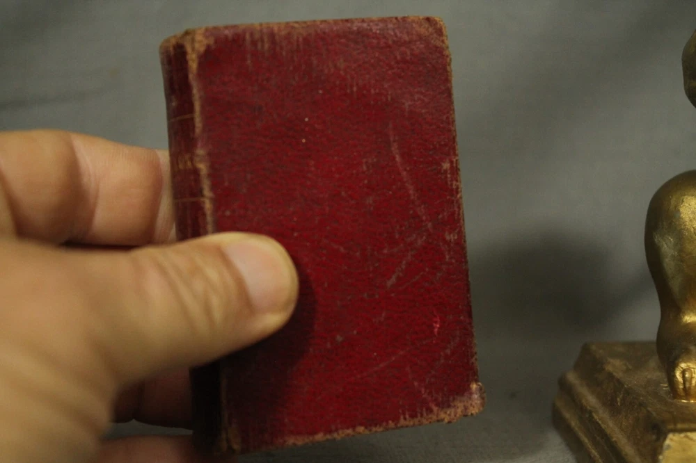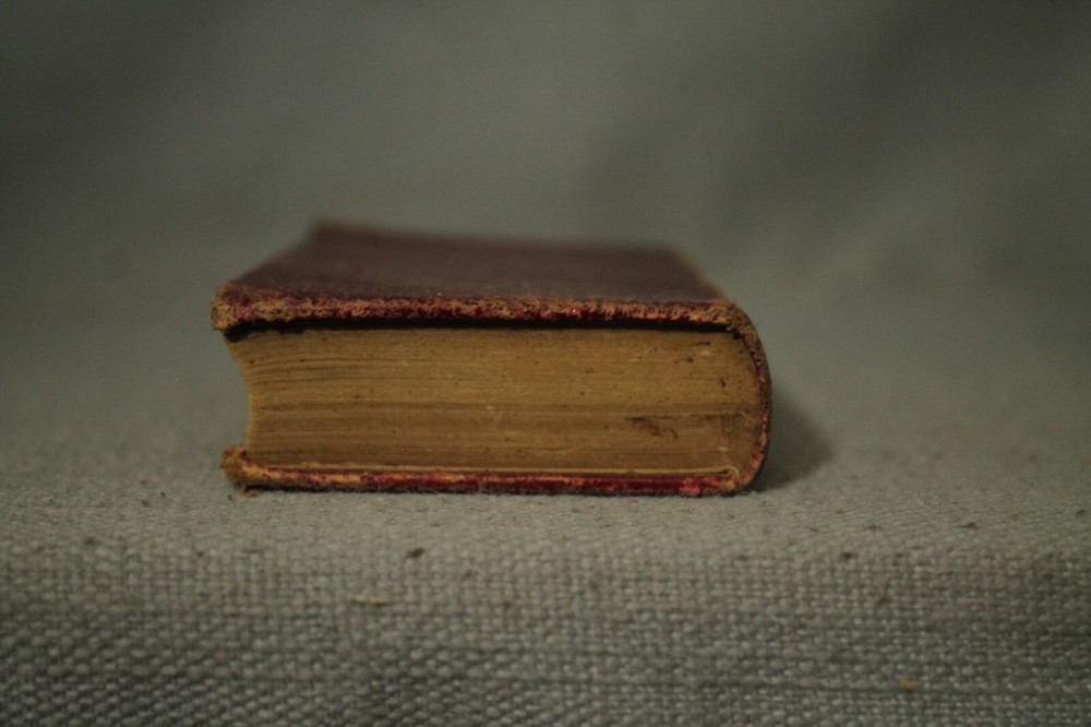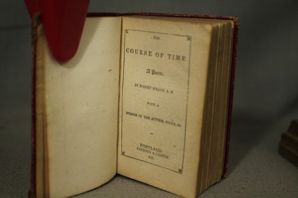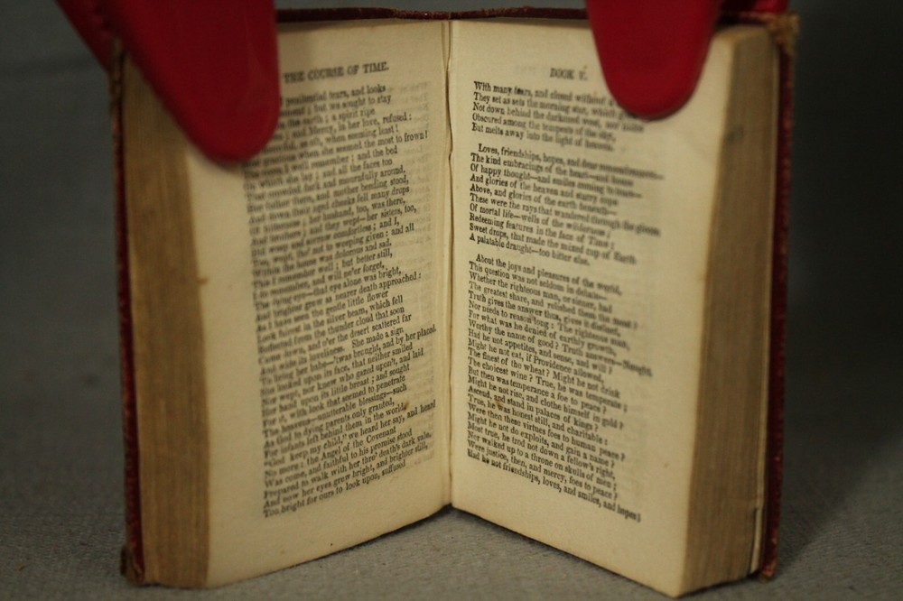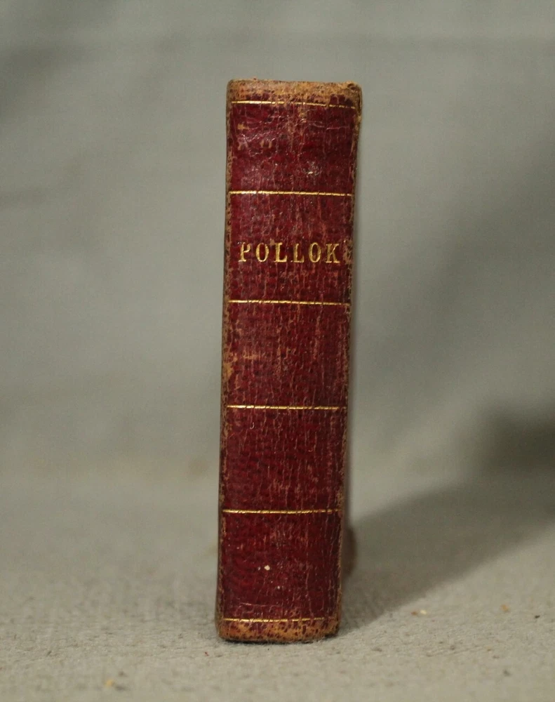 The Course of Time a poem by Robert Pollok, with a memoir of the author, index. published by Sandborn & Carter , Portland, 1846 cute little book measures 3 3/8" by 2 1/4" red leather cover has wear, edge wear, bumped/worn corners, rubbing, scuffing. front endpapers cracked some, spots on endpapers. 276 pages overall very good/clean with light age toning, a few folded corners, two pages have about 1" round light yellow spot. Robert Pollok (1798-1827). Scottish Poet. please look at the photographs loc. built in fourth section., y