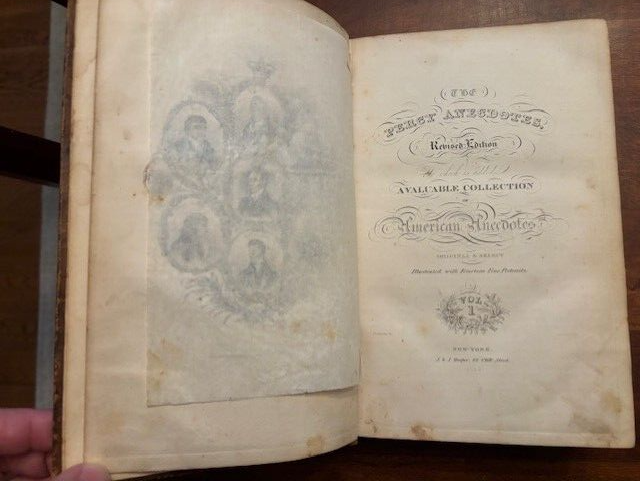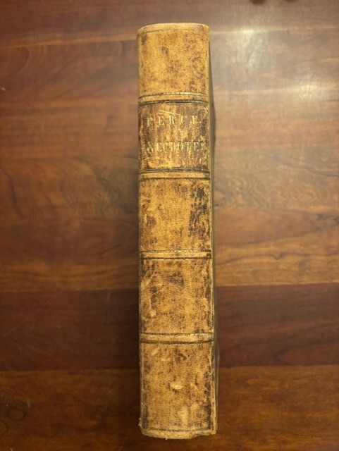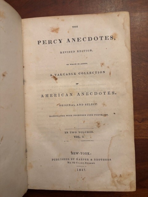 PERCY ANECDOTES. A VALUABLE COLLECTION OF AMERICAN ANECDOTES. VOLS. I & II. Published by J & J Harper, New York, 1847 (1st printing 1834). Hardcover in full calf leather; two volumes bound into one, 6" X 9.5”, Volume I, 400 pp.; Volume II, 240 pp. I've done my best to describe the book, but if you have additional questions, please don't hesitate to send me an e-mail.
