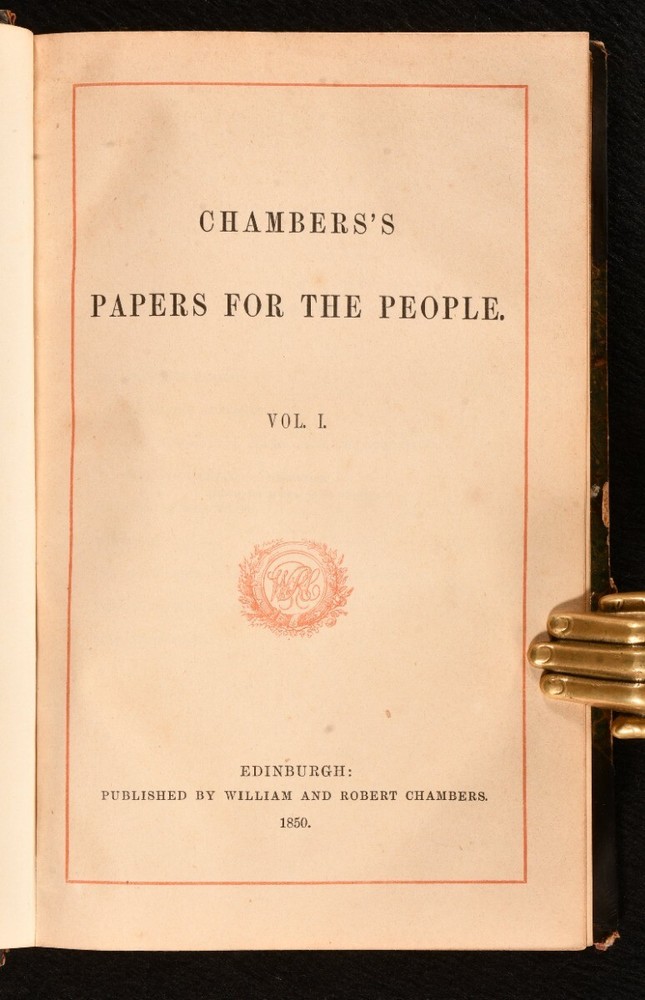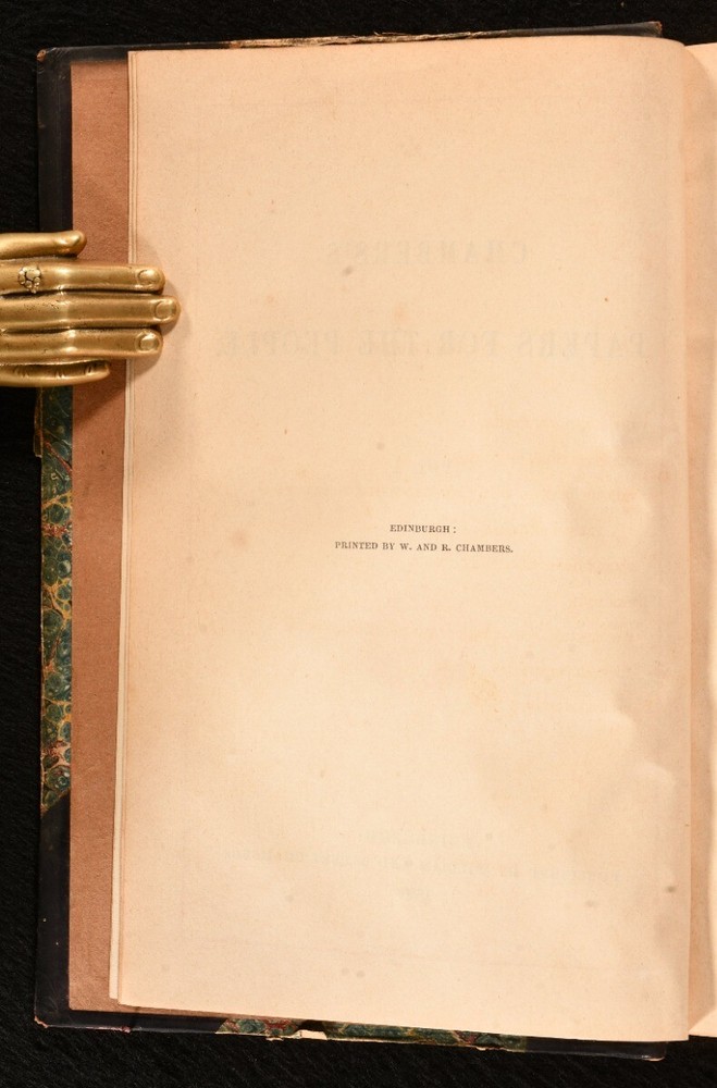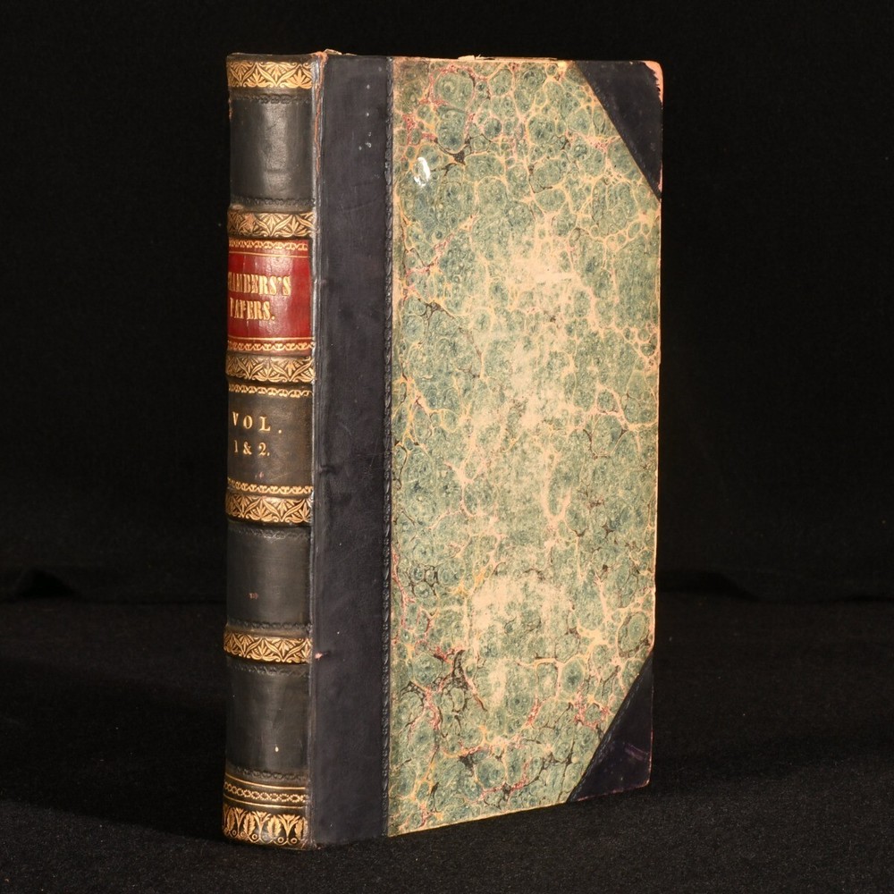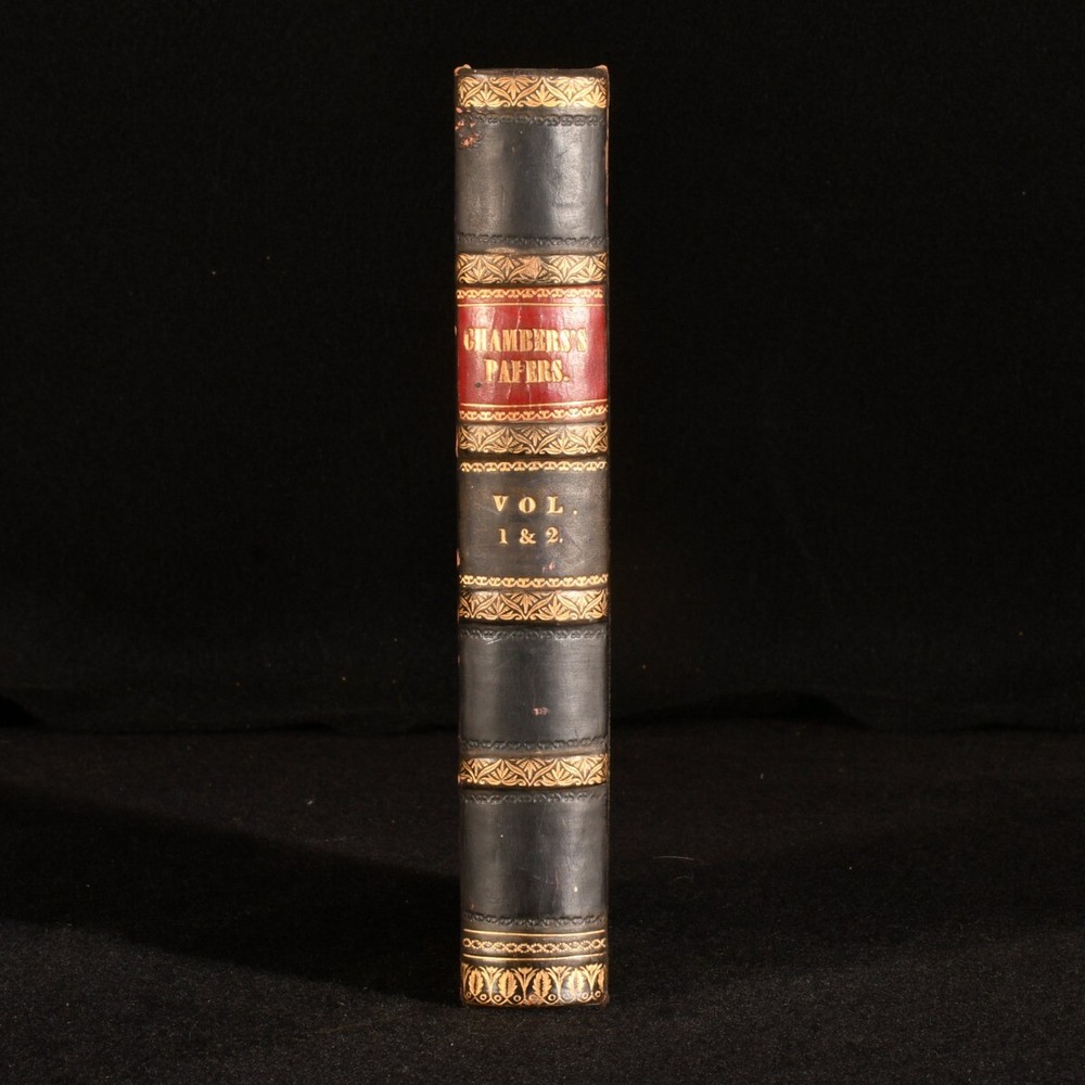 Click here to see our other books! Chambers's Papers for the People Not Stated 1850 William and Robert Chambers : London 7.5" by 5" SUMMARY Containing volumes I and II of the scarce periodical 'Chambers's Paper for the People.' First Edition,Leather Binding,Pleasing Copy,Rebound Overall Condition: Very Good This book weighs 0.75 KG when packed UK Postage: £ 3.99 US Postage: £ 19.99 EU Postage : £ 15.99 European Postage: £ 16.99 Asia Postage: £ 21.99 Worldwide Postage: £ 25.99 DESCRIPTION Volumes I and II of the scarce periodical published by the Chambers brothers between 1850 and 1856. William and Robert Chambers were Scottish publishers and authors, both popular and influential in mid-19th-century scientific and political circles. They are mainly known for their extensive work 'Chambers's Encyclopaedia.' Containing sixteen articles and essays, each with unique pagination. Volume I: The Bonaparte Family; The Sepulchres of Etruria; Valerie Duclos; Education of the Citizen; The Myth; The Sunken Rock; Popular Cultivation of Music; Ebenezer Elliot. Volume II: The Sanitary Movement; Washington and His Contemporaries; Edmund Atherton; Memorabilia of the Seventeenth Century in Britain; Ruined Cities of Central America; The Ivory Mine; Secret Societies of Modern Europe; Francis Jeffrey. CONDITION Rebound in half calf over marbled boards, titles in gilt to morocco spine label. Externally sound with some shelf wear, rubbed and lightly scuffed to extremities of boards and spine. Internally, firmly bound. Odd light spotting to occasional leaf, pages otherwise generally bright and clean. Overall Condition: Very Good GLOSSARY OF TERMS Overall Condition (Dustwrapper condition rating is shown after that for the book itself, where a dustwrapper is present) Fine - Very well preserved copy showing very little wear Very Good Indeed - Only one or two minor faults, really a very attractive copy Very Good - Quite a wide term meaning no major faults but probably several smaller ones often expected given the age of the book, but still a respectable copy Good - Meaning not very good. Some more serious faults as will be described in the condition report under 'condition' Good Only - Meaning one or more faults that could really do with repair Fair - As with good only above but with other faults leaving a compromised copy even after repair Poor - Really bad and possibly seriously incomplete. We only sell books in this condition where their rarity or value makes them attractive none the less. Major defects will be described. GUARANTEE We offer a full money back guarantee on our descriptions. Please ask for details and conditions. We prefer PAYPAL. If you pay via PAYPAL we will post the item off the same or the next working day with the postage you have selected. Please note we cannot accept USD cheques