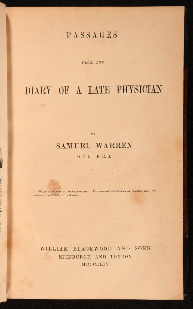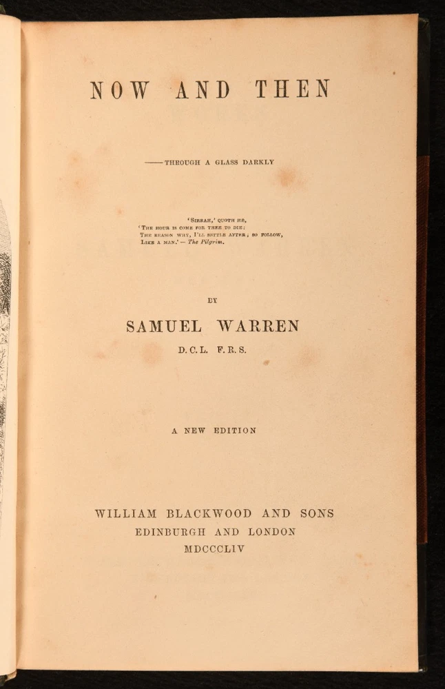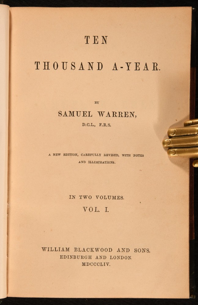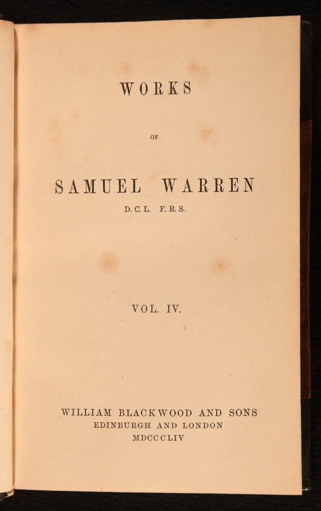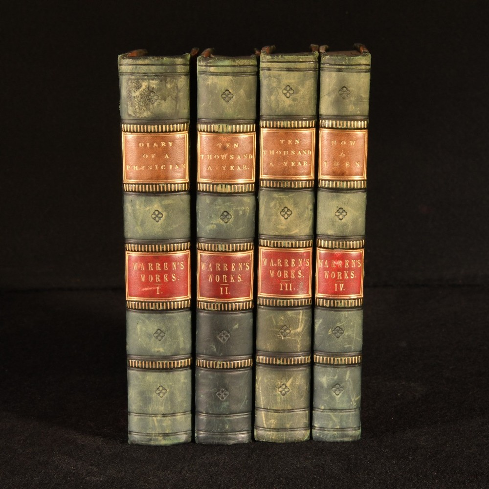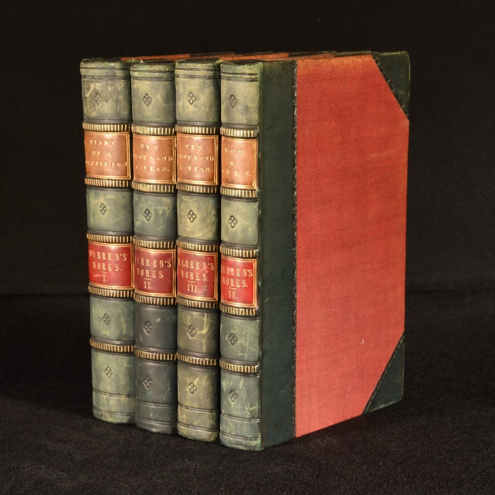 Click here to see our other books! Works of Samuel Warren Samuel Warren 1854 William Blackwood and Sons : Edinburgh 1854 1854 SUMMARY Four volumes complete set of novels by Samuel Warren, including his social and satirical novels, in a uniform half calf binding. Illustrated,Leather Binding,Original Binding Overall Condition: Very Good This book weighs 2 KG when packed UK Postage: £ 3.99 US Postage: £ 29.99 EU Postage : £ 21.99 European Postage: £ 23.99 Asia Postage: £ 37.99 Worldwide Postage: £ 38.99 DESCRIPTION A four volume, complete set. Illustrated with monochrome frontispieces. Bound in half calf with cloth to the boards. This set features a collection of works written by Samuel Warren, British barrister, MP, and novelist. The set includes 'Passaged from the Diary of a Late Physician', a series of tales about fictional case histories, 'Now & Then' a social novel, and 'Ten Thousand A-Year', a social satirical novel. CONDITION Bound in half calf with cloth to the boards. Externally very smart with fading to the spines, slight rubbing to the extremities and joints, and the odd mark to the boards. Spotting to the endpapers. Internally firmly bound with only the slightest age toning with spotting, heavier to the front and rears. Overall Condition: Very Good GLOSSARY OF TERMS Overall Condition (Dustwrapper condition rating is shown after that for the book itself, where a dustwrapper is present) Fine - Very well preserved copy showing very little wear Very Good Indeed - Only one or two minor faults, really a very attractive copy Very Good - Quite a wide term meaning no major faults but probably several smaller ones often expected given the age of the book, but still a respectable copy Good - Meaning not very good. Some more serious faults as will be described in the condition report under 'condition' Good Only - Meaning one or more faults that could really do with repair Fair - As with good only above but with other faults leaving a compromised copy even after repair Poor - Really bad and possibly seriously incomplete. We only sell books in this condition where their rarity or value makes them attractive none the less. Major defects will be described. GUARANTEE We offer a full money back guarantee on our descriptions. Please ask for details and conditions. We prefer PAYPAL. If you pay via PAYPAL we will post the item off the same or the next working day with the postage you have selected. Please note we cannot accept USD cheques