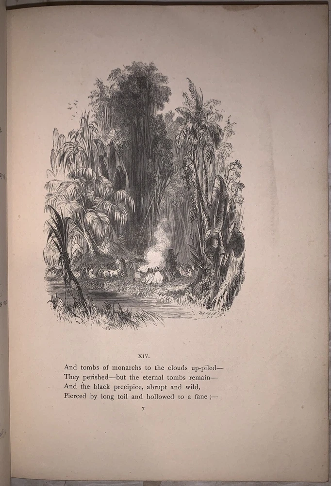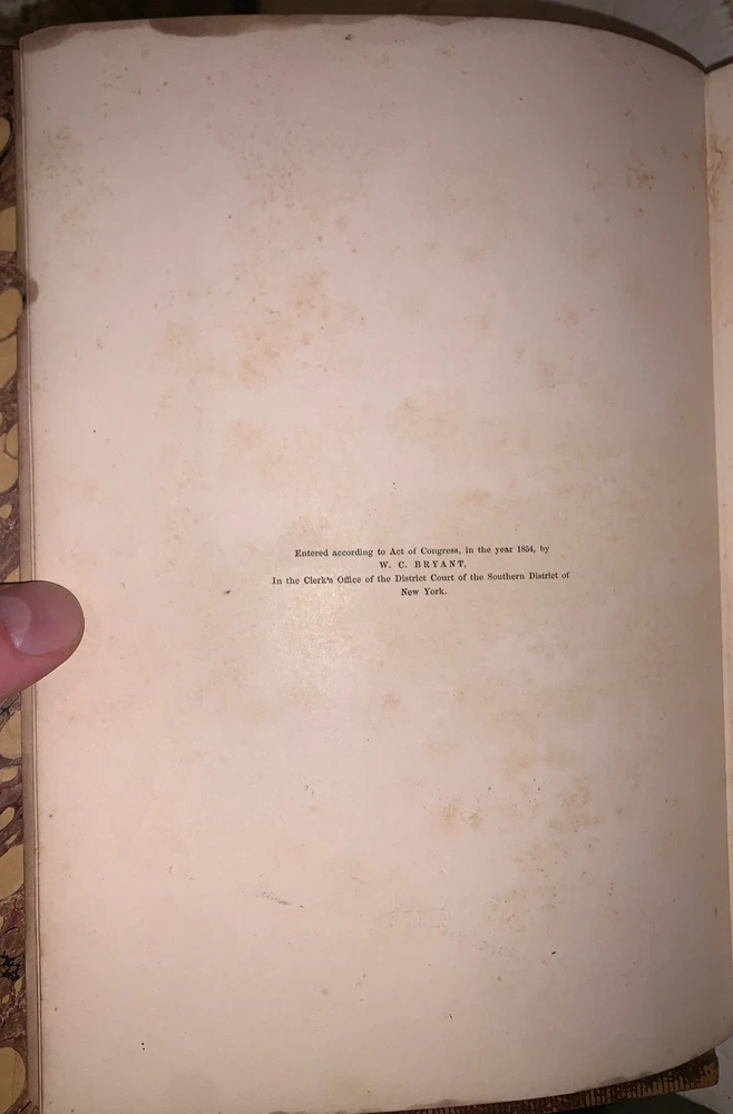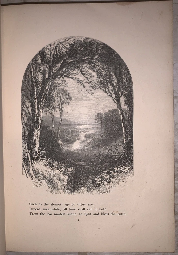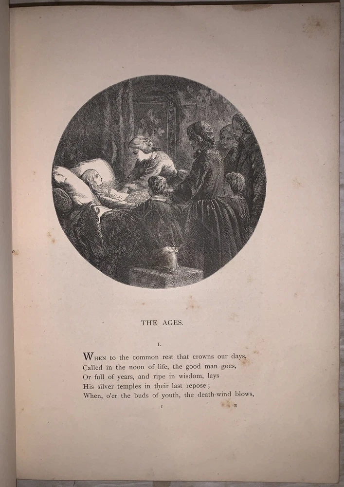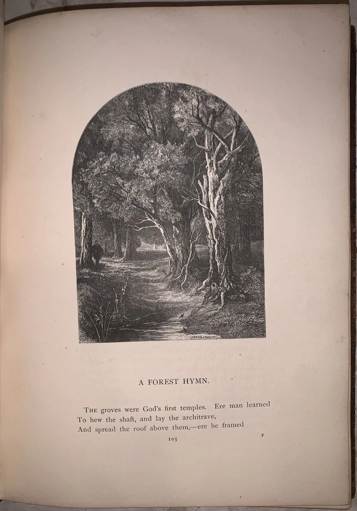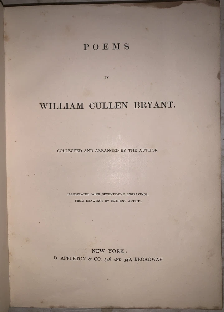 Poems of William Cullen Bryant Collected and Arranged by the Author Illustrated by Seventy-One Engravings from Drawings by Eminent Artists New York: D. Appleton and Co. 1854 Octavo, xiv, 344 pages, bound in period full leather with blind stamped decoation. Marbled endpapers, all edges gilt, illustrated in black and white. Top board detached, Some rubbing and wear, a few scuffs, some damage to spine, light scattered foxing, else in good + condition. If you have any questions, feel free to ask, and don't forget to check out my other listings.