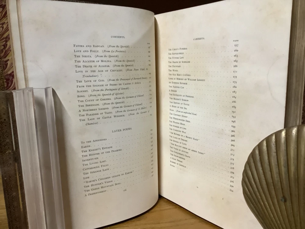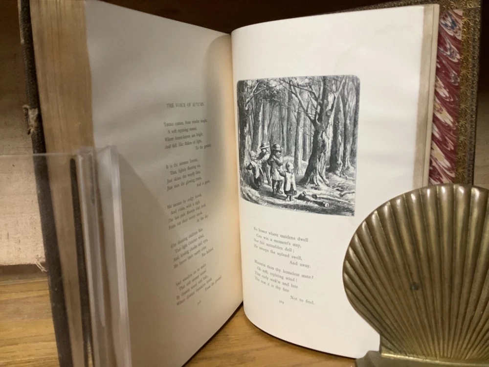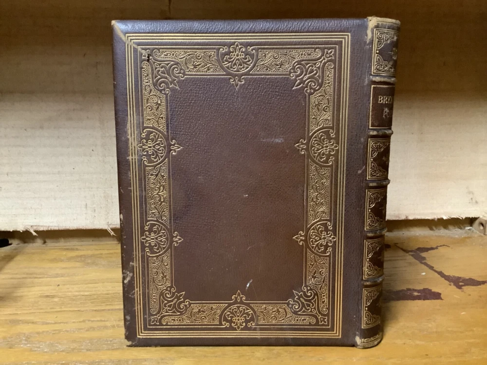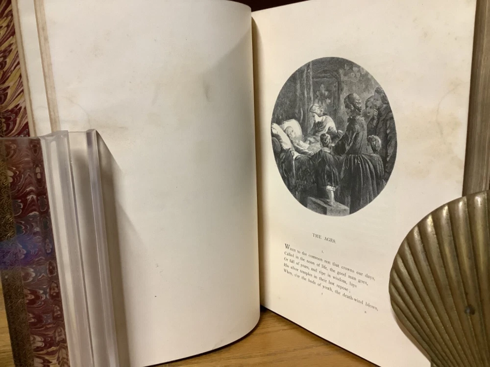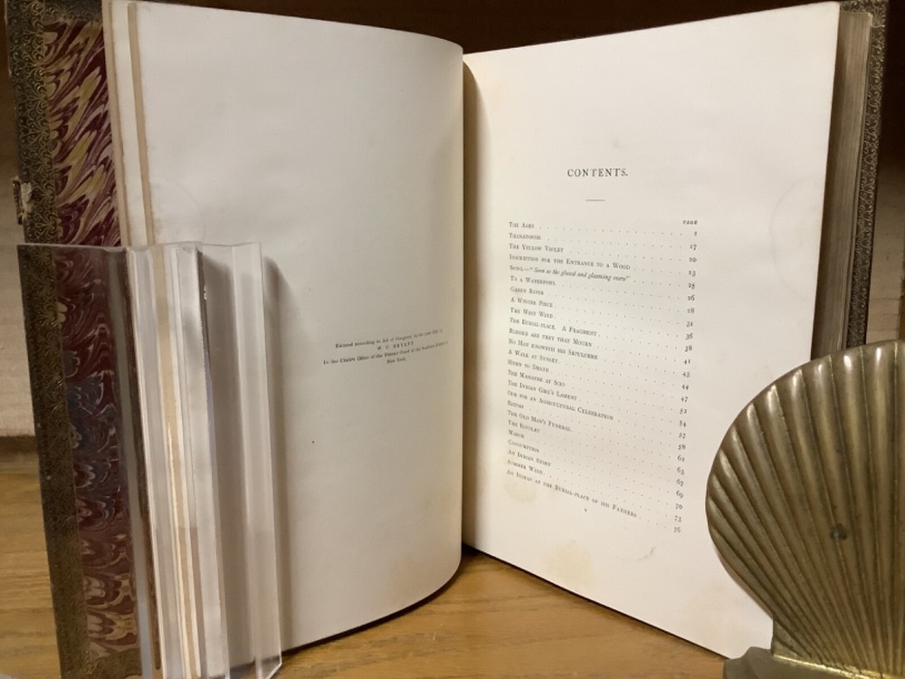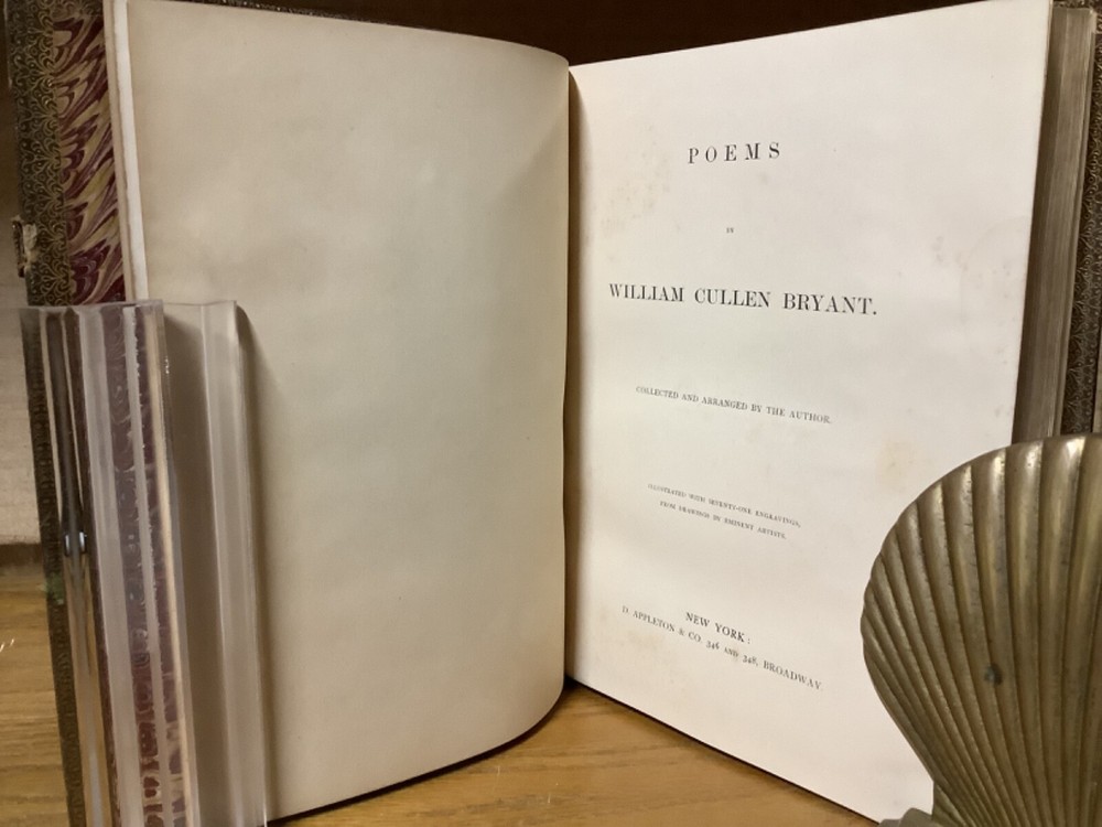 Poems of William Cullen Bryant. Collected and Arranged by the Author. Printed in New York City by D. Appleton and Company. 1854, 344 pp, 9” x 6.75”, 8vo, decorative full leather. Overall very good, with minor rubbing and wear around extremities. Small instance of damage to leather to edge of front board. Hinges remain in good condition with minimal rubbing and text block remains bound well. Light markings and marginalia, along with some staining remnants, the latter primarily at rear of book. Periodic black-and-white engravings throughout. General age-related toning to pages, along with periodic foxing and wear. Please see photographs and ask any questions prior to purchasing. A scarce and attractive copy of the earlier poetical works of American writer and journalist William Cullen Bryant (1794-1878). COLL1854ABEX-0324-aj1164