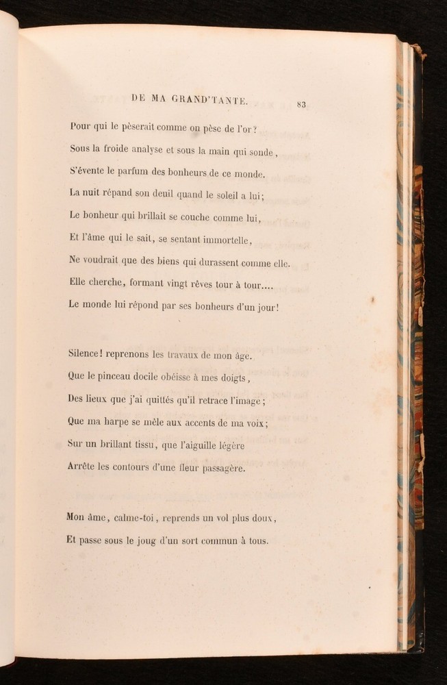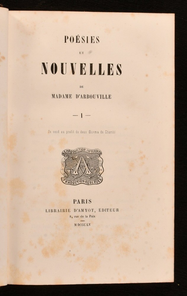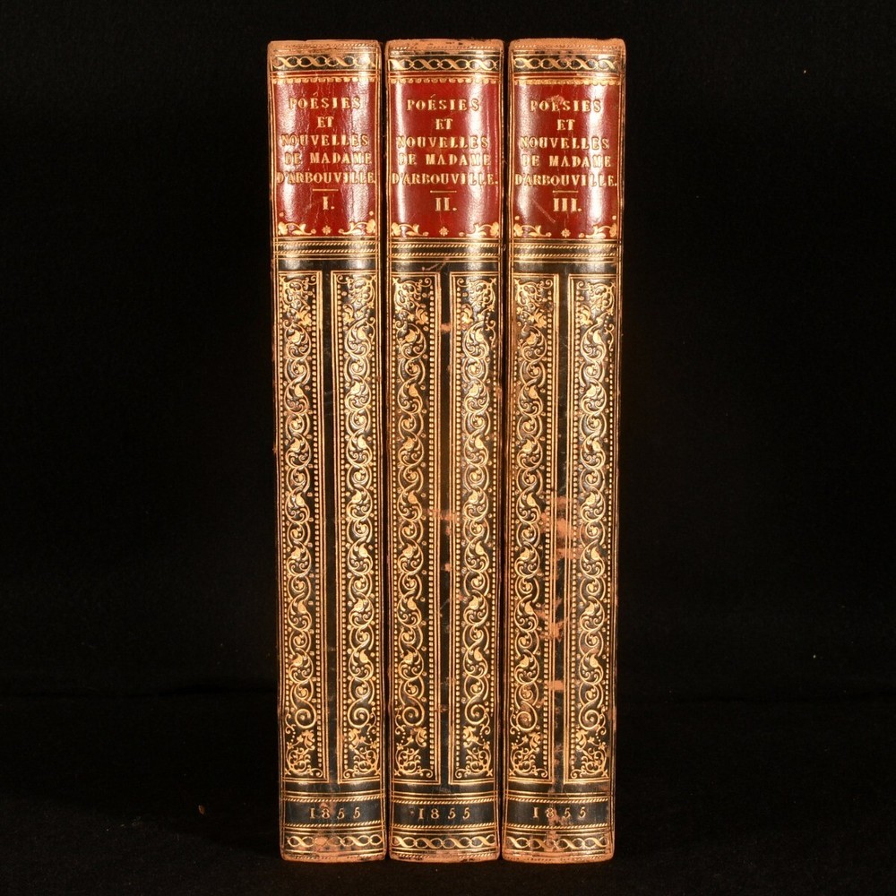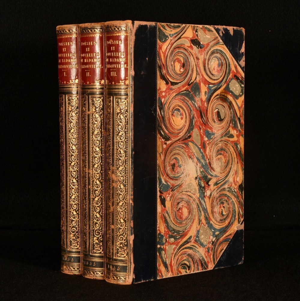 Click here to see our other books! Poésies et Nouvelles Madame D'Arbouville 1855 D'Amyot : Paris 9" by 6" xv, 378pp; 441, [2]; 421pp, [2] SUMMARY A first edition of this scarce collection of novels and poems by the French author Sophie de Bezancourt. First Edition,Leather Binding,Scarce Overall Condition: Very Good This book weighs 3 KG when packed UK Postage: £ 3.99 US Postage: £ 36.99 EU Postage : £ 25.99 European Postage: £ 27.99 Asia Postage: £ 47.99 Worldwide Postage: £ 69.99 DESCRIPTION A first edition of Sophie de Bezancourt's collection of novels and poems. Published in French. Having married Francois d'Arbouville at age 22, Bezancourt accompanied the Lieutenant General on his campaigns in Africa, before returning to Paris and became a society hostess. Although her poetry was initially published in magazines and newspapers without her consent, she soon earned recognition from the literary critics of the day such as Charles Sainte-Beuve. CONDITION In a quarter calf binding over patterned boards with a decorative spine. Externally, generally smart. Rubbed to the boards, less so to the joints and spine. With some moderate rubbing to the extremities and the head and tail of the spine. The front hinges of all three volumes are just beginning to start, as is the rear hinge of volume III. Internally, firmly bound. Pages are bright with very light scattered foxing, often to the fore edge of the page. Overall Condition: Very Good GLOSSARY OF TERMS Overall Condition (Dustwrapper condition rating is shown after that for the book itself, where a dustwrapper is present) Fine - Very well preserved copy showing very little wear Very Good Indeed - Only one or two minor faults, really a very attractive copy Very Good - Quite a wide term meaning no major faults but probably several smaller ones often expected given the age of the book, but still a respectable copy Good - Meaning not very good. Some more serious faults as will be described in the condition report under 'condition' Good Only - Meaning one or more faults that could really do with repair Fair - As with good only above but with other faults leaving a compromised copy even after repair Poor - Really bad and possibly seriously incomplete. We only sell books in this condition where their rarity or value makes them attractive none the less. Major defects will be described. GUARANTEE We offer a full money back guarantee on our descriptions. Please ask for details and conditions. We prefer PAYPAL. If you pay via PAYPAL we will post the item off the same or the next working day with the postage you have selected. Please note we cannot accept USD cheques