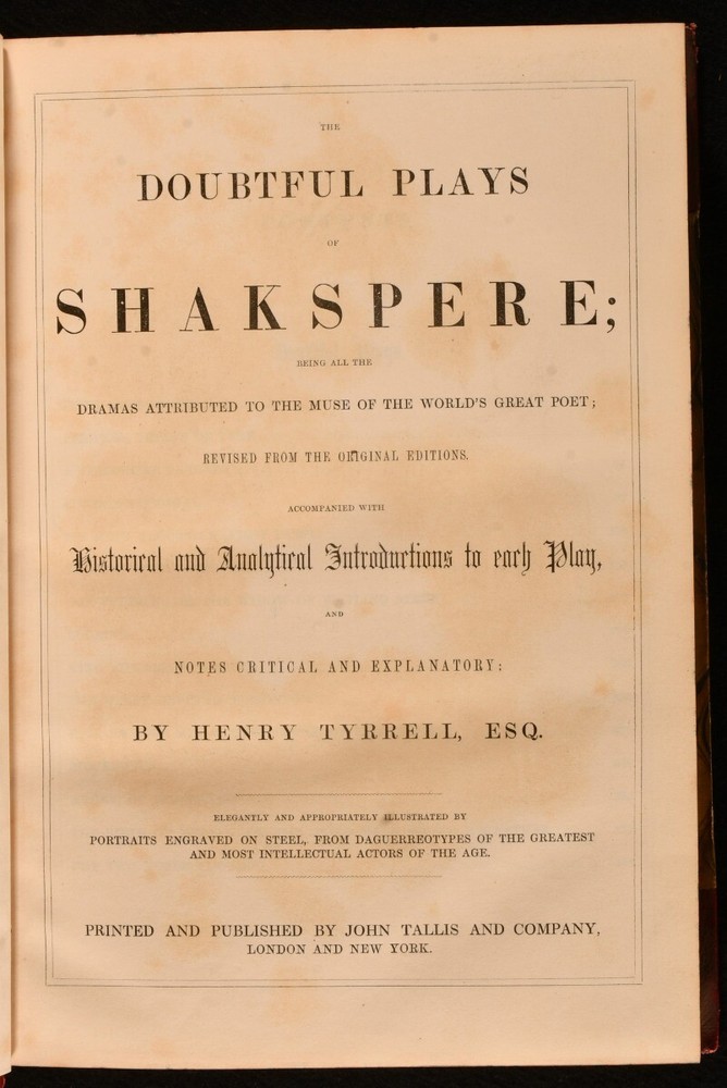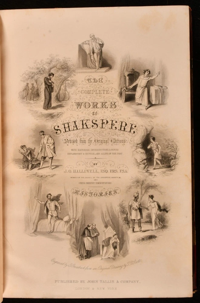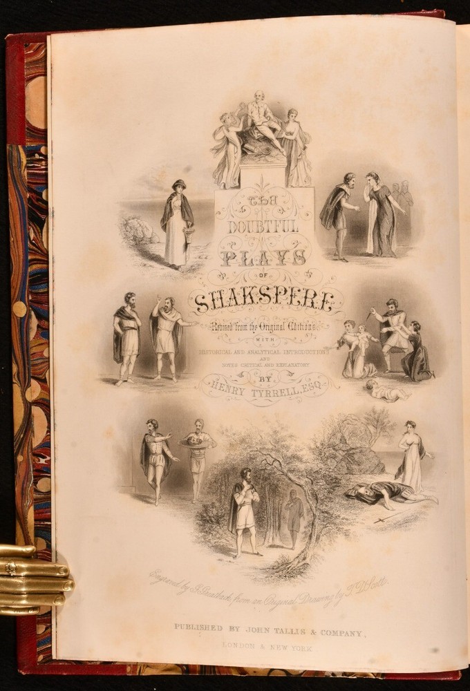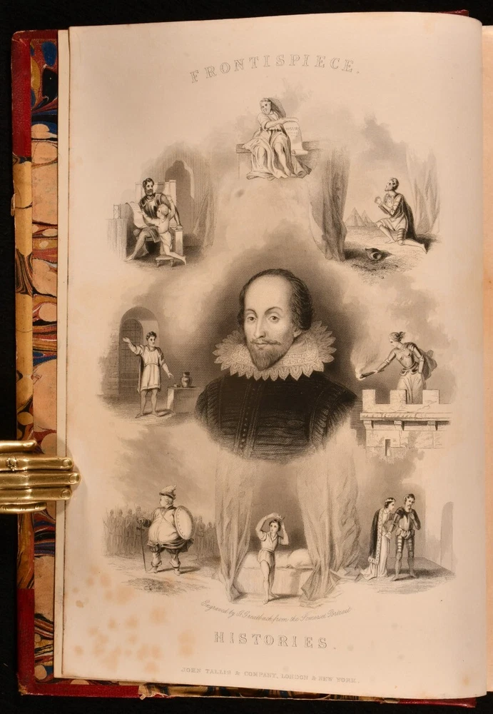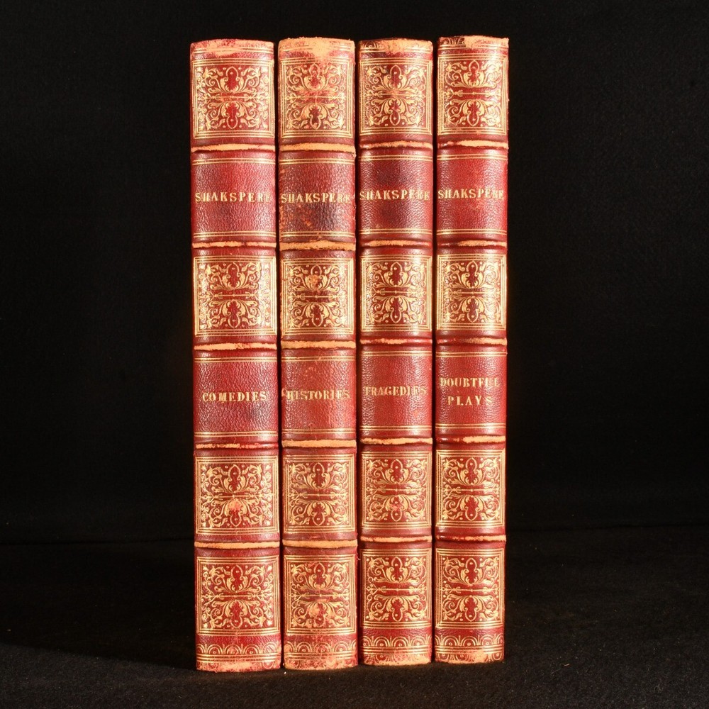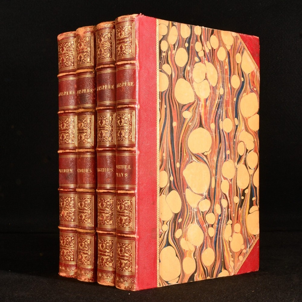 Click here to see our other books! The Complete Works of Shakspere: Tragedies, Comedies, Histories, Doubtful Plays William Shakespeare; J. O. Halliwell; Henry Tyrell 1860 John Tallis and Company : London and New York 11" by 7.5" [4], 496pp; [4], 484pp; [4], 575pp; [4], 487pp SUMMARY A lovely leather bound set of the works of Shakespeare complete in four volumes with illustrations. Illustrated,Leather Binding Overall Condition: Very Good This book weighs 6 KG when packed UK Postage: £ 4.49 US Postage: £ 47.99 EU Postage : £ 28.99 European Postage: £ 49.99 Asia Postage: £ 79.99 Worldwide Postage: £ 159.99 DESCRIPTION The Complete Works of Shakspere and The Doubtful Plays of Shakspere in uniform half morocco bindings and marbled boards. This set includes Tragedies, Comedies and Histories in three volumes, with explanatory and critical notes and a life of the poet by J. O. Halliwell. Also included and completing the set is Doubtful Plays of Shakspere, being all the dramas attributed to the muse of the world's great poet, with historical and analytical introduction to each play and notes by Henry Tyrrell. Each Volume illustrated with a beautiful frontispiece. Collated, complete. Revised from the original editions. CONDITION In half morocco bindings and marbled boards. Externally, sound. There is some rubbing to the heads and tails of the spines and the joints. There are some light marks to the boards. Internally, firmly bound. The pages are bright and clean with the occasional spot. Overall Condition: Very Good GLOSSARY OF TERMS Overall Condition (Dustwrapper condition rating is shown after that for the book itself, where a dustwrapper is present) Fine - Very well preserved copy showing very little wear Very Good Indeed - Only one or two minor faults, really a very attractive copy Very Good - Quite a wide term meaning no major faults but probably several smaller ones often expected given the age of the book, but still a respectable copy Good - Meaning not very good. Some more serious faults as will be described in the condition report under 'condition' Good Only - Meaning one or more faults that could really do with repair Fair - As with good only above but with other faults leaving a compromised copy even after repair Poor - Really bad and possibly seriously incomplete. We only sell books in this condition where their rarity or value makes them attractive none the less. Major defects will be described. GUARANTEE We offer a full money back guarantee on our descriptions. Please ask for details and conditions. We prefer PAYPAL. If you pay via PAYPAL we will post the item off the same or the next working day with the postage you have selected. Please note we cannot accept USD cheques