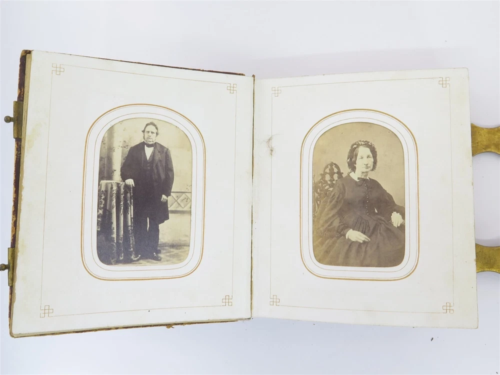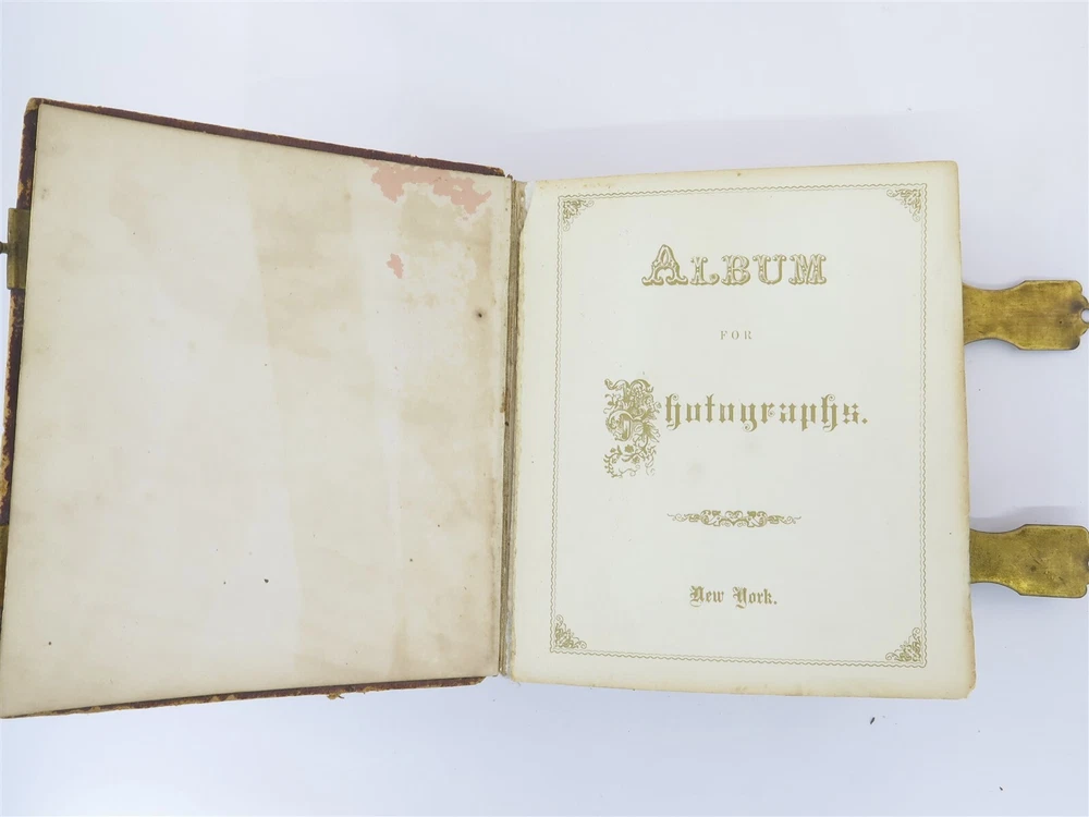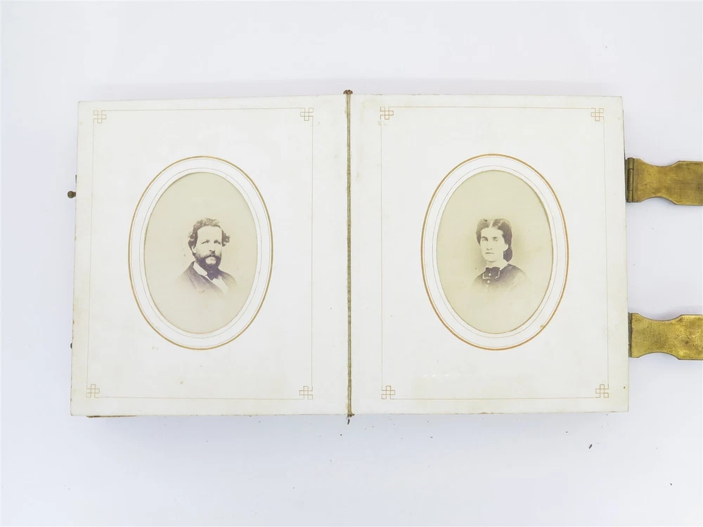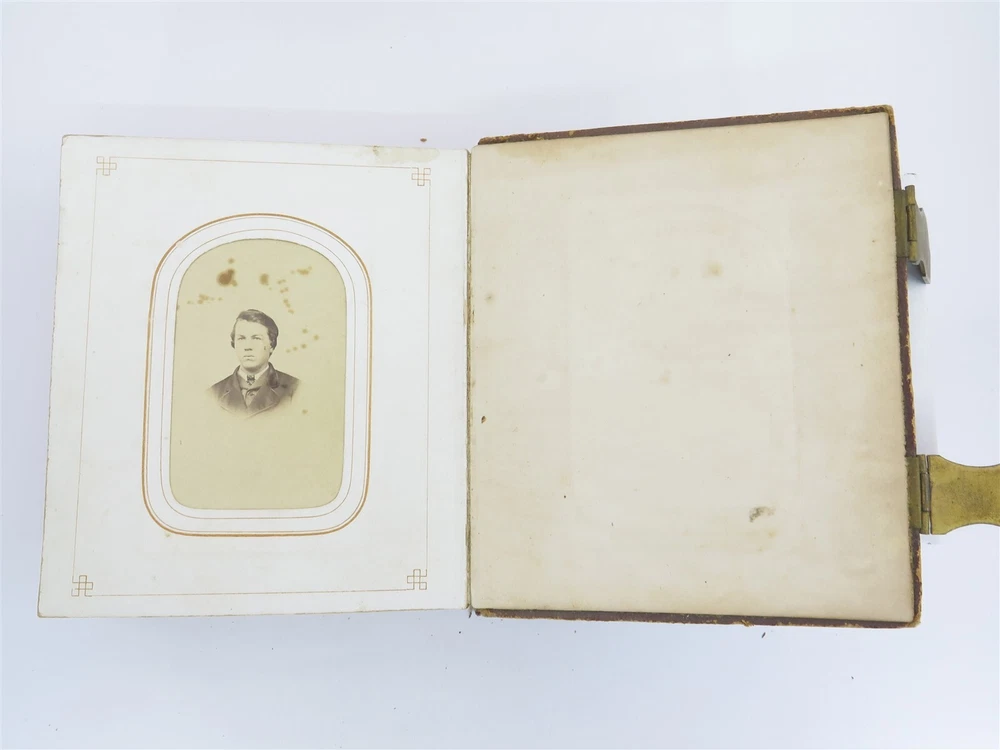 1860's Leather Bound Family Photo Album with Carte de Visite and Lithographs Cameo Vignettes Photography studios in Santa Barbara and Minnesota (and more if backs were visible) Condition: Album has significant wear but the photos have been preserved nicely. There is some foxing to some of the photos. Please see pictures showing item details and condition..,