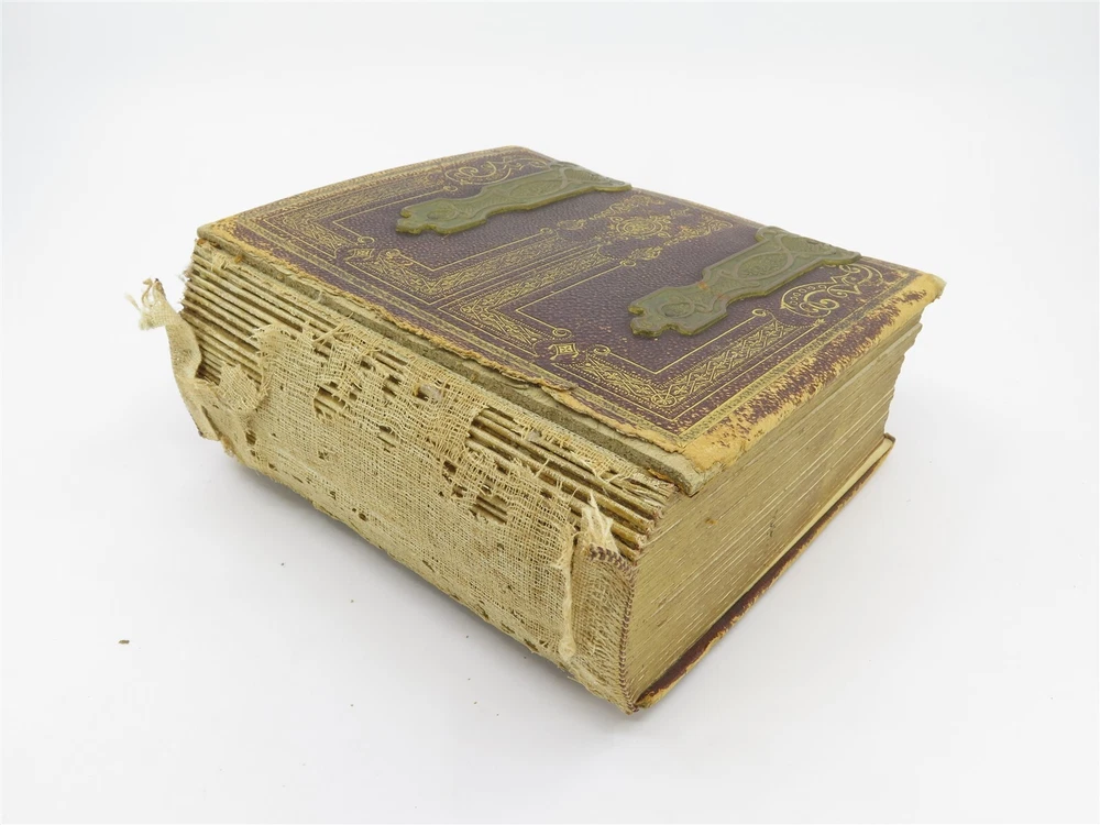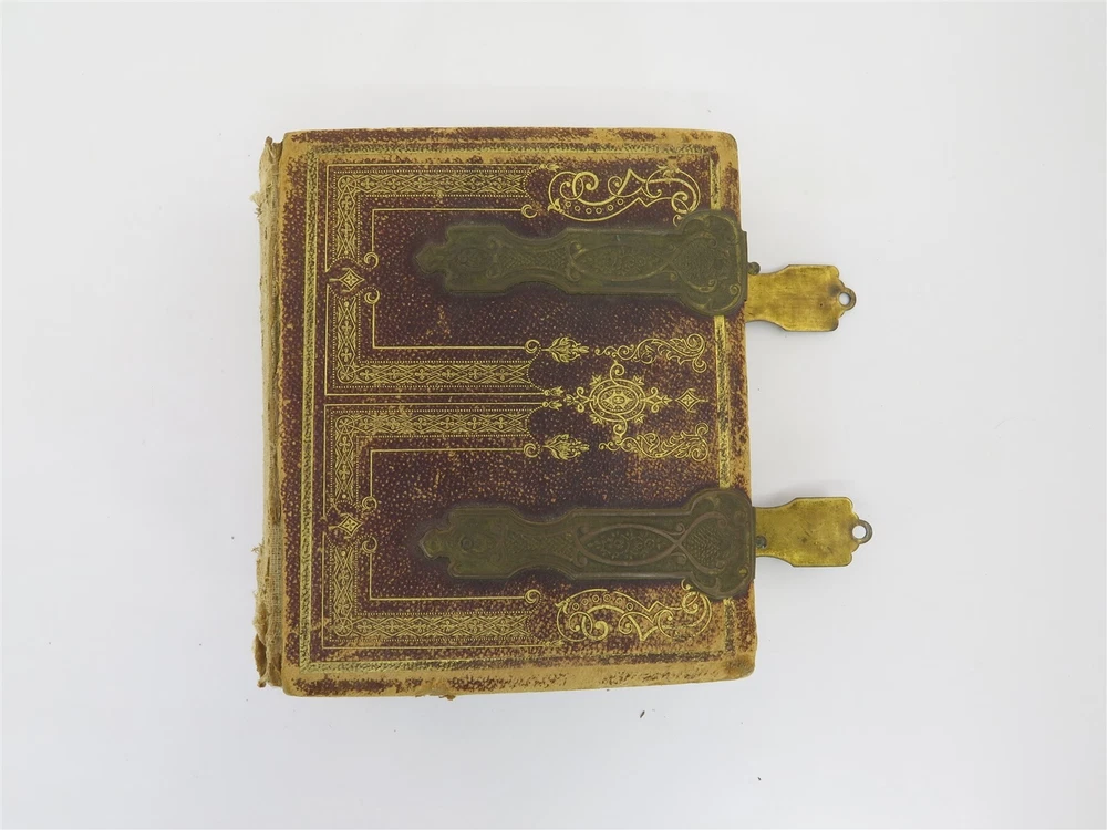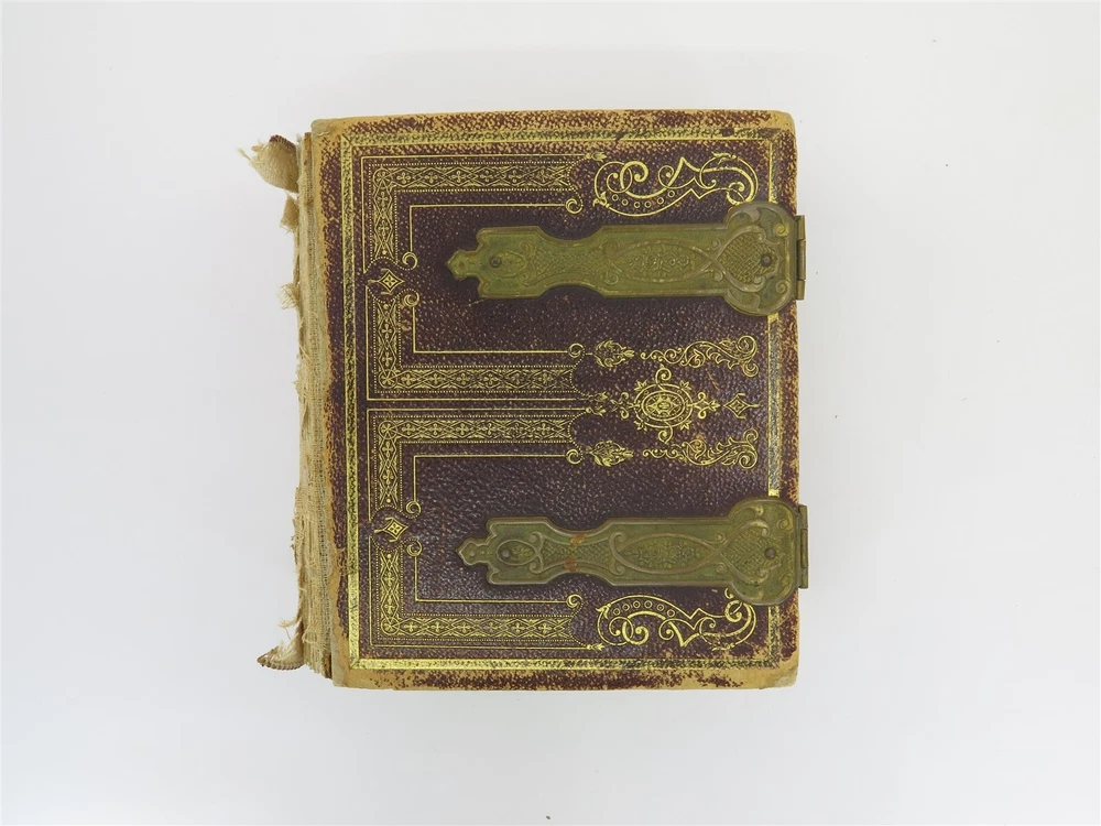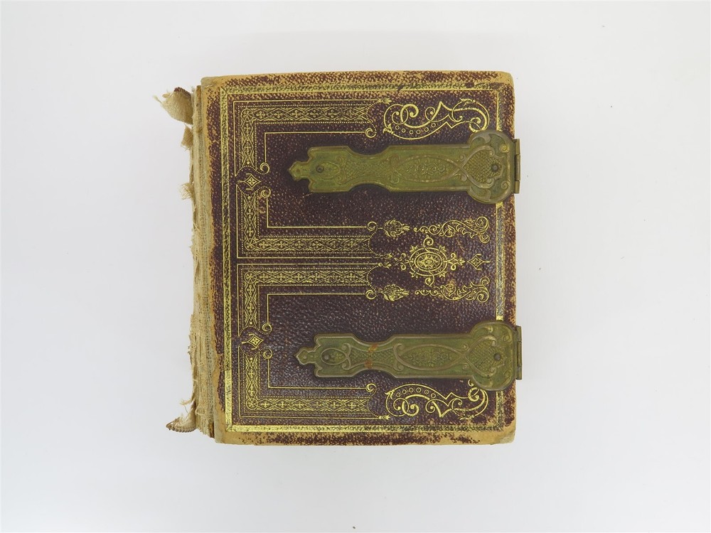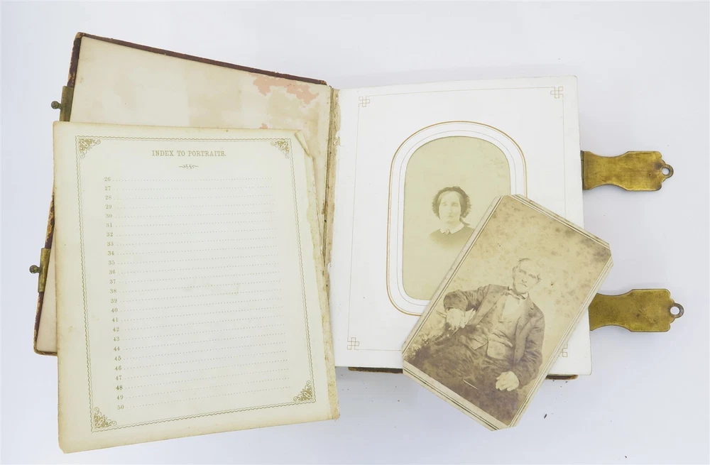1860's Leather Bound Family Photo Album with Carte de Visite and Lithographs Cameo Vignettes Photography studios in Santa Barbara and Minnesota (and more if backs were visible) Condition: Album has significant wear but the photos have been preserved nicely. There is some foxing to some of the photos. Please see pictures showing item details and condition..,