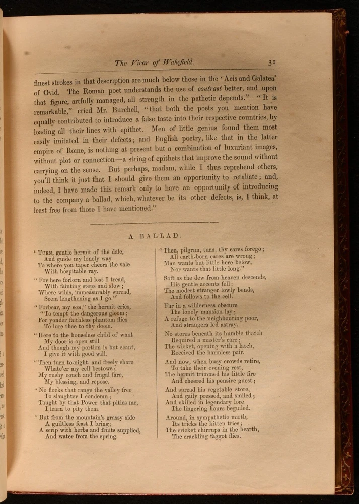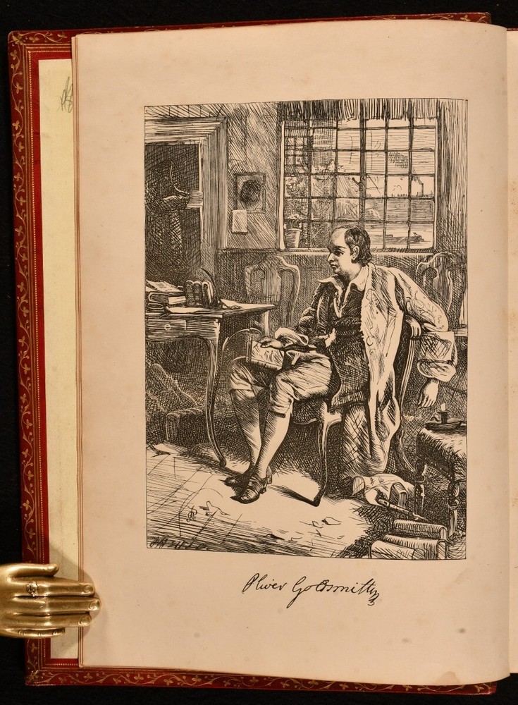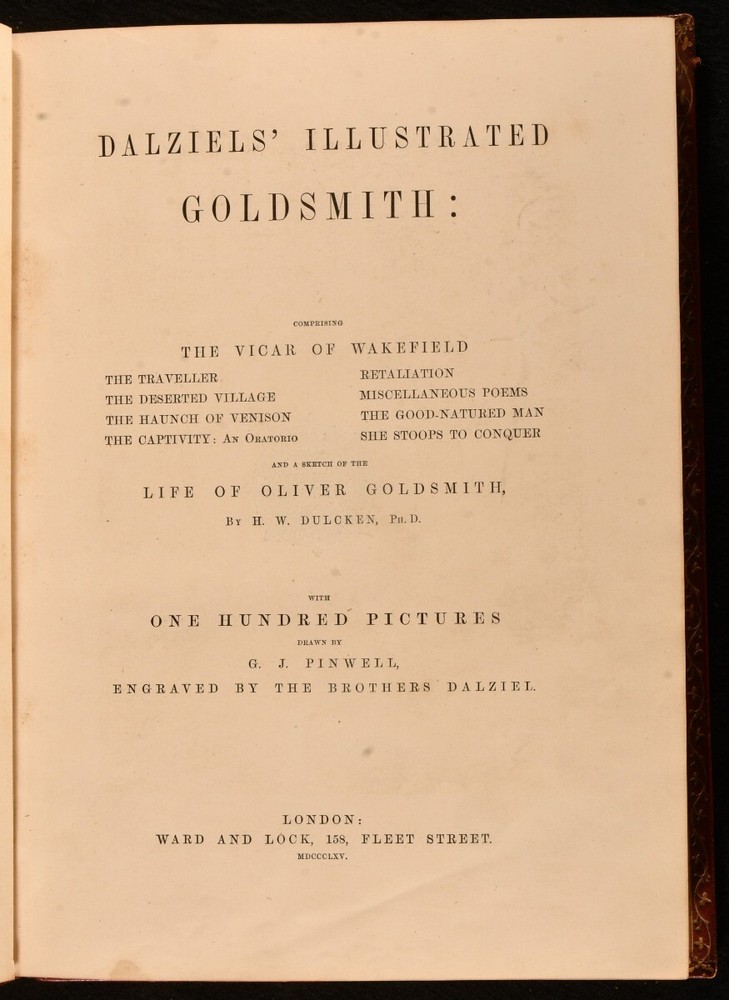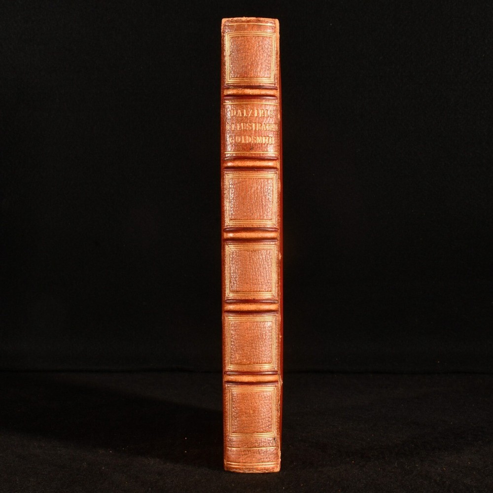 Click here to see our other books! Dalziels' Illustrated Goldsmith Oliver Goldsmith; H. W. Dulcken 1865 Ward and Lock : London 10.5" by 8" xx, 378pp SUMMARY A lovely illustrated collection of work by Oliver Goldsmith by the Brothers Dalziel. Illustrated,Leather Binding Overall Condition: Very Good This book weighs 2 KG when packed UK Postage: £ 3.99 US Postage: £ 29.99 EU Postage : £ 21.99 European Postage: £ 23.99 Asia Postage: £ 37.99 Worldwide Postage: £ 38.99 DESCRIPTION Dalziels' Illustrated Goldsmith in full morocco binding. A lovely collection of work by Oliver Goldsmith illustrated with one hundred pictures by G. J. Pinwell, engraved by the Brothers Dalziel. Comprising of The Vicar of Wakefield, The Traveller, The Deserted Village, The Haunch of Venison, The Captivity; An Oratorio, Retaliation, Miscellaneous Poems, The Good-Natured Man, and She Stoops to Conquer. Also includes a sketch of the Life of Oliver Goldsmith by H. W. Dulcken. Prior owner's book plate to the first pastedown. CONDITION In full morocco binding. Externally, smart. There is some bumping to the head and tail of the spine and to the extremities. There is some rubbing to the leather in these areas. Internally, firmly bound. The pages are bright and clean with some light spotting throughout. Overall Condition: Very Good GLOSSARY OF TERMS Overall Condition (Dustwrapper condition rating is shown after that for the book itself, where a dustwrapper is present) Fine - Very well preserved copy showing very little wear Very Good Indeed - Only one or two minor faults, really a very attractive copy Very Good - Quite a wide term meaning no major faults but probably several smaller ones often expected given the age of the book, but still a respectable copy Good - Meaning not very good. Some more serious faults as will be described in the condition report under 'condition' Good Only - Meaning one or more faults that could really do with repair Fair - As with good only above but with other faults leaving a compromised copy even after repair Poor - Really bad and possibly seriously incomplete. We only sell books in this condition where their rarity or value makes them attractive none the less. Major defects will be described. GUARANTEE We offer a full money back guarantee on our descriptions. Please ask for details and conditions. We prefer PAYPAL. If you pay via PAYPAL we will post the item off the same or the next working day with the postage you have selected. Please note we cannot accept USD cheques