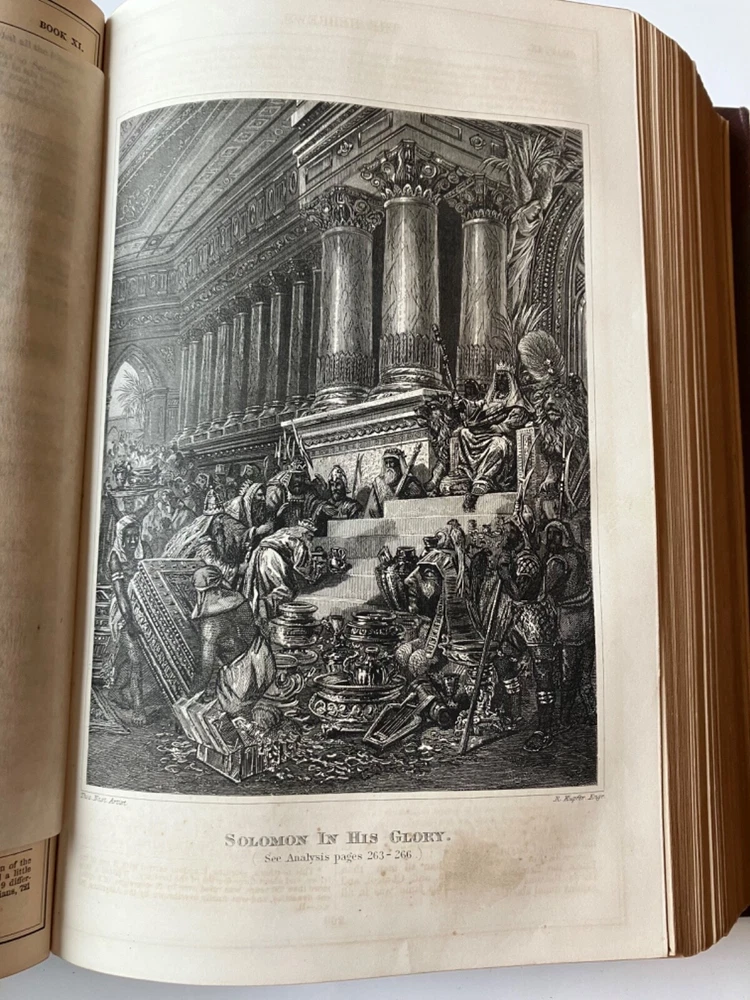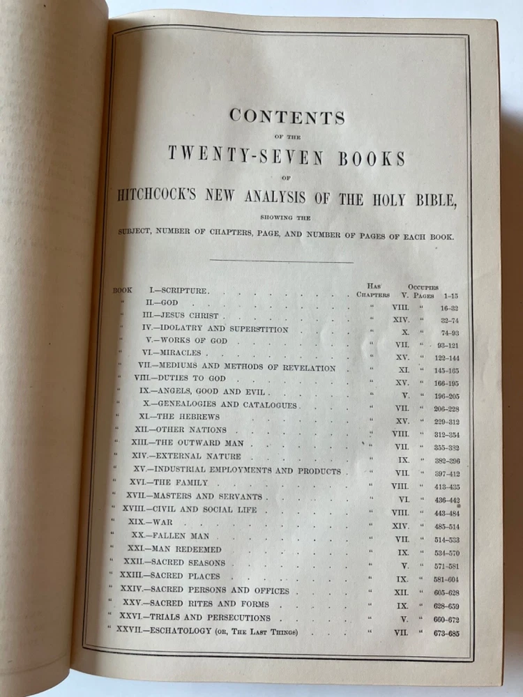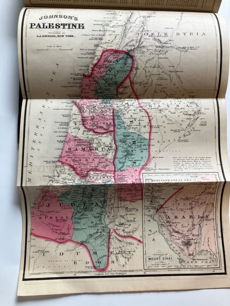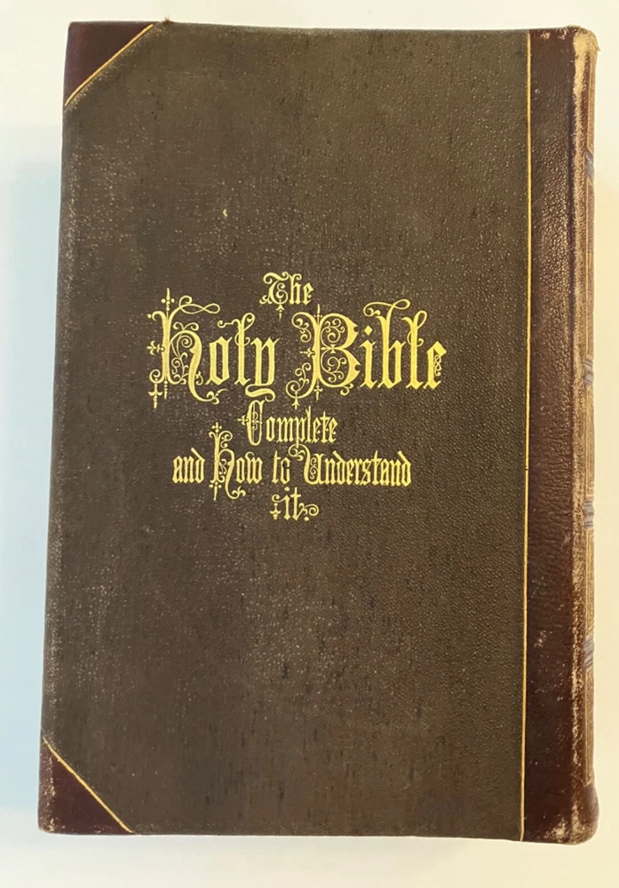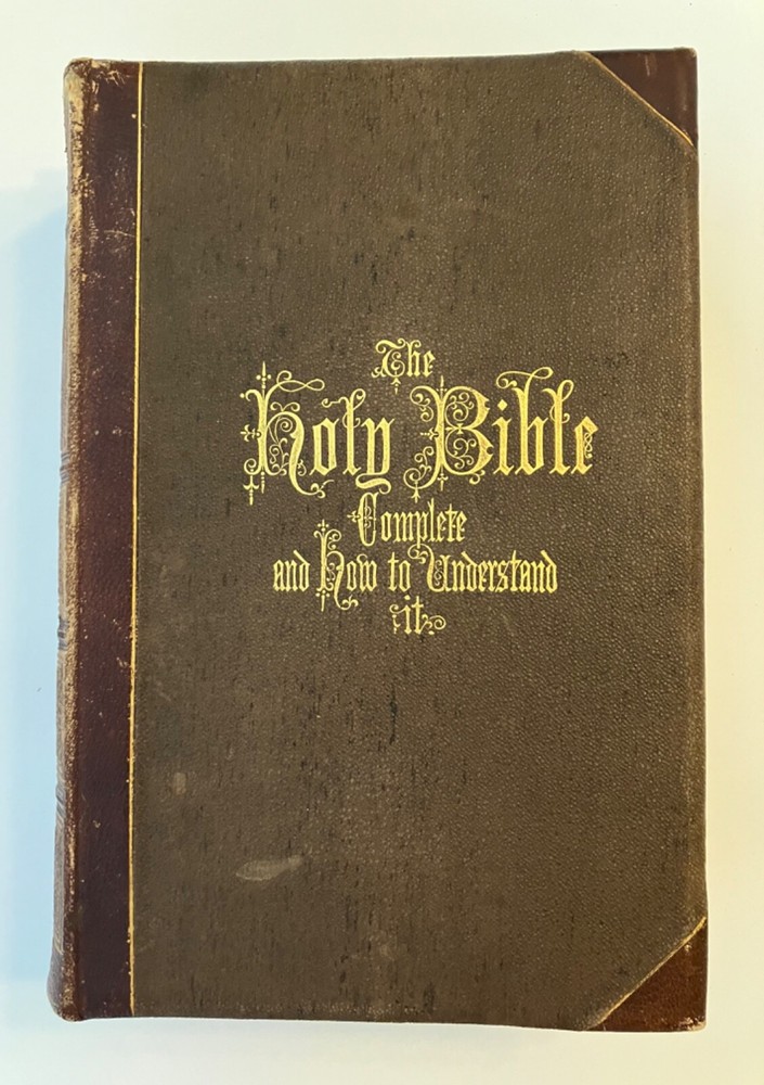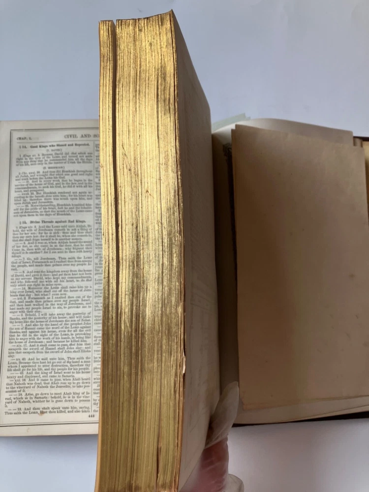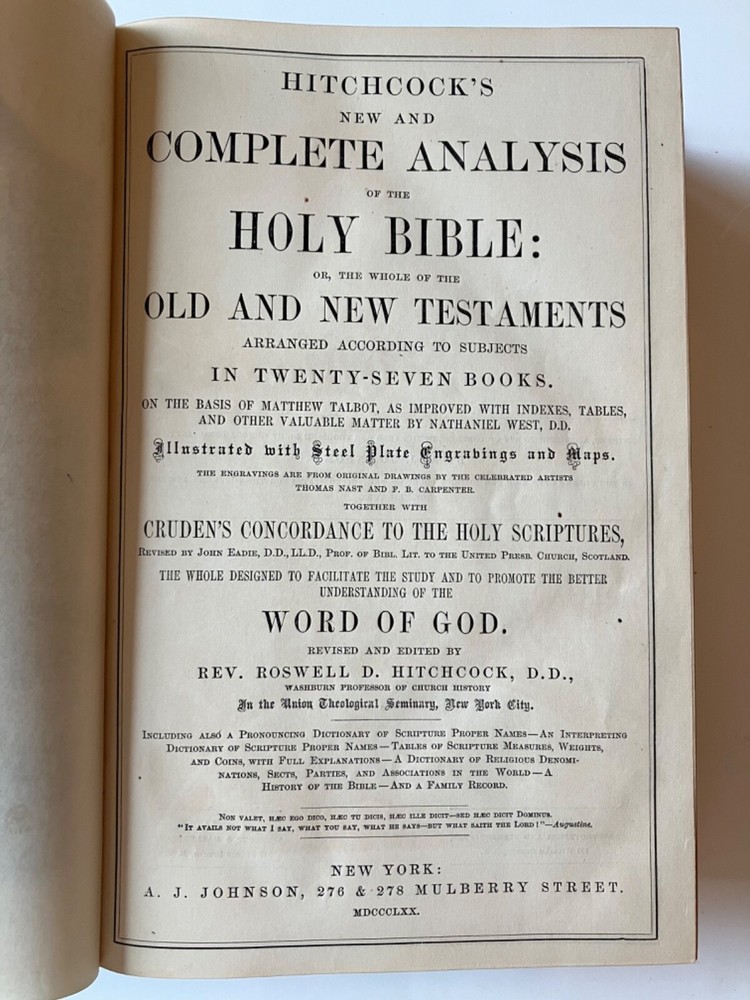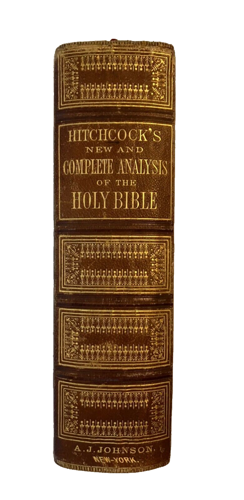 Hitchcock’s New and Complete Analysis of The Holy Bible: Or, The Whole of the Old and New Testaments Arranged According to Subjects in Twenty-Seven Books. Copyright 1869. Revised and edited by Rev Roswell D. Hitchcock. Published by A. J. Johnson, Mulberry Street, NY, 1870. Half-leather bound. Illustrated. Believed to be first edition. A very unique copy of this comprehensive work from 1870. Aside from the text and stunning steel engravings / illustrations, this particular book has interesting pieces laid in from the original owner. Folded nto the family record section in the back is the original owner’s marriage certificate, dated 1862 – the Civil War era. The couple was married in VT and lived in NH. The records are filled in with beautiful penmanship of the time. The owner’s daughter appears to have died very young, and there is a beautiful poem dedicated to her in this section. I am unable to recognize the poem; though it may be another’s words or a famous lyric, it is touching. There is also a handmade / hand stitched bookmark laid in that says “Holy Bible,” along with a small canvas handmade piece that says “From James” in the family record section. This copy has a lot of personal touches and history of the family, relics of another century. There is also a pull-out color map in the back of the book. All outer edges of this heavy and substantial book are gilt. The book measures 7.25” x 11” and nearly 3” in depth. Overall, this is a quite good copy for its age with rich history to behold. Condition: The covers, edges, and corners have some wear and scuffing, as shown. The spine has areas of denting and frayed edges, top and bottom. The internal pastedowns may have been replaced at some point. There is some debris on the pastedowns and a stamp of the previous owner on the ffep. There is some foxing on the plates / illustrations and tissue guards and sporadically to some of the text pages, especially the text ones near the illustrations and tissue. The vast majority of pages, however, are clean, overall, save for occasional small marks or stains. No writing noted in the text pages (except for the family record pages). The binding is quite good for its age and holding. There is a small section of pages towards the rear that have lightly folded corners towards the bottom. The page that houses the handmade bookmark has tanning in that area. The bookmark ribbon portion has signs of age and frayed / worn edges.