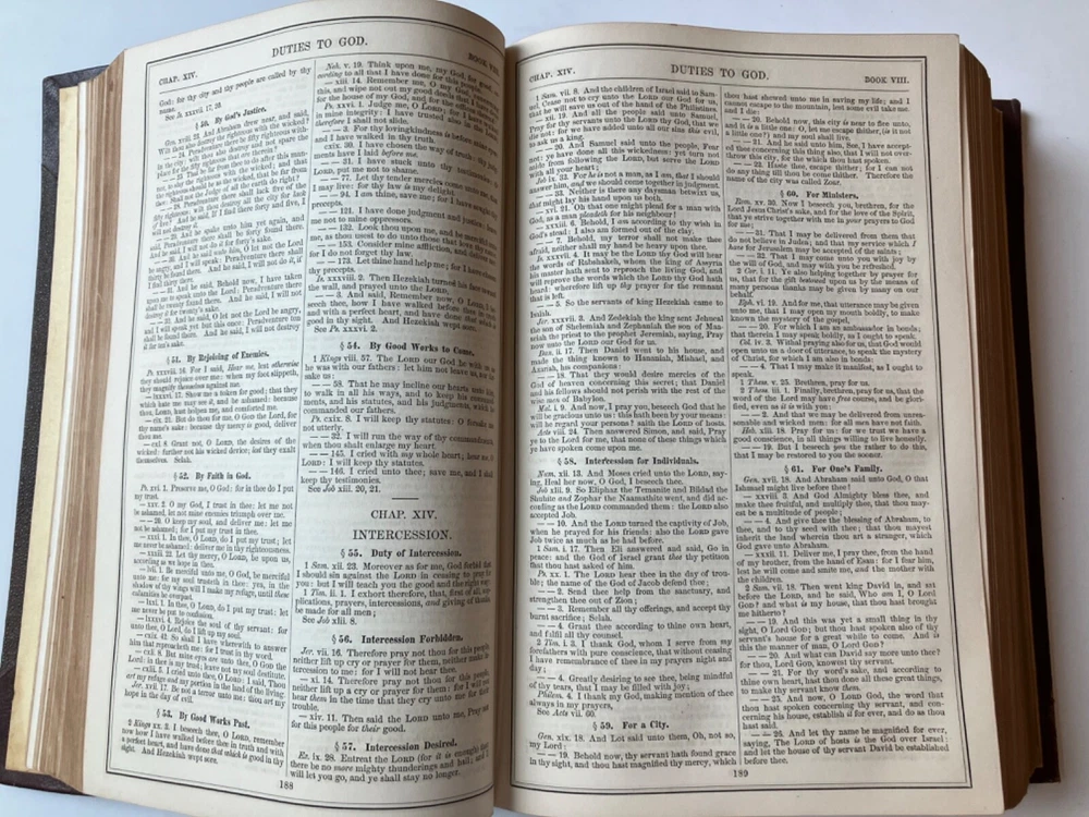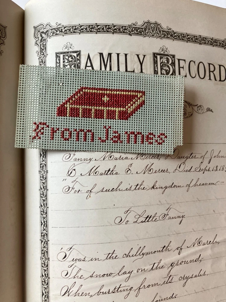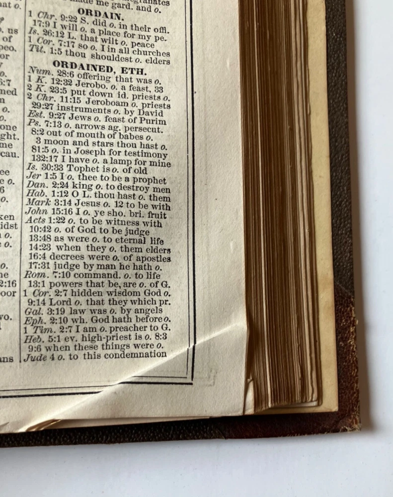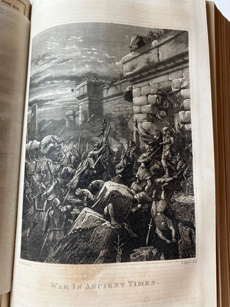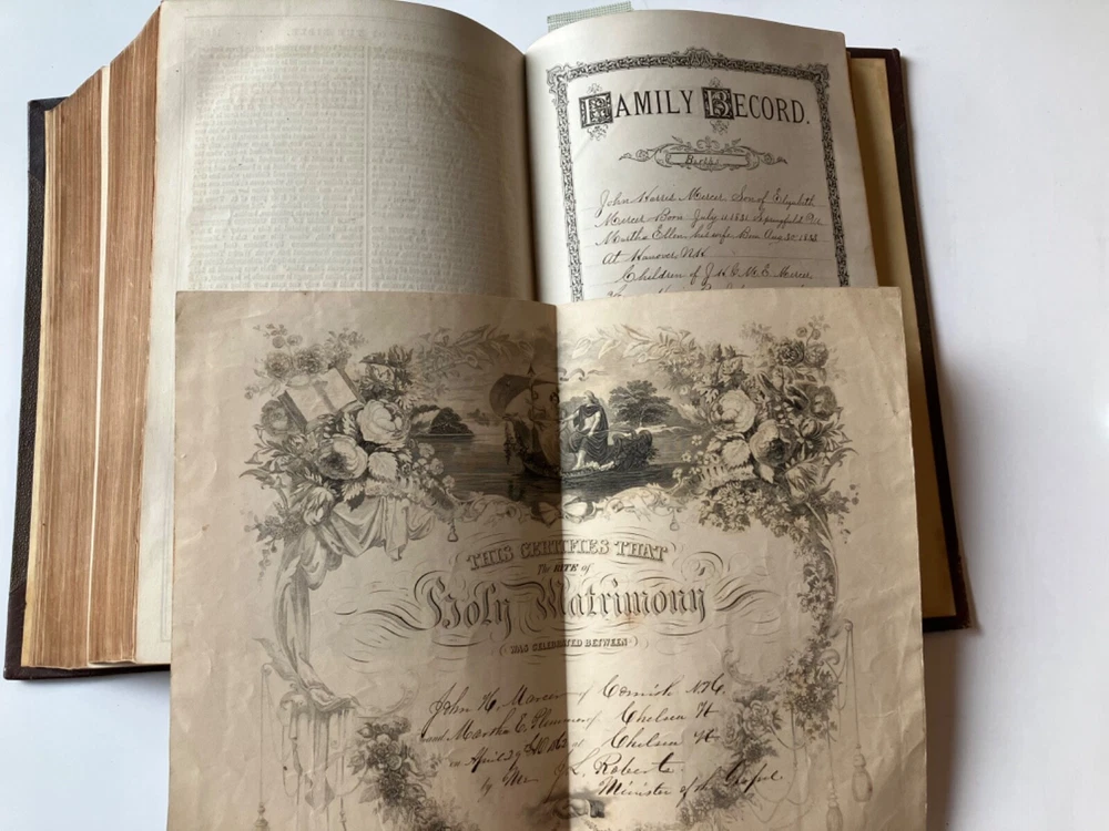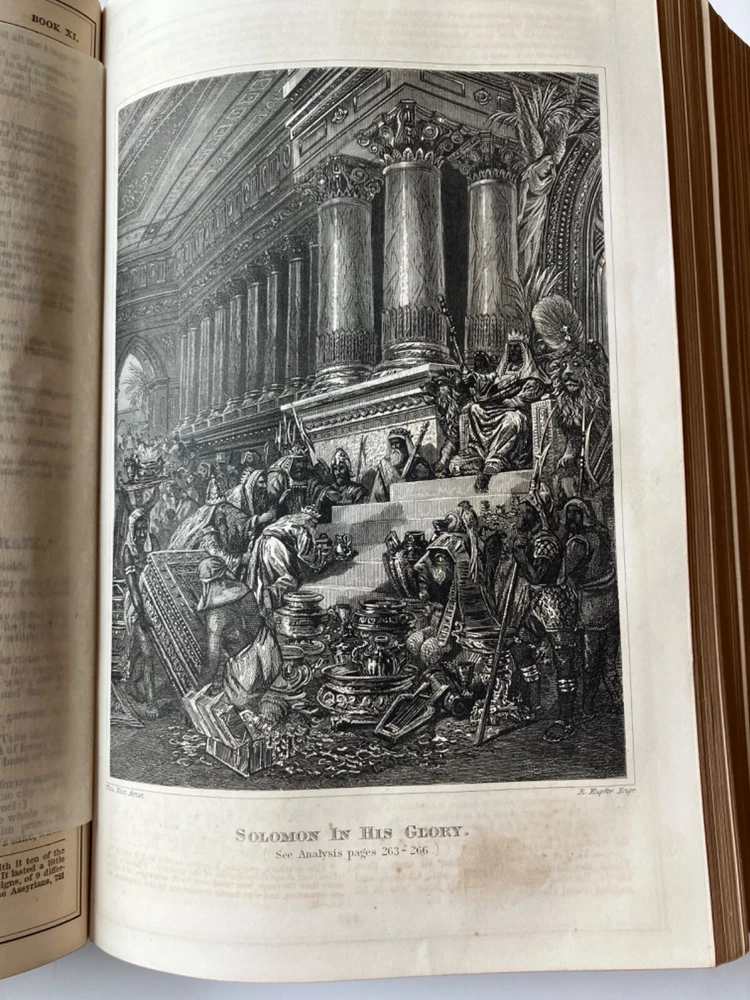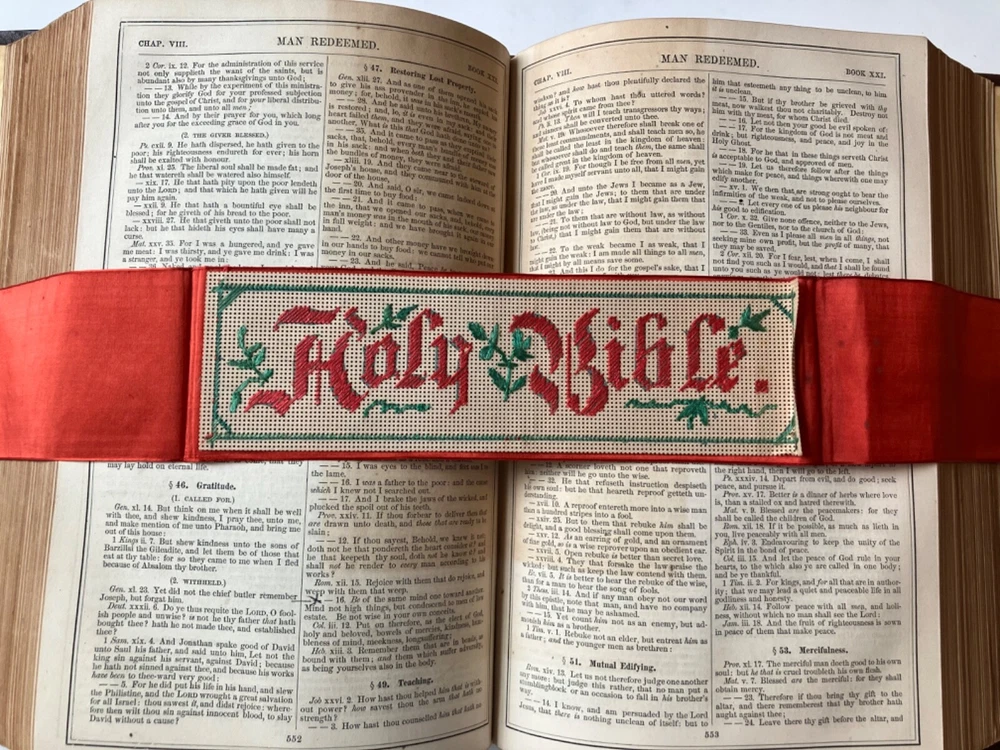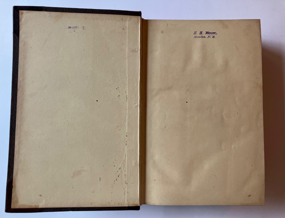 Hitchcock’s New and Complete Analysis of The Holy Bible: Or, The Whole of the Old and New Testaments Arranged According to Subjects in Twenty-Seven Books. Copyright 1869. Revised and edited by Rev Roswell D. Hitchcock. Published by A. J. Johnson, Mulberry Street, NY, 1870. Half-leather bound. Illustrated. Believed to be first edition. A very unique copy of this comprehensive work from 1870. Aside from the text and stunning steel engravings / illustrations, this particular book has interesting pieces laid in from the original owner. Folded nto the family record section in the back is the original owner’s marriage certificate, dated 1862 – the Civil War era. The couple was married in VT and lived in NH. The records are filled in with beautiful penmanship of the time. The owner’s daughter appears to have died very young, and there is a beautiful poem dedicated to her in this section. I am unable to recognize the poem; though it may be another’s words or a famous lyric, it is touching. There is also a handmade / hand stitched bookmark laid in that says “Holy Bible,” along with a small canvas handmade piece that says “From James” in the family record section. This copy has a lot of personal touches and history of the family, relics of another century. There is also a pull-out color map in the back of the book. All outer edges of this heavy and substantial book are gilt. The book measures 7.25” x 11” and nearly 3” in depth. Overall, this is a quite good copy for its age with rich history to behold. Condition: The covers, edges, and corners have some wear and scuffing, as shown. The spine has areas of denting and frayed edges, top and bottom. The internal pastedowns may have been replaced at some point. There is some debris on the pastedowns and a stamp of the previous owner on the ffep. There is some foxing on the plates / illustrations and tissue guards and sporadically to some of the text pages, especially the text ones near the illustrations and tissue. The vast majority of pages, however, are clean, overall, save for occasional small marks or stains. No writing noted in the text pages (except for the family record pages). The binding is quite good for its age and holding. There is a small section of pages towards the rear that have lightly folded corners towards the bottom. The page that houses the handmade bookmark has tanning in that area. The bookmark ribbon portion has signs of age and frayed / worn edges.