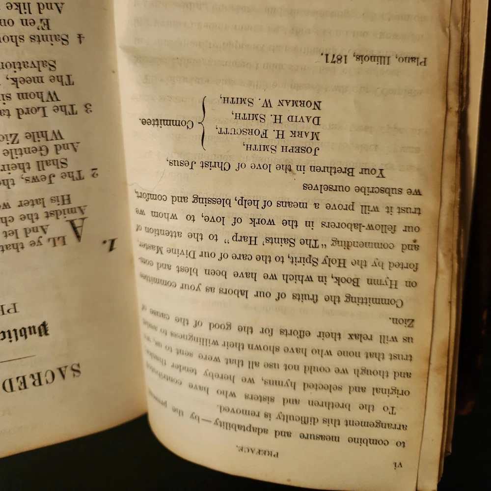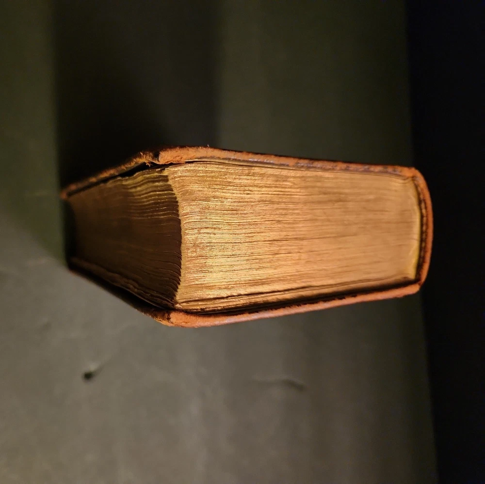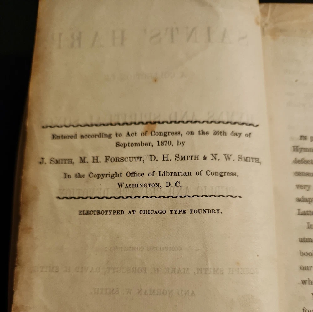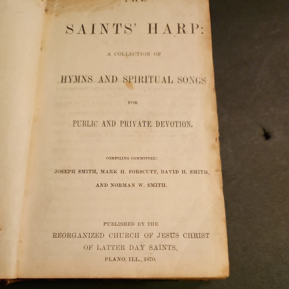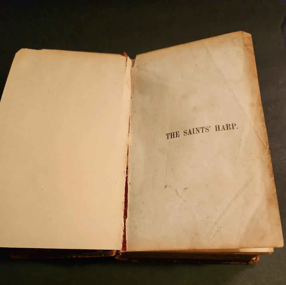 The product is a leather hardcover collection of hymns and spiritual songs titled "The Saints Harp," published by Rlds in 1871 in Plano, Illinois. It is a limited edition collector's item with a miniature size, featuring hymns in English language. The book reflects the theme of religion and spirituality, making it a valuable addition for collectors interested in hymnals from the 19th century. this is a small leather-bound hymnal with 792 pages . it does have alot of wear scratches and scrapes bending and wrinkles fading and yellowing of pages. Bent corners creases and bent pages it has cracking on spine . fraying and loose pages. binding is intact. missing a page at very back of book . staining and tape on page. acceptable condition. see pictures. missing pieces of leather. clean text. no hilighting.