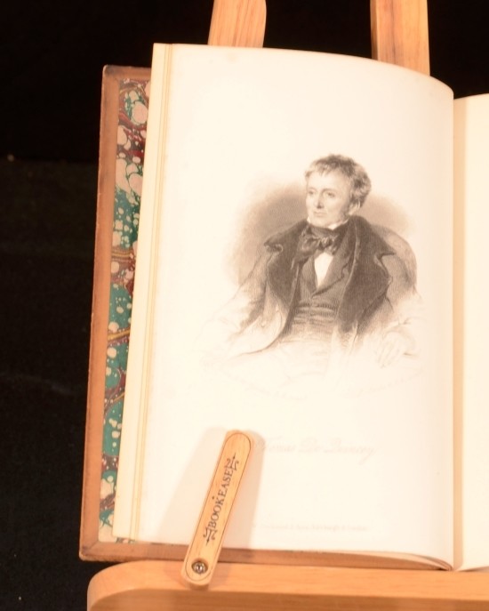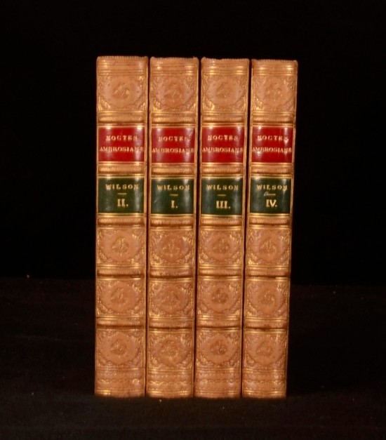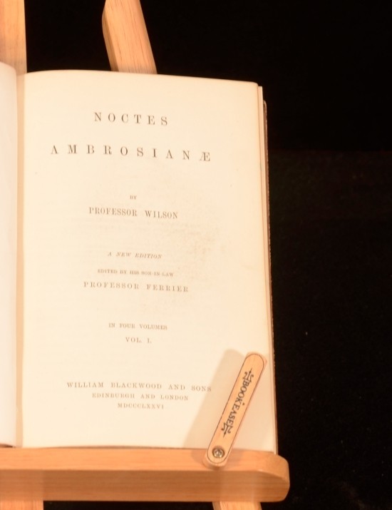 Click here to see our other books! Noctes Ambrosianae A New Edition In Four Volumes Professor Wilson; Professor Ferrier (ed) 1876 William Blackwood and Sons : Edinburgh; London 7.5" by 5" (xxviii) 384pp; (xiv) 428pp; (xiii) 382pp; (xi) 368pp SUMMARY This is a very attractive set of these works by Professor Wilson. Illustrated,Leather Binding Overall Condition: Very Good Indeed This book weighs 2 KG when packed UK Postage: £ 3.99 US Postage: £ 29.99 EU Postage : £ 21.99 European Postage: £ 23.99 Asia Postage: £ 37.99 Worldwide Postage: £ 38.99 DESCRIPTION Complete in four volumes. Each volume features an engraved frontispiece portrait of noted authors. The Noctes Ambrosianae are a series of 71 imaginary colloquies which appeared in Blackwood's Magazine between 1822 and 1835. The earlier colloquies had several different authors however Professor John Wilson was the predominate author. This edition collects the thirty-nine dialogues written by Wilson, and is edited by his son in law Professor Ferrier. CONDITION Uniformly bound in full calf bindings. Externally very smart with some minor shelfwear. Spines slightly sunned. Occasional marks to boards. Internally, firmly bound. Pages bright and clean with only occasional spots and handling marks, heavier to earlier pages. Overall Condition: Very Good Indeed GLOSSARY OF TERMS Overall Condition (Dustwrapper condition rating is shown after that for the book itself, where a dustwrapper is present) Fine - Very well preserved copy showing very little wear Very Good Indeed - Only one or two minor faults, really a very attractive copy Very Good - Quite a wide term meaning no major faults but probably several smaller ones often expected given the age of the book, but still a respectable copy Good - Meaning not very good. Some more serious faults as will be described in the condition report under 'condition' Good Only - Meaning one or more faults that could really do with repair Fair - As with good only above but with other faults leaving a compromised copy even after repair Poor - Really bad and possibly seriously incomplete. We only sell books in this condition where their rarity or value makes them attractive none the less. Major defects will be described. GUARANTEE We offer a full money back guarantee on our descriptions. Please ask for details and conditions. We prefer PAYPAL. If you pay via PAYPAL we will post the item off the same or the next working day with the postage you have selected. Please note we cannot accept USD cheques