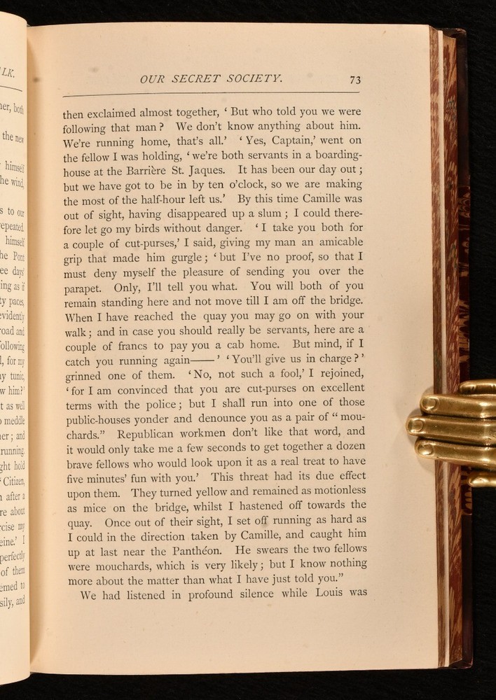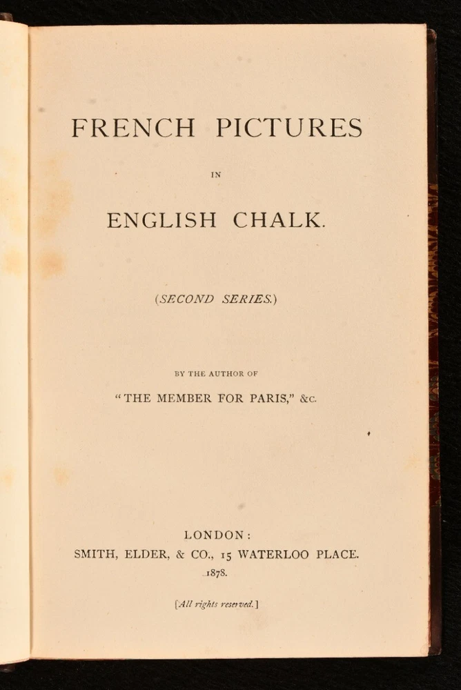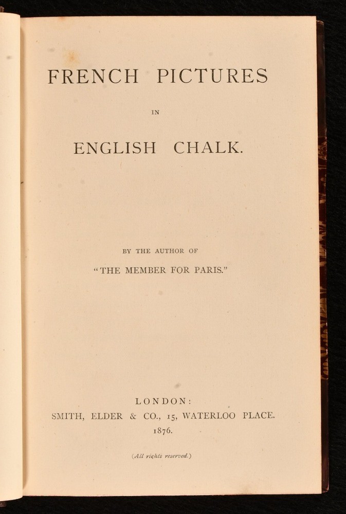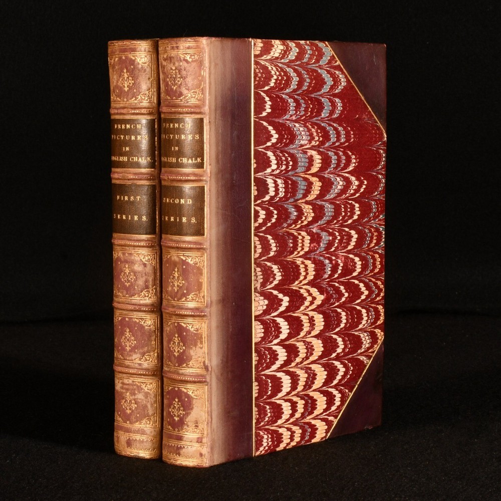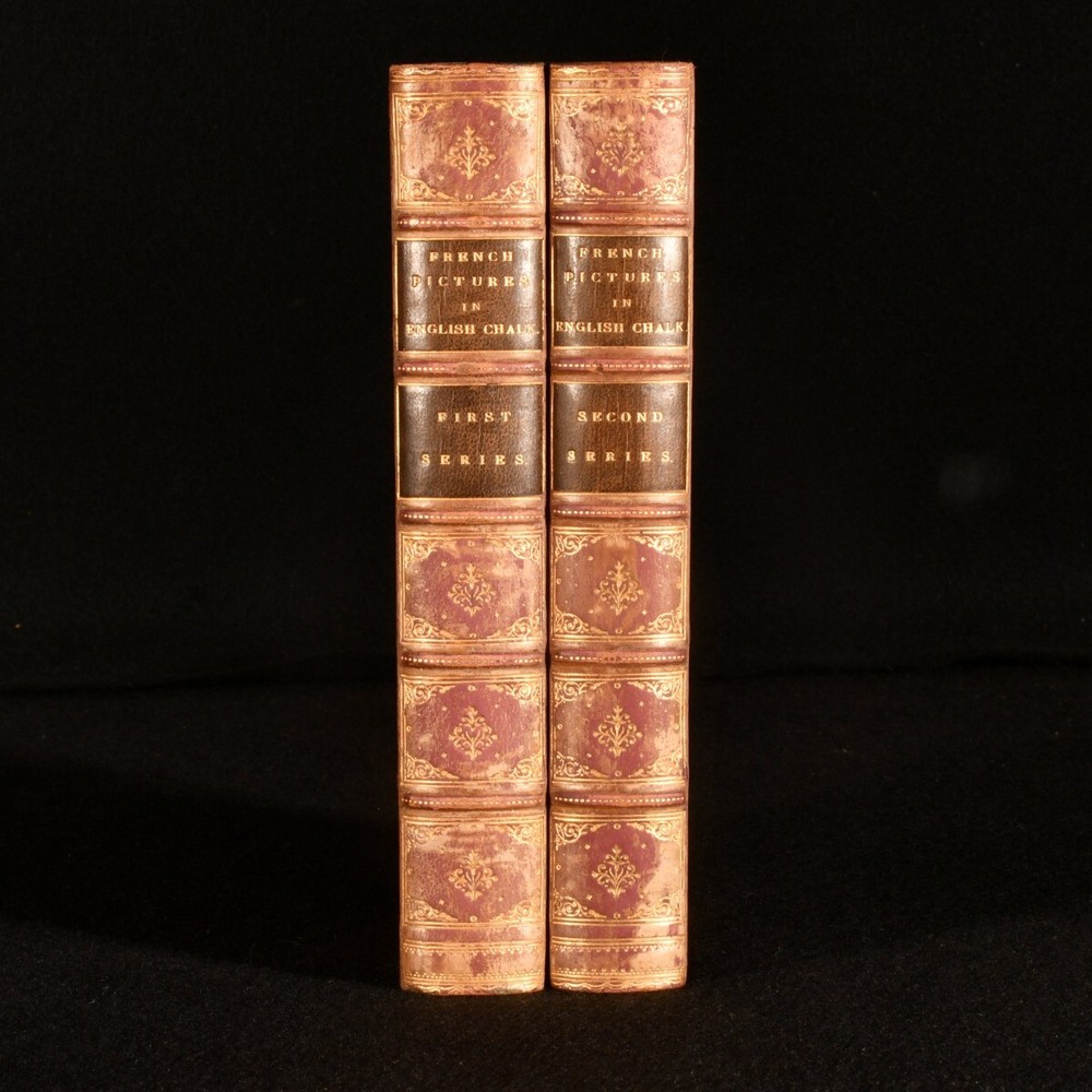 Click here to see our other books! French Pictures in English Chalk: First Series; Second Series The Author of "The Members for Paris" [Eustace C.G. Murray] 1876-8 Smith, Elder & Co. : London 7.5" by 4.5" [6], 406; [8], 389pp. SUMMARY A scarce pair of the first and second series of Eustace C.G. Murray's anthology of French tales; first editions in uniform charming half calf bindings. First Edition,Leather Binding,Pleasing Copy,Rebound,Scarce Overall Condition: Very Good Indeed This book weighs 1.5 KG when packed UK Postage: £ 3.99 US Postage: £ 23.99 EU Postage : £ 18.99 European Postage: £ 19.99 Asia Postage: £ 31.99 Worldwide Postage: £ 32.99 DESCRIPTION Two first editions. First and second series, each volume very scarce and rarely seen on the market. Containing a series of essays and sketches of France by Eustace C.G. Murray, illegitimate son of Richard Grenville, second Duke of Buckingham & Chandos. Eustace Murray was an anti-establishment English journalist; he moved to France to avoid a perjury charge, where he became well known as the "Comte de Rethel d'Aragon". He authored several novels and short satirical pieces, essays, and sketches for the English and American press. From the library of Egerton Parker, with his pictorial bookplates to front pastedowns. CONDITION Rebound in half calf with five raised bands, gilt tooling to spine, titles in gilt to morocco spine labels. Externally very smart with minor shelf wear only, back strip faded. Internally, firmly bound. Pages generally bright and clean. Overall Condition: Very Good Indeed GLOSSARY OF TERMS Overall Condition (Dustwrapper condition rating is shown after that for the book itself, where a dustwrapper is present) Fine - Very well preserved copy showing very little wear Very Good Indeed - Only one or two minor faults, really a very attractive copy Very Good - Quite a wide term meaning no major faults but probably several smaller ones often expected given the age of the book, but still a respectable copy Good - Meaning not very good. Some more serious faults as will be described in the condition report under 'condition' Good Only - Meaning one or more faults that could really do with repair Fair - As with good only above but with other faults leaving a compromised copy even after repair Poor - Really bad and possibly seriously incomplete. We only sell books in this condition where their rarity or value makes them attractive none the less. Major defects will be described. GUARANTEE We offer a full money back guarantee on our descriptions. Please ask for details and conditions. We prefer PAYPAL. If you pay via PAYPAL we will post the item off the same or the next working day with the postage you have selected. Please note we cannot accept USD cheques
