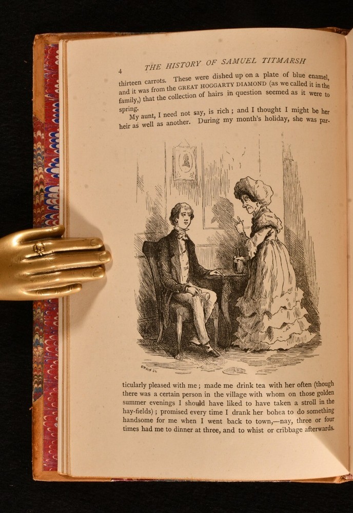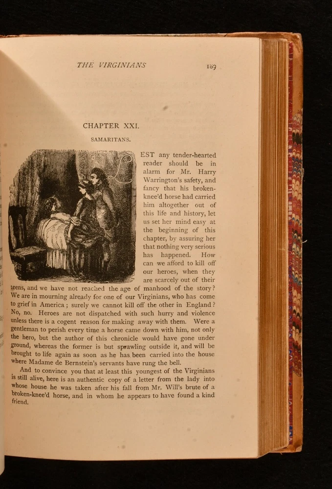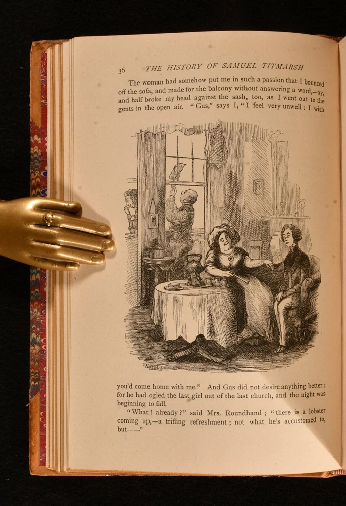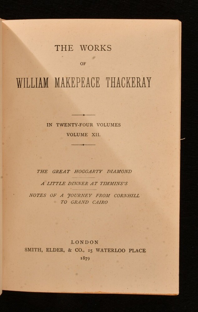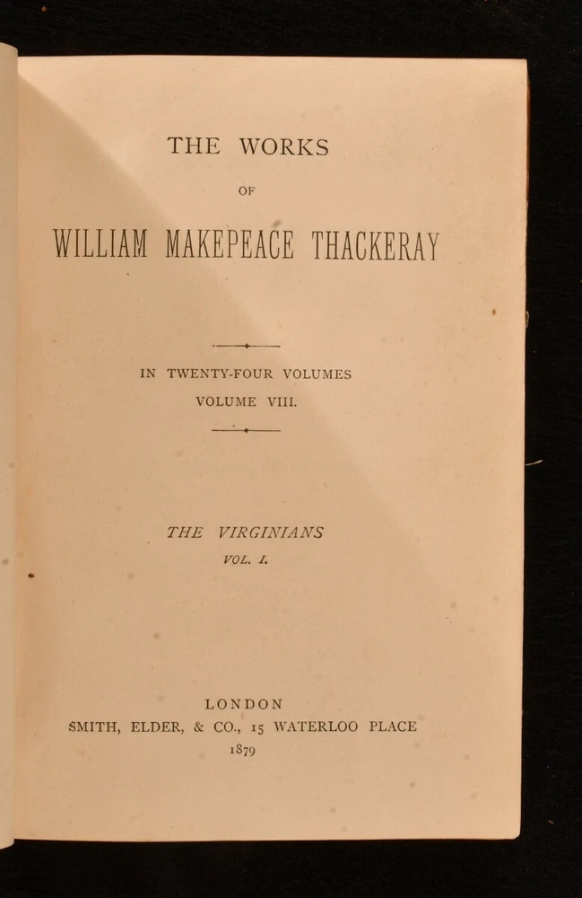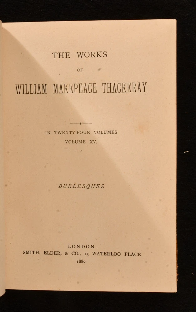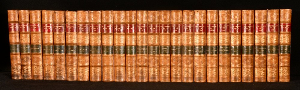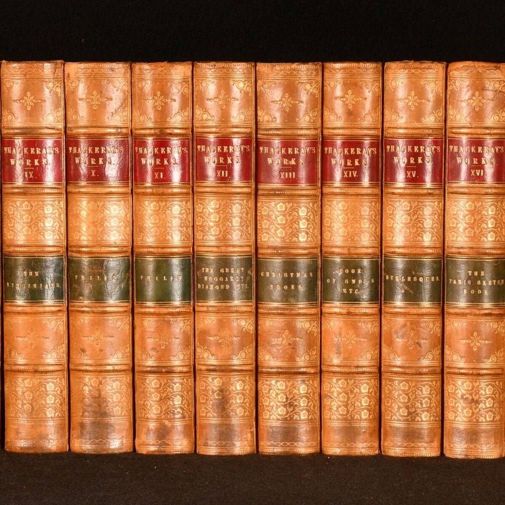 Click here to see our other books! The Works of William Makepeace Thackeray William Makepeace Thackeray 1879-1880 Smith, Elder, & Co : London 7.5" by 5.5" SUMMARY A complete set of twenty-four works by William Makepeace Thackeray, in a smart, uniform half calf binding. Illustrated,Leather Binding Overall Condition: Very Good This book weighs 20 KG when packed UK Postage: £ 4.49 US Postage: £ 89.99 EU Postage : £ 45.99 European Postage: £ 85.99 Asia Postage: £ 169.99 Worldwide Postage: £ 259.99 DESCRIPTION In a uniform, half calf binding with marbled boards. This collection is comprised of twenty-four volumes featuring the works of Thackeray. With illustrations throughout by the author himself, which he intended to be an integral part of the novel, contributing to the overall meaning. This includes Vanity Fair, Volume One; Vanity Fair, Volume Two; The History of Pendennis, Volume One; The History of Pendennis, Volume Two; The Newcomes, Volume One; The Newcomes, Volume Two; The History of Henry Esmond, Esq.; The Virginians, Volume One; The Virginians, Volume Two; The Adventures of Philip, Volume One; The Adventures of Philip, Volume Two; The Great Hoggarty Diamond, A Little Dinner at Timmins’s, Notes on a Journey from Cornhill to Grand Cairo; The Christmas Books of Mr M. A. Titmarsh; The Book of Snobs and Sketches and Travels in London; Burlesques; The Paris Sketch Book and Little Travels and Road-Side Sketches; The Memoirs of Mr. Charles J. Yellowplush, The Fitz-Boodle Papers, Cox’s Diary, Character Sketches; The Irish Sketch Book and Critical Reviews; Memoirs of Barry Lyndon, Esq. And The Fatal Boots; Catherine : A Story, Men’s Wives, The Bedford Row Conspiracy; Ballads and The Rose and The Ring; Roundabout Papers and The Second Funeral of Napoleon; The Four Georges, The English Humorists; Lovel The Widower, The Wolves and The Lamb, Denis Duval. William Makepeace Thackeray is best known for his satirical works regarding English society, particularly for 'Vanity Fair'. He often published under various pseudonyms in his youth to avoid personal criticism. He took up journalism, something he had dabbled with in the past, and wrote art critiques, short sketches, and reviewed books. He started writing longer works of fiction, whilst also contributing to popular magazines such as Punch. In the latter part of his life he achieved greater acclaim for his work and was considered the equal of Charles Dickens. With a binder stamp of Iredale Binder, Torquay, to the first blank of each volume. The ink stamp of Dr. G. A. F. Wilks to the reverse of the front endpaper of volume one - four. CONDITION In a uniform, half calf binding with marbled boards. Externally, smart, with light rubbing to the extremities and to the joints. Occasional mark to boards and loss to the leather. Slight rubbing to boards. The odd spot to the endpapers. Ink stamp to the reverse of the front endpaper of volumes one-four. Hinges slightly strained to some volumes, but holding firm to most volumes. Internally, firmly bound. Pages bright and clean, with the occasional spot, mainly to the first and last pages. Iredale Binder stamp to the first blank of each volume. Overall Condition: Very Good GLOSSARY OF TERMS Overall Condition (Dustwrapper condition rating is shown after that for the book itself, where a dustwrapper is present) Fine - Very well preserved copy showing very little wear Very Good Indeed - Only one or two minor faults, really a very attractive copy Very Good - Quite a wide term meaning no major faults but probably several smaller ones often expected given the age of the book, but still a respectable copy Good - Meaning not very good. Some more serious faults as will be described in the condition report under 'condition' Good Only - Meaning one or more faults that could really do with repair Fair - As with good only above but with other faults leaving a compromised copy even after repair Poor - Really bad and possibly seriously incomplete. We only sell books in this condition where their rarity or value makes them attractive none the less. Major defects will be described. GUARANTEE We offer a full money back guarantee on our descriptions. Please ask for details and conditions. We prefer PAYPAL. If you pay via PAYPAL we will post the item off the same or the next working day with the postage you have selected. Please note we cannot accept USD cheques