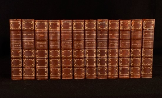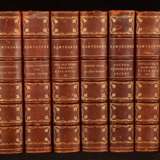 Click here to see our other books! The Works of Nathaniel Hawthorne Nathaniel Hawthorne 1882-1899 Houghton, Mifflin and Company : London 7.5" by 5" vi, 600pp; 588pp; 619pp; 637pp; 458pp; vi, 569pp; 659pp; xiii, 368pp; 521pp; 538pp; 527pp; 574pp SUMMARY Twelve volumes of The Works of Nathaniel Hawthorne. Decorative Binding,Illustrated,Leather Binding Overall Condition: Very Good This book weighs 10 KG when packed UK Postage: £ 4.49 US Postage: £ 68.99 EU Postage : £ 36.99 European Postage: £ 65.99 Asia Postage: £ 12999.00 Worldwide Postage: £ 229.99 DESCRIPTION Originally published individually with different dates to copyright pages, this previous owner has collected twelve of the thirteen volumes. I The Scarlet Letter and The Blithedale Romance II Our Old Home and English Notebooks I III Our Old Home and English Notebooks II IV A Wonder-Book, Tanglewood Tales and Grandfather's Chair V American Notebooks VI Tales, Sketches and Other Papers. With a Biographical Sketch by George Parsons Lathrop VII Mosses From an Old Manse VIII Doctor Grimshawe's Secret IX The Dolliver Romance, Danshawe, Septimus Felton, With an Appendic Containing The Anestral Footstep X Twice Told Tales XI The Marble Faun XI French and Italian Notebooks Collated, appears to be lacking The House of Seven Gables and The Snow Image. With an illustrated frontispiece to each volume and an additional two facsimile plates to the start of Dr Grimshawe's Secret. Nathaniel Hawthorne was an Amerian novelist, Dark Romantic, and short story writer. Much of his writing centres on New England, with many featuring moral allegories with Puritan inspiration. His fictional writings are in the Romantic canon, more specifically, Dark Romanticism. CONDITION In uniformly bound half morocco with marbled paper covered boards. Gilt stamped detailing to spines with the top edge gilted also. Externally, smart with rubbing to the spines and joints, particularly to the head and tail. Minor losses to the head of volumes XII, XI, I and VI. Small loss to volume V and the head of the front joint. Volumes II and IV have very minor losses to the head and tail of spines. Volumes X and XI are particularly rubbed to spines. Volume XII has a small loss to the top raised band. Front hinge to volume VI is slightly strained but firm with the endpapers separating from textblock, though still bound to front pastedown. Prior owner's bookplate to front pastedown, D M Coffin. Internally, all volumes are firmly bound. Pages are very bright with instances of scattered spots throughout. Overall Condition: Very Good GLOSSARY OF TERMS Overall Condition (Dustwrapper condition rating is shown after that for the book itself, where a dustwrapper is present) Fine - Very well preserved copy showing very little wear Very Good Indeed - Only one or two minor faults, really a very attractive copy Very Good - Quite a wide term meaning no major faults but probably several smaller ones often expected given the age of the book, but still a respectable copy Good - Meaning not very good. Some more serious faults as will be described in the condition report under 'condition' Good Only - Meaning one or more faults that could really do with repair Fair - As with good only above but with other faults leaving a compromised copy even after repair Poor - Really bad and possibly seriously incomplete. We only sell books in this condition where their rarity or value makes them attractive none the less. Major defects will be described. GUARANTEE We offer a full money back guarantee on our descriptions. Please ask for details and conditions. We prefer PAYPAL. If you pay via PAYPAL we will post the item off the same or the next working day with the postage you have selected. Please note we cannot accept USD cheques