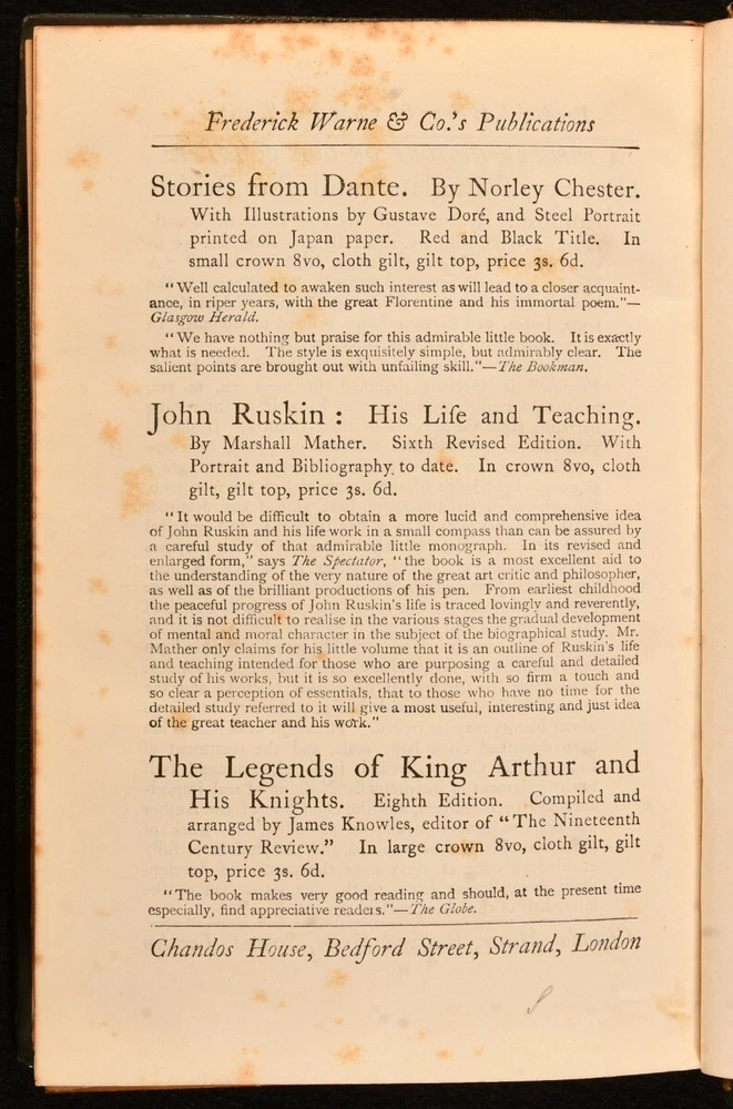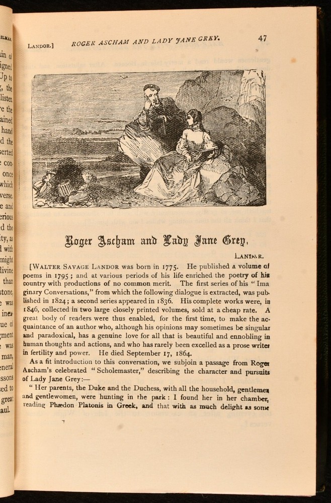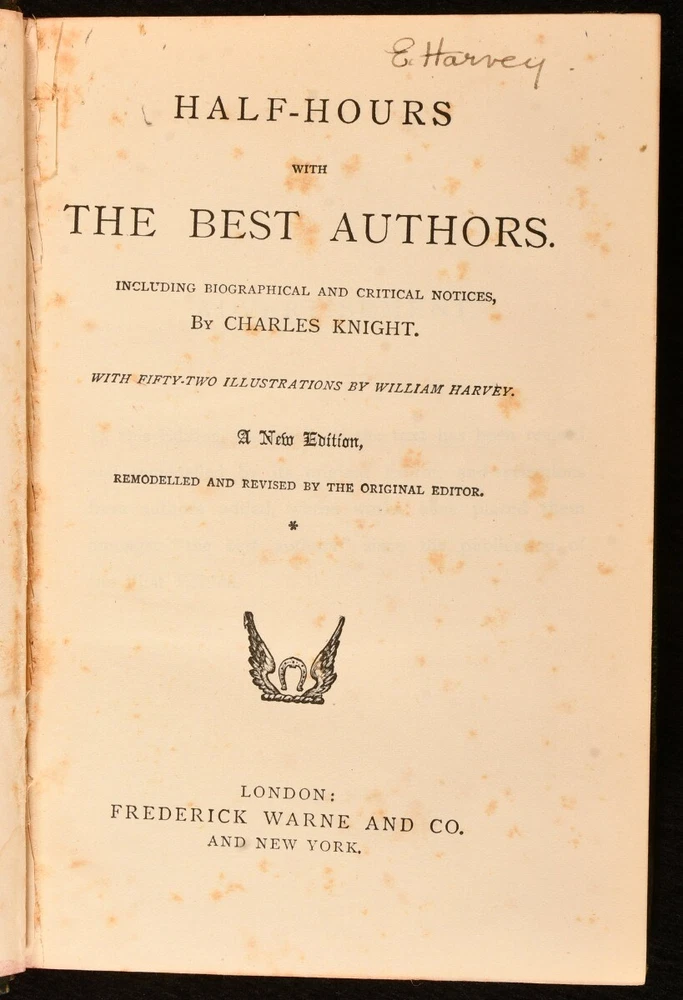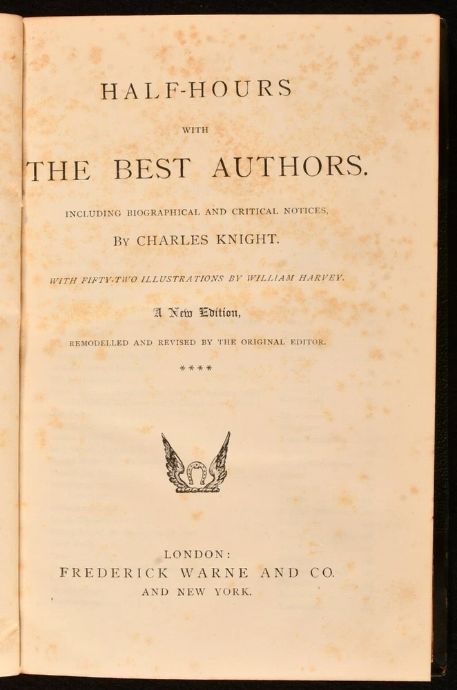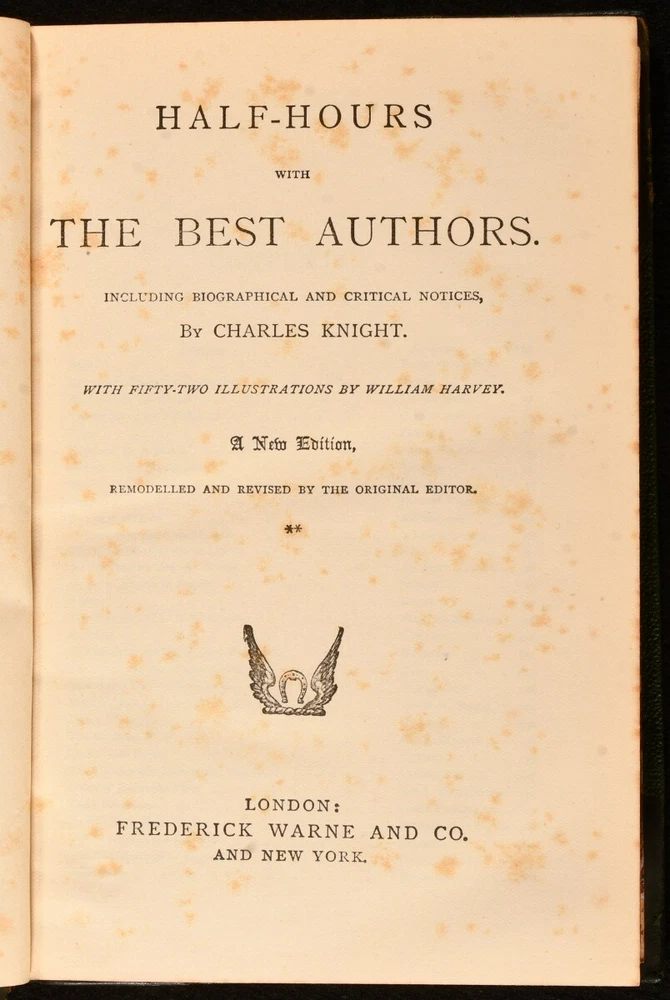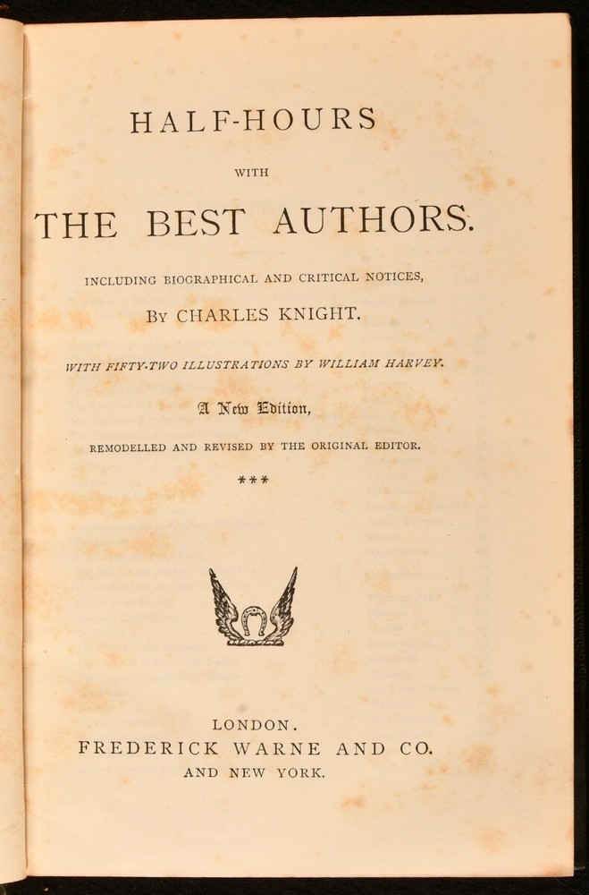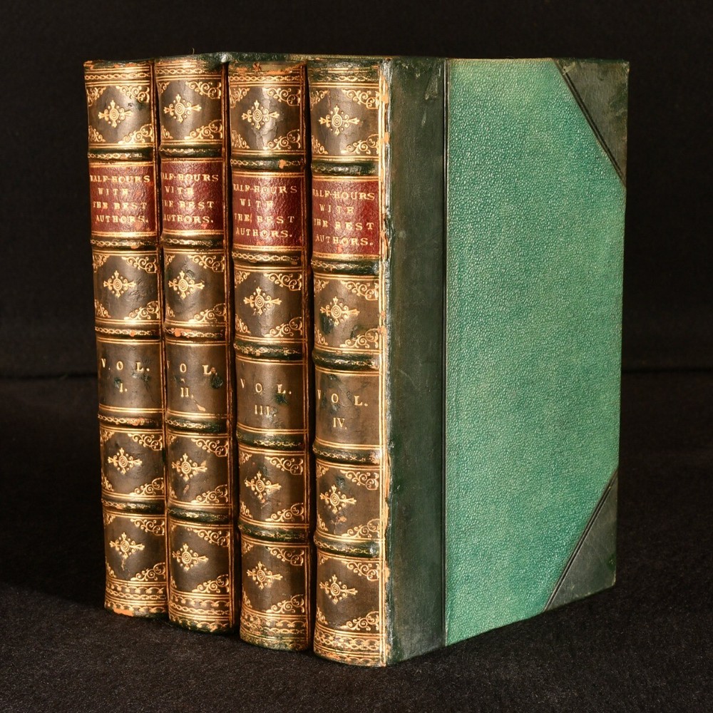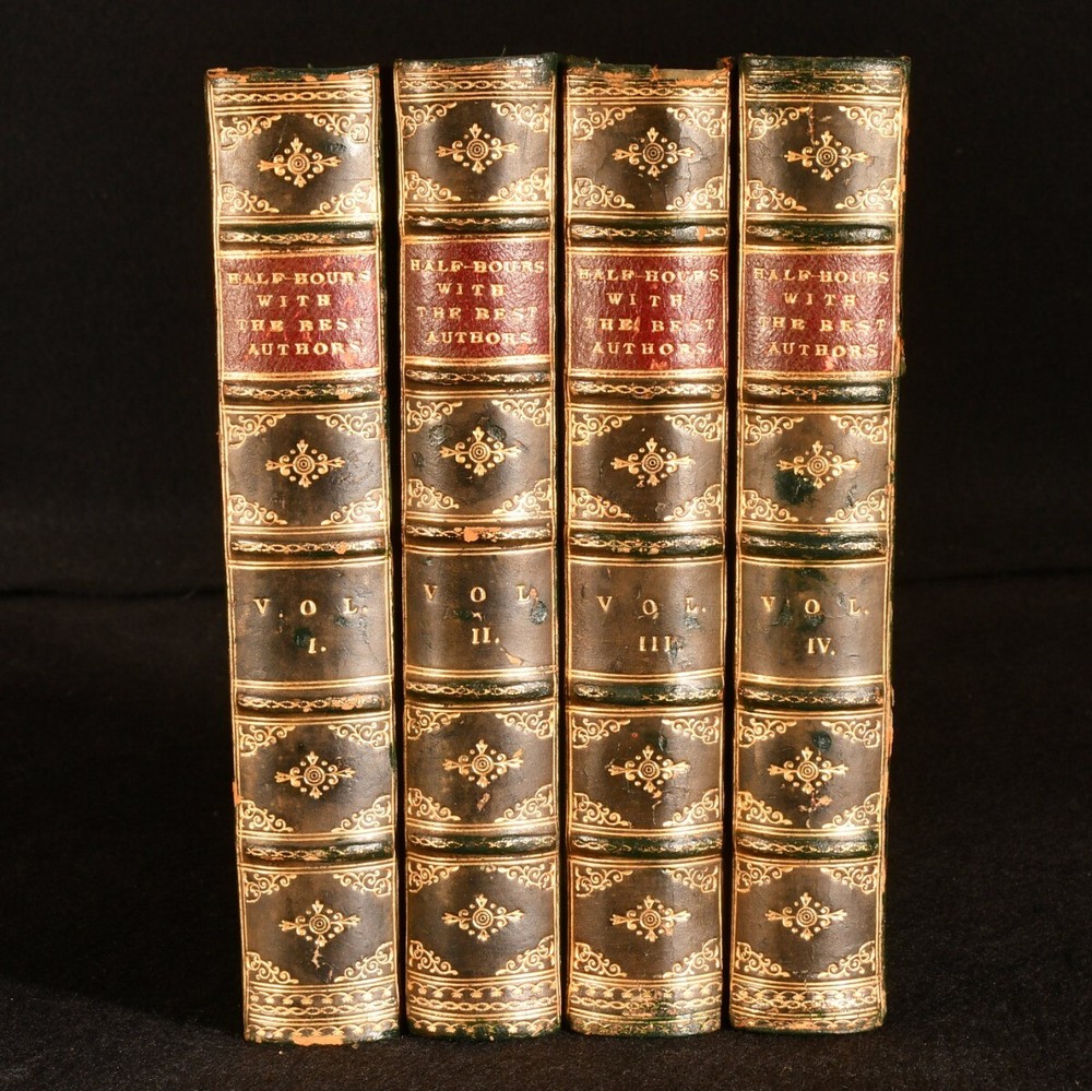 Click here to see our other books! Half-Hours with the Best Authors Charles Knight [ed.] 1885 Frederick Warne and Co : London 8" by 5.5" viii [1], 2-576; 557 [3]; 565; 543pp SUMMARY A smart four volume set of Charles Knight's anthology of short writings by important authors, with vignette illustrations throughout. Illustrated,Leather Binding Overall Condition: Good This book weighs 4 KG when packed UK Postage: £ 4.49 US Postage: £ 39.99 EU Postage : £ 26.99 European Postage: £ 36.99 Asia Postage: £ 65.99 Worldwide Postage: £ 99.99 DESCRIPTION A four volume 'New Edition' of this extensive anthology, which presents a collection of excerpts from various influential British authors throughout history, including Milton, Pope, Dante, Donne, Dr Kitto, Dryden and more. With vignette illustrations throughout by William Harvey. With the inscription of E. Harvey to the title page of volume I, and the half titles of volumes II-IV. Lacking the volume I half title. With an advertisement to the rear of volume II. Undated; dated 1885 via Jisc. CONDITION In half calf bindings, with cloth covered boards. Gilt detailing to back strip. Rubbing to spine heads, with small loss to head of volume III. Minor rubbing to joints of volumes III and IV. Hinges of volumes I and III and front hinge of volume II and IV strained, but firmly held. Volumes I, III and IV lacking a front blank, with volume I lacking half title. Inscription to half title of volumes II, III and IV, and to the title page of volume I. Internally, firmly bound. Pages bright, but with spotting and instances of foxing throughout. Overall Condition: Good GLOSSARY OF TERMS Overall Condition (Dustwrapper condition rating is shown after that for the book itself, where a dustwrapper is present) Fine - Very well preserved copy showing very little wear Very Good Indeed - Only one or two minor faults, really a very attractive copy Very Good - Quite a wide term meaning no major faults but probably several smaller ones often expected given the age of the book, but still a respectable copy Good - Meaning not very good. Some more serious faults as will be described in the condition report under 'condition' Good Only - Meaning one or more faults that could really do with repair Fair - As with good only above but with other faults leaving a compromised copy even after repair Poor - Really bad and possibly seriously incomplete. We only sell books in this condition where their rarity or value makes them attractive none the less. Major defects will be described. GUARANTEE We offer a full money back guarantee on our descriptions. Please ask for details and conditions. We prefer PAYPAL. If you pay via PAYPAL we will post the item off the same or the next working day with the postage you have selected. Please note we cannot accept USD cheques