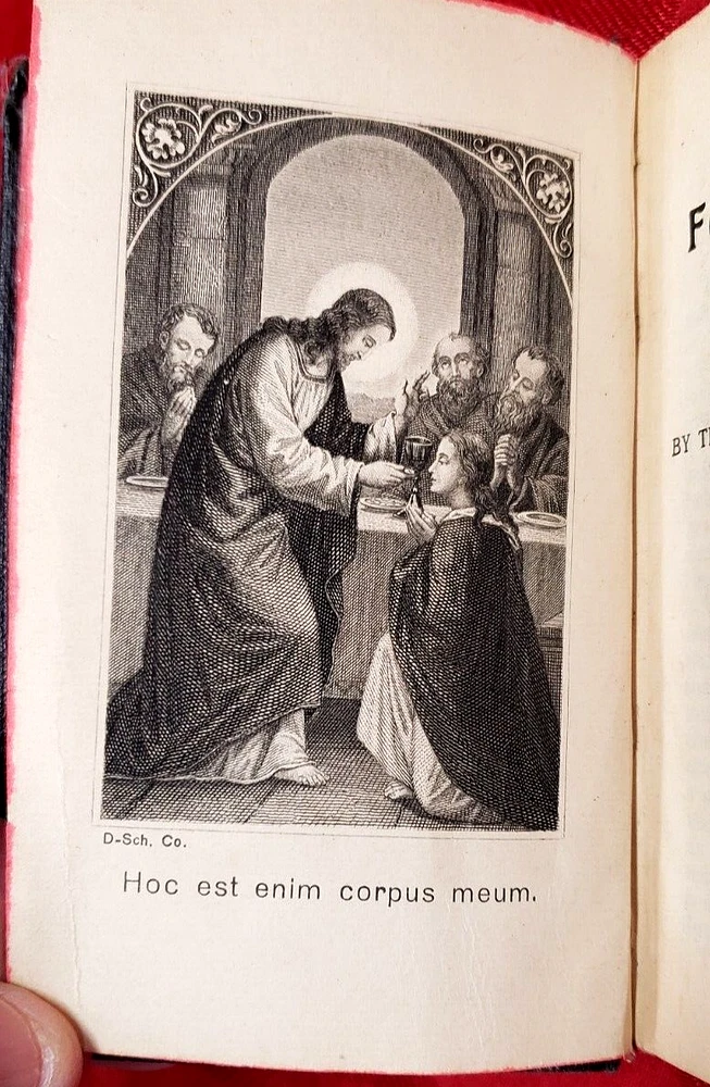 RARE. This is a Full Leather, pliable, somewhat stiff softcover. The book is undated, but probably dates to circa 1890. It's a full leather and older looking binding than the only other copy I can find worldwide which was published in 1914. It offers prayers, lifestyle guidance, encouragement, and a guide for Catholic Mass. The only Latin is the caption "This is my body" under the frontispiece illustration, the only illustration in the book. It's 441 pages and measures approximately 3 inches wide by around 4 3/4 inches high and has faded red page edges The book is in near VERY GOOD Condition with some soiling and wear, moderate wear to the spine with binding showing through in spots. The only writing is some light penciling to the last blank page, no loose, torn or missing pages and it has a tight, firm binding. Rare. This item is being sold by Books and Collectibles, LLC. International buyers pay $6.99 shipping to eBay hub. U.S. Shipping is $6.99 for USPS Ground Advantage insured. If you buy more than one book for sale right now I will combine shipping costs and save you money. ADD AS MANY ADDITIONAL BOOKS FOR AN ADDITIONAL $2.00 PER BOOK & SAVE MONEY. How? Add $2 extra for each additional one purchased to the one with the highest priced shipping cost. Let me know when you are done and I will send you an adjusted invoice with the new, discounted shipping cost. Wait to pay until I have invoiced you the adjustment and have let you know. example: you bought 4 books with shipping costs of three at $5.99 shipping each and one at $6.99 shipping. The new, combined shipping cost will be $12.99 for all four instead of $24.96.