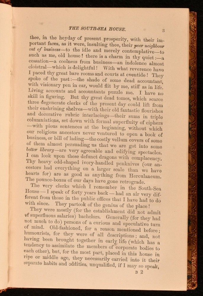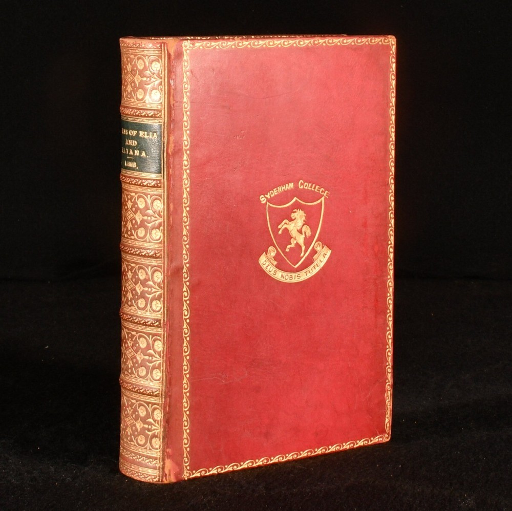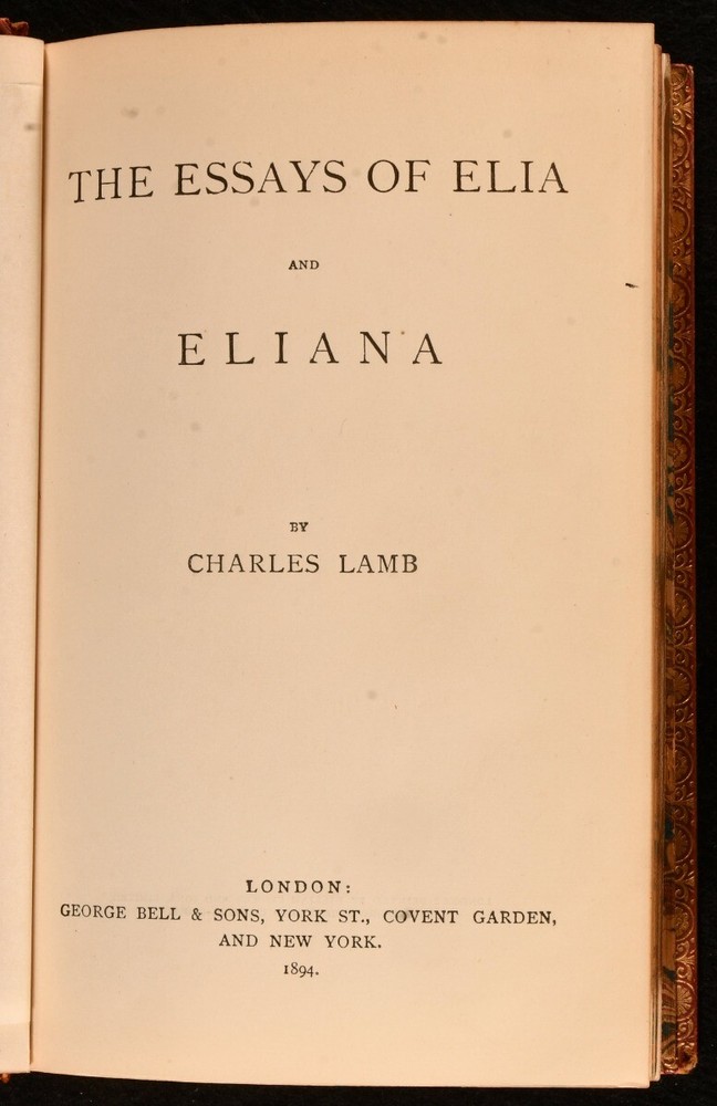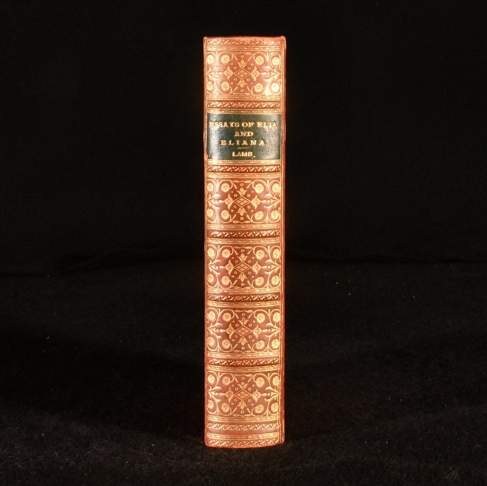 Click here to see our other books! The Essays of Elia and Eliana Charles Lamb 1894 George Bell and Sons : London 7" by 4.5" xi, 512pp SUMMARY A smart leather prize bound copy of this popular collection of essays by Charles Lamb. Leather Binding,Prize Binding Overall Condition: Very Good Indeed This book weighs 0.5 KG when packed UK Postage: £ 3.99 US Postage: £ 15.99 EU Postage : £ 13.99 European Postage: £ 14.99 Asia Postage: £ 18.99 Worldwide Postage: £ 19.99 DESCRIPTION In prize binding for Sydenham College. Charles Lamb was an English essayist, poet and antiquarian best known for this work of essays. This collection of essays contains The Essays of Elia, The Last Essays of Elia and Eliana. With a frontispiece of the author. CONDITION In full calf binding. Externally, excellent with some light rubbing to the spine. Prize inscription to the reverse of the front free endpaper dated 1896. Internally, firmly bound with bright and clean pages. Overall Condition: Very Good Indeed GLOSSARY OF TERMS Overall Condition (Dustwrapper condition rating is shown after that for the book itself, where a dustwrapper is present) Fine - Very well preserved copy showing very little wear Very Good Indeed - Only one or two minor faults, really a very attractive copy Very Good - Quite a wide term meaning no major faults but probably several smaller ones often expected given the age of the book, but still a respectable copy Good - Meaning not very good. Some more serious faults as will be described in the condition report under 'condition' Good Only - Meaning one or more faults that could really do with repair Fair - As with good only above but with other faults leaving a compromised copy even after repair Poor - Really bad and possibly seriously incomplete. We only sell books in this condition where their rarity or value makes them attractive none the less. Major defects will be described. GUARANTEE We offer a full money back guarantee on our descriptions. Please ask for details and conditions. We prefer PAYPAL. If you pay via PAYPAL we will post the item off the same or the next working day with the postage you have selected. Please note we cannot accept USD cheques