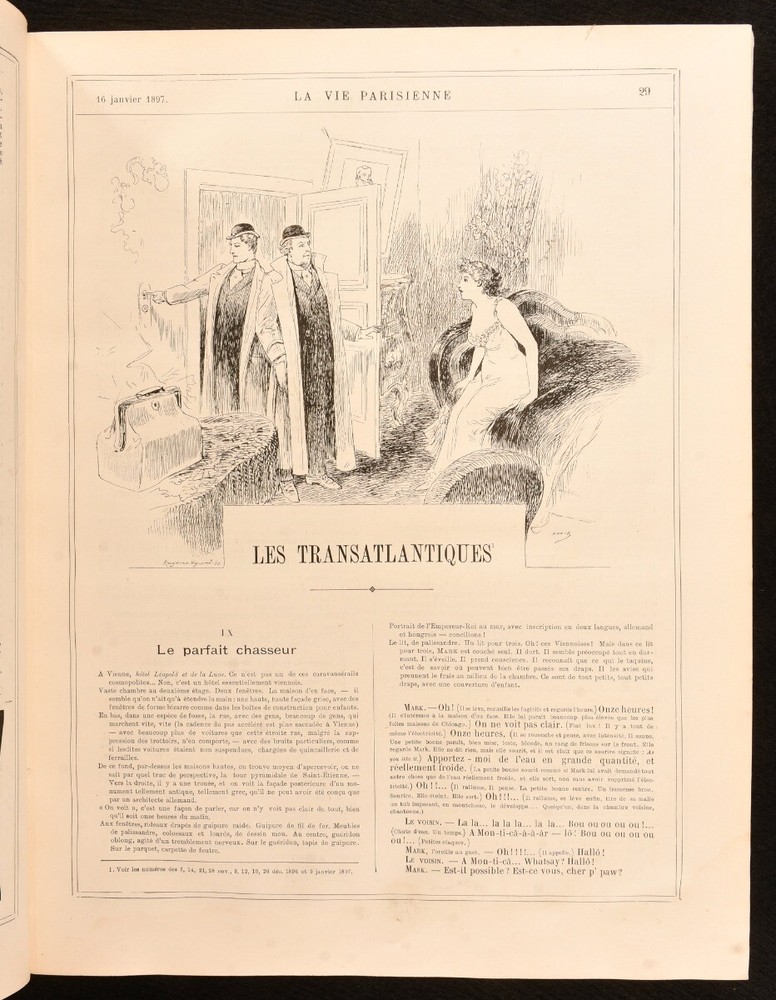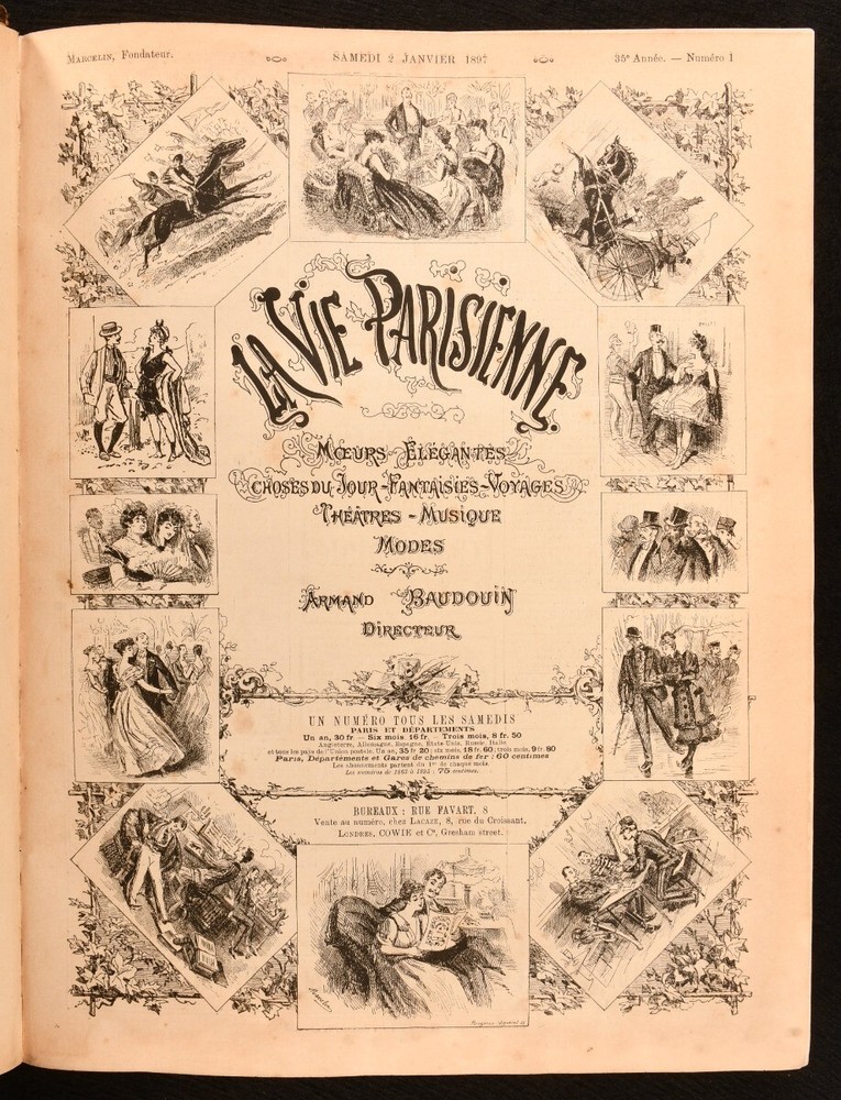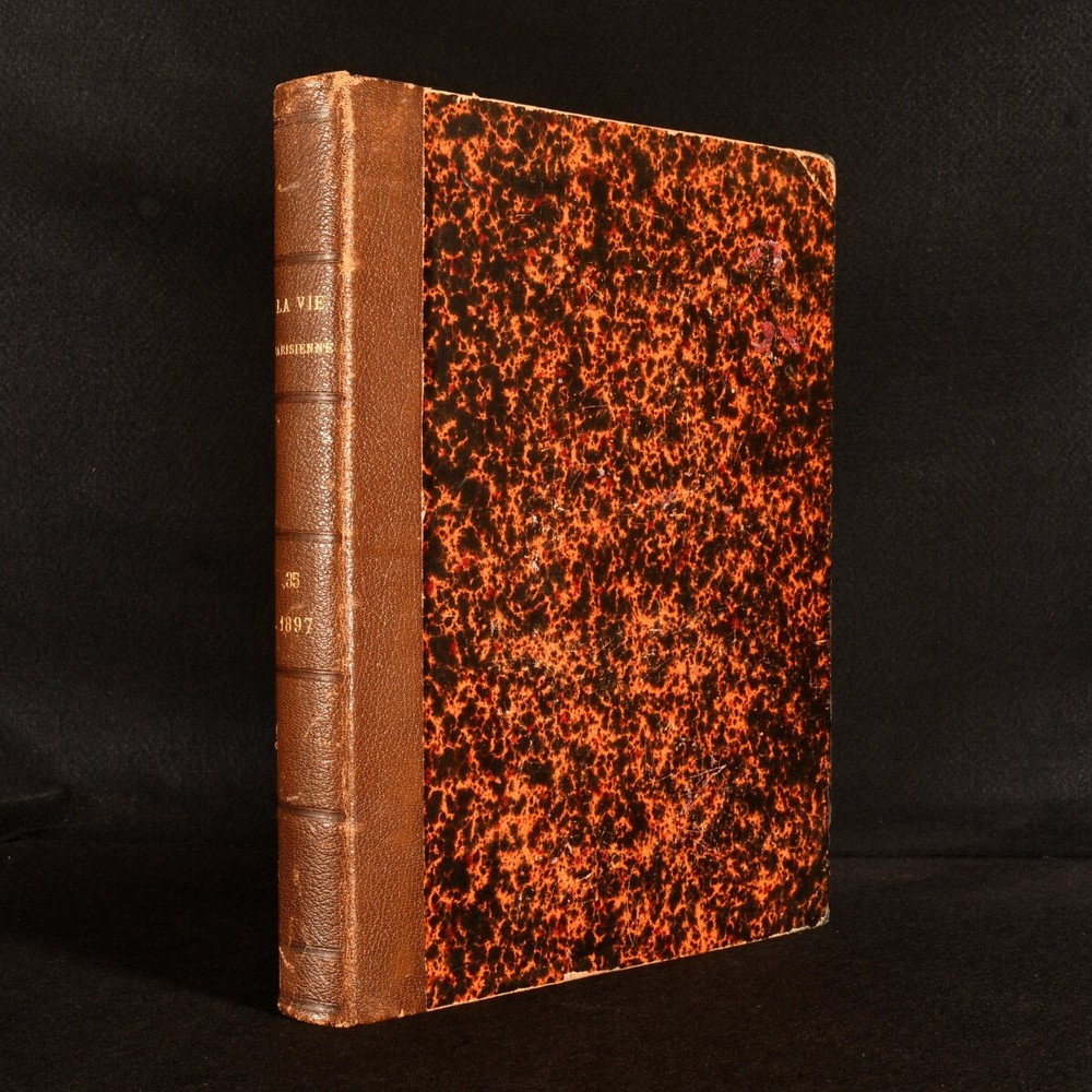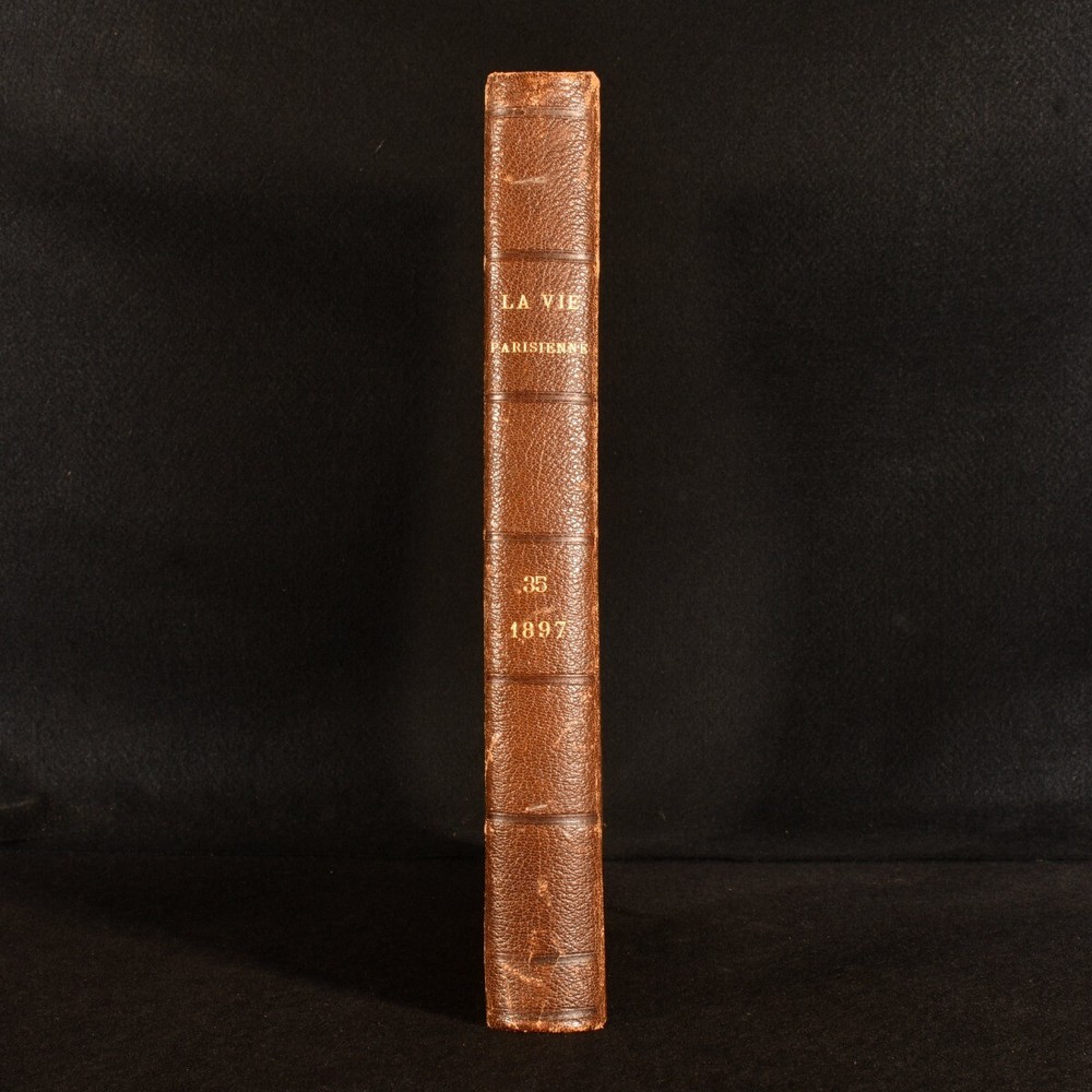 Click here to see our other books! La Vie Parisienne 35 Annee Janvier - Decembre 1897 Various 1897 Chez Lacaze : Paris 14" by 11" 748pp. SUMMARY A smart collection of the issues of La Vie Parisinne magazine for the year 1857, bound in one volume. In the original French. Illustrated,Leather Binding Overall Condition: Good This book weighs 3 KG when packed UK Postage: £ 3.99 US Postage: £ 36.99 EU Postage : £ 25.99 European Postage: £ 27.99 Asia Postage: £ 47.99 Worldwide Postage: £ 69.99 DESCRIPTION French. Illustrated throughout. La Vie Parisienne was a French weekly magazine founded in Paris in 1863 and was published until 1970. The articles covered reviews of novels, sports, theater, music and the arts, with short stories, veiled gossip and fashion banter added later. Notable contributors include: George Barbier, Colette, Fabien Fabiano, Henry Gerbault, Gerda Wegener, and many others. This volume contains each weekly issue from the year 1897 from 2nd January to 25th December. CONDITION Bound in half brown crushed morocco with marbled boards. Externally, smart with rubbing to the extremities and loss of the leather to the board tips. Minor fading to the spine with the odd small mark to the boards. Hinges starting but firm. Internally, firmly bound. Pages are very bright and clean with the odd spot or handling mark. Light tide marks to the rear pages. Age toning to the endpapers. Front free endpaper lightly chipped with sympathetic repairs made with brown paper. Overall Condition: Good GLOSSARY OF TERMS Overall Condition (Dustwrapper condition rating is shown after that for the book itself, where a dustwrapper is present) Fine - Very well preserved copy showing very little wear Very Good Indeed - Only one or two minor faults, really a very attractive copy Very Good - Quite a wide term meaning no major faults but probably several smaller ones often expected given the age of the book, but still a respectable copy Good - Meaning not very good. Some more serious faults as will be described in the condition report under 'condition' Good Only - Meaning one or more faults that could really do with repair Fair - As with good only above but with other faults leaving a compromised copy even after repair Poor - Really bad and possibly seriously incomplete. We only sell books in this condition where their rarity or value makes them attractive none the less. Major defects will be described. GUARANTEE We offer a full money back guarantee on our descriptions. Please ask for details and conditions. We prefer PAYPAL. If you pay via PAYPAL we will post the item off the same or the next working day with the postage you have selected. Please note we cannot accept USD cheques