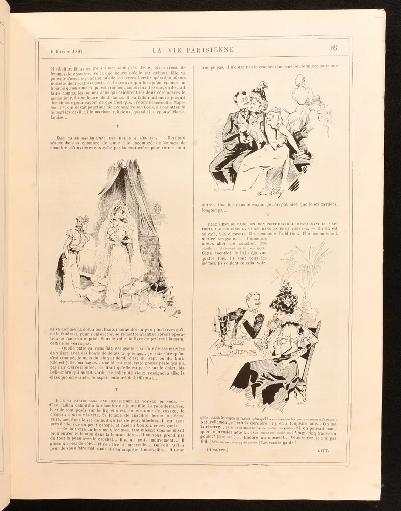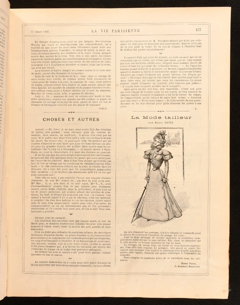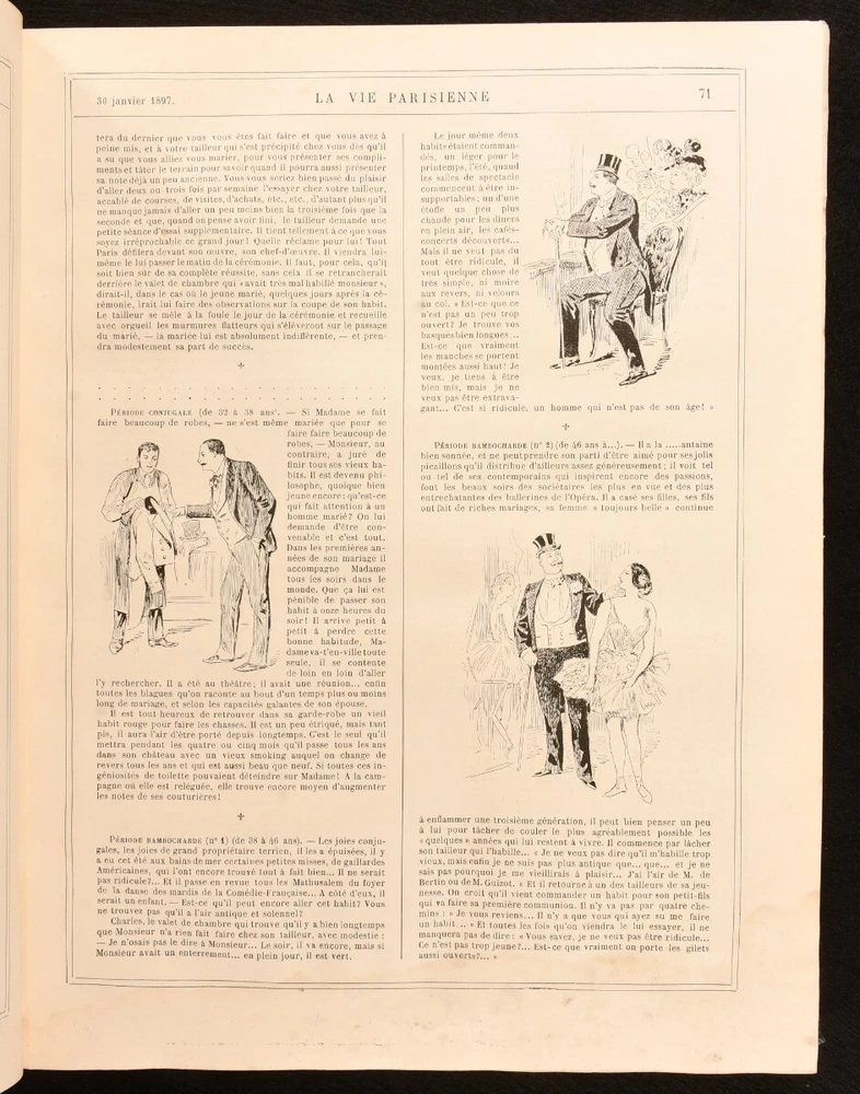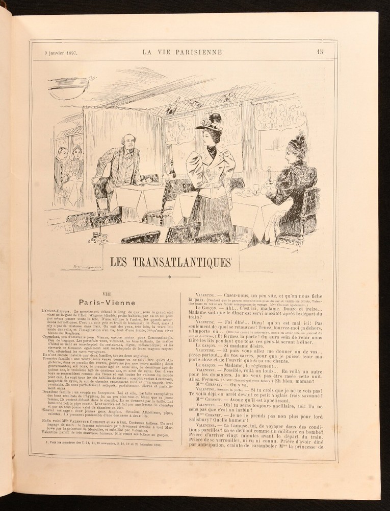 Click here to see our other books! La Vie Parisienne 35 Annee Janvier - Decembre 1897 Various 1897 Chez Lacaze : Paris 14" by 11" 748pp. SUMMARY A smart collection of the issues of La Vie Parisinne magazine for the year 1857, bound in one volume. In the original French. Illustrated,Leather Binding Overall Condition: Good This book weighs 3 KG when packed UK Postage: £ 3.99 US Postage: £ 36.99 EU Postage : £ 25.99 European Postage: £ 27.99 Asia Postage: £ 47.99 Worldwide Postage: £ 69.99 DESCRIPTION French. Illustrated throughout. La Vie Parisienne was a French weekly magazine founded in Paris in 1863 and was published until 1970. The articles covered reviews of novels, sports, theater, music and the arts, with short stories, veiled gossip and fashion banter added later. Notable contributors include: George Barbier, Colette, Fabien Fabiano, Henry Gerbault, Gerda Wegener, and many others. This volume contains each weekly issue from the year 1897 from 2nd January to 25th December. CONDITION Bound in half brown crushed morocco with marbled boards. Externally, smart with rubbing to the extremities and loss of the leather to the board tips. Minor fading to the spine with the odd small mark to the boards. Hinges starting but firm. Internally, firmly bound. Pages are very bright and clean with the odd spot or handling mark. Light tide marks to the rear pages. Age toning to the endpapers. Front free endpaper lightly chipped with sympathetic repairs made with brown paper. Overall Condition: Good GLOSSARY OF TERMS Overall Condition (Dustwrapper condition rating is shown after that for the book itself, where a dustwrapper is present) Fine - Very well preserved copy showing very little wear Very Good Indeed - Only one or two minor faults, really a very attractive copy Very Good - Quite a wide term meaning no major faults but probably several smaller ones often expected given the age of the book, but still a respectable copy Good - Meaning not very good. Some more serious faults as will be described in the condition report under 'condition' Good Only - Meaning one or more faults that could really do with repair Fair - As with good only above but with other faults leaving a compromised copy even after repair Poor - Really bad and possibly seriously incomplete. We only sell books in this condition where their rarity or value makes them attractive none the less. Major defects will be described. GUARANTEE We offer a full money back guarantee on our descriptions. Please ask for details and conditions. We prefer PAYPAL. If you pay via PAYPAL we will post the item off the same or the next working day with the postage you have selected. Please note we cannot accept USD cheques