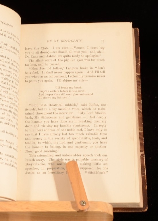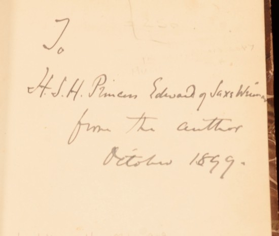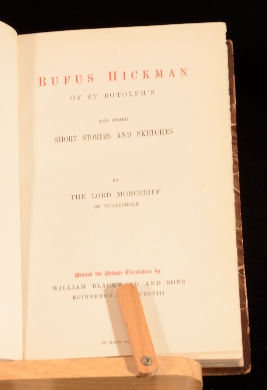 Click here to see our other books! Rufus Hickman of St Botolph's and Other Stories and Sketches Lord Moncrieff 1898 Printed for Private Circulation by William Blackwood and Sons : Edinburgh 7.5" by 4.5" 274pp SUMMARY A presentation copy of this collection of short stories by Lord Moncrieff. Leather Binding,Signed Overall Condition: Very Good This book weighs 0.5 KG when packed UK Postage: £ 3.99 US Postage: £ 15.99 EU Postage : £ 13.99 European Postage: £ 14.99 Asia Postage: £ 18.99 Worldwide Postage: £ 19.99 DESCRIPTION Signed, 'To H. S. H. Princess Edward of Saxe-Weimar from the author, October 1899'. On 27 November 1851 Prince William Augustus Edward of Saxe-Weimar-Eisenach married, morganatically, Lady Augusta Katherine Gordon-Lennox, (a daughter of Charles Gordon-Lennox, 5th Duke of Richmond), who was created Countess of Dornburg by the Grand Duke of Saxe-Weimar the day before the wedding. The Court Circular shows that she was usually known by that title until early 1886, when the Circular began to consistently refer to her by her husband's title, i.e. "HSH Princess Edward of Saxe-Weimar". They had no children. CONDITION In a half-morocco binding with marbled boards. Externally, generally smart, though with some slight rubbing. Internally, firmly bound. Pages are bright and clean. Overall Condition: Very Good GLOSSARY OF TERMS Overall Condition (Dustwrapper condition rating is shown after that for the book itself, where a dustwrapper is present) Fine - Very well preserved copy showing very little wear Very Good Indeed - Only one or two minor faults, really a very attractive copy Very Good - Quite a wide term meaning no major faults but probably several smaller ones often expected given the age of the book, but still a respectable copy Good - Meaning not very good. Some more serious faults as will be described in the condition report under 'condition' Good Only - Meaning one or more faults that could really do with repair Fair - As with good only above but with other faults leaving a compromised copy even after repair Poor - Really bad and possibly seriously incomplete. We only sell books in this condition where their rarity or value makes them attractive none the less. Major defects will be described. GUARANTEE We offer a full money back guarantee on our descriptions. Please ask for details and conditions. We prefer PAYPAL. If you pay via PAYPAL we will post the item off the same or the next working day with the postage you have selected. Please note we cannot accept USD cheques