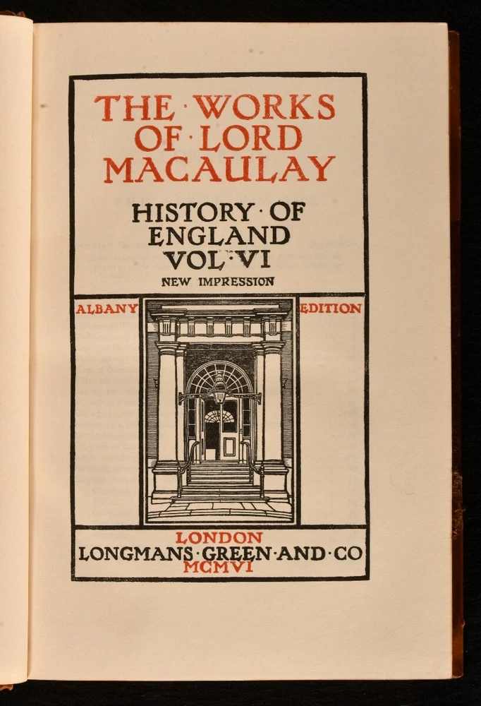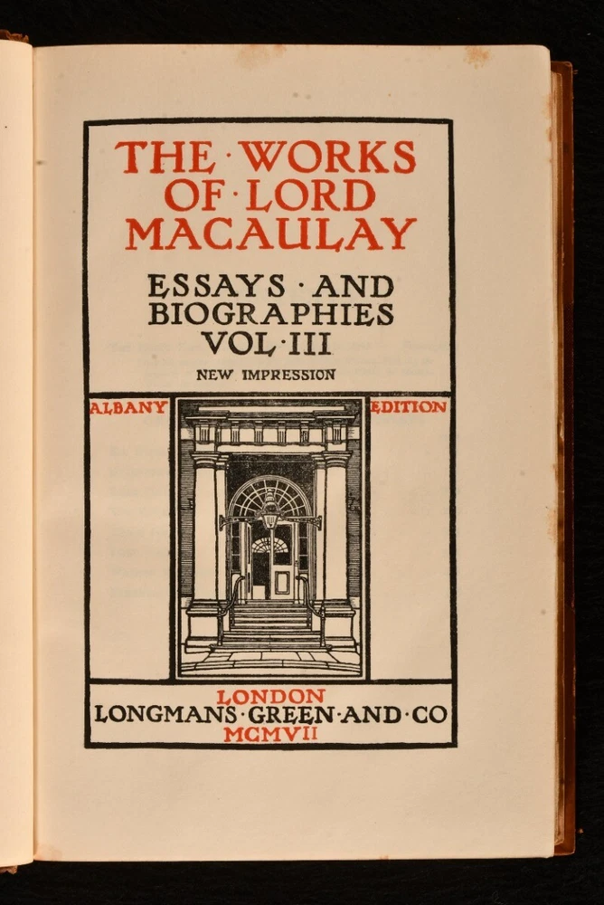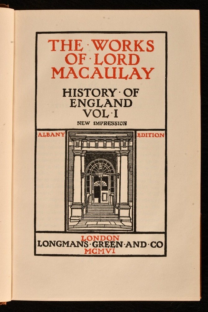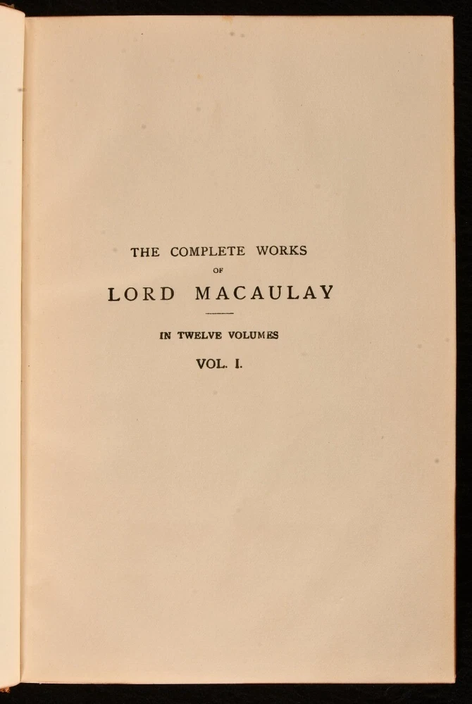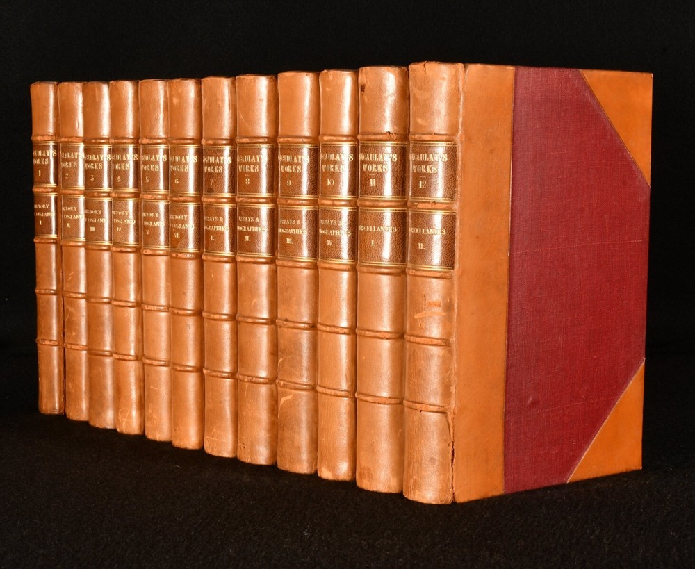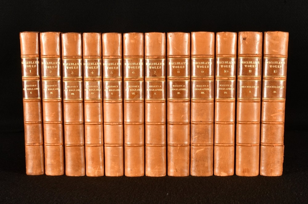 Click here to see our other books! The Works of Lord Macaulay Lord Macaulay [Thomas Babington Macaulay] 1898-1906 Longmans, Green and Co. : London 8" by 5" SUMMARY Complete group of twelve volumes containing the collected works of Lord Macaulay, in charming uniform Hatchards binding. Leather Binding,Rebound,Signed Binding Overall Condition: Very Good Indeed This book weighs 10 KG when packed UK Postage: £ 4.49 US Postage: £ 68.99 EU Postage : £ 36.99 European Postage: £ 65.99 Asia Postage: £ 129.99 Worldwide Postage: £ 229.99 DESCRIPTION Twelve volumes from the Albany edition of the works of Lord Macaulay. A miscellany of impressions: new impressions vols I-VII, IX-X (1905-7), first thus vols. VIII, XI-XII (1898). Comprising Thomas Babington Macaulay's complete works, including his commended work The History of England in six volumes, as well as essays and biographies in four volumes, and miscellanies in two volumes. A delightful group rebound in uniform half calf signed Hatchards. Each volume complete with half title and frontispiece portrait of the author. Lord Macaulay was a British historian and prominent Whig politician. From the library of Sir William Eden, Bart. CONDITION Rebound in half calf over cloth covered boards. Externally very smart with minor shelf wear only, light rubbing to back strip, joints, front joint only starting to vol. 12, boards holding firm. Sir William Eden's armorial bookplate to front pastedown. Internally, firmly bound. Occasional minor spotting to endpapers, otherwise pages bright and clean. Overall Condition: Very Good Indeed GLOSSARY OF TERMS Overall Condition (Dustwrapper condition rating is shown after that for the book itself, where a dustwrapper is present) Fine - Very well preserved copy showing very little wear Very Good Indeed - Only one or two minor faults, really a very attractive copy Very Good - Quite a wide term meaning no major faults but probably several smaller ones often expected given the age of the book, but still a respectable copy Good - Meaning not very good. Some more serious faults as will be described in the condition report under 'condition' Good Only - Meaning one or more faults that could really do with repair Fair - As with good only above but with other faults leaving a compromised copy even after repair Poor - Really bad and possibly seriously incomplete. We only sell books in this condition where their rarity or value makes them attractive none the less. Major defects will be described. GUARANTEE We offer a full money back guarantee on our descriptions. Please ask for details and conditions. We prefer PAYPAL. If you pay via PAYPAL we will post the item off the same or the next working day with the postage you have selected. Please note we cannot accept USD cheques