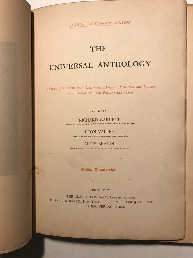 This is The Universal Anthology Authors Autograph Edition Volume Twenty Eight, leather bound. Cover is well worn, pages are vg, it has a page that says that the autograph edition is limited to 100 complete set and this is number_, there is no number written in.