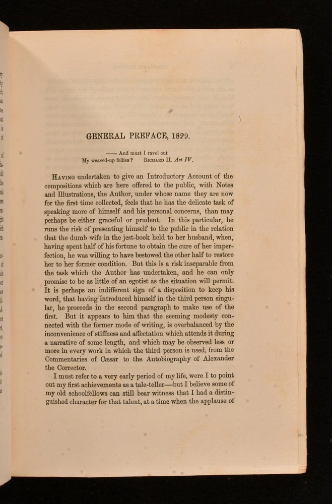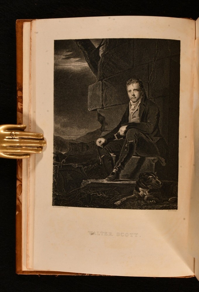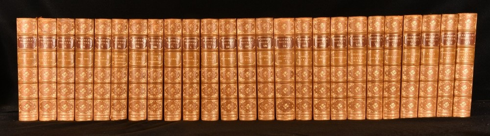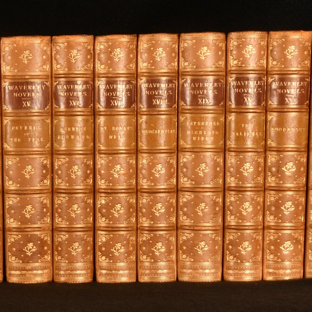 Click here to see our other books! The Waverley Novels Sir Walter Scott 1900 Adam and Charles Black : London 9.5" by 6.5" SUMMARY A complete Library Edition set of Sir Walter Scott's most popular novel series, The Waverley Novels, in attractive half leather binding. Fine Binding,Illustrated,Leather Binding Overall Condition: Near Fine This book weighs 30 KG when packed UK Postage: £ 4.49 US Postage: £ 99.99 EU Postage : £ 49.99 European Postage: £ 99.99 Asia Postage: £ 187.99 Worldwide Postage: £ 276.99 DESCRIPTION A complete Library Edition set of the popular Waverley Novels, by Sir Walter Scott. In attractive half calf binding with marbled boards. This series of novels was first published in 1814. The series became widely read in Europe, being known simply as The Waverley Novels, due to Scott not taking public authorship until 1827. The novels are set over a period of a eight hundred years, from 1097 with 'Count Robert of Paris' to the 19th century with 'St. Ronan's Well'. Scott took inspiration from his homeland of Scotland, setting fifteen out of the twenty-five novels there. 'Waverley', the first novel in this series has since been widely credited as one of the first pieces of historical fiction. Volume I, 'Waverley', illustrated with a frontispiece, engraved title page, and eight plates. Volume II, 'Guy Mannering', illustrated with a frontispiece, engraved title page, and seven plates. Volume III, 'The Antiquary', illustrated with a frontispiece, engraved title page, and five plates. Volume IV, 'Rob Roy', illustrated with a frontispiece, engraved title page, and six plates. Volume V, 'Old Morality', illustrated with a frontispiece, engraved title page, and six plates. Volume VI, 'Black Dwarf and Montrose', illustrated with a frontispiece, engraved title page, and five plates. Volume VII, 'Heart of Midlothian', illustrated with a frontispiece, engraved title page, and seven plates. Volume VIII, 'Bride of Lammermoor', illustrated with a frontispiece, engraved title page, and six plates. Volume IX, 'Ivanhoe', illustrated with a frontispiece, engraved title page, and five plates. Volume X, 'The Monastery', illustrated with a frontispiece, engraved title page, and five plates. Volume XI, 'The Abbot', illustrated with a frontispiece, engraved title page, and five plates. Volume XII, 'Kenilworth', illustrated with a frontispiece, engraved title page, and four plates. Volume XIII, 'The Pirate', illustrated with a frontispiece, engraved title page, and seven plates. Volume XIV, 'Fortunes of Nigel', illustrated with a frontispiece, engraved title page, and five plates. Volume XV, 'Peveril of the Peak', illustrated with a frontispiece, engraved title page, and eight plates. Volume XVI, 'Quentin Durward', illustrated with a frontispiece, engraved title page, and four plates. Volume XVII, 'St. Ronan's Well', illustrated with a frontispiece, engraved title page, and four plates. Volume XVIII, 'Redgauntlet', illustrated with a frontispiece, engraved title page, and four plates. Volume XIX, 'Betrothed and Highland Widow', illustrated with a frontispiece, engraved title page, and six plates. Volume XX, 'The Talisman', illustrated with a frontispiece, engraved title page, and five plates. Volume XXI, 'Woodstock', illustrated with a frontispiece, engraved title page, and seven plates. Volume XXII, 'Fair Maid of Perth', illustrated with a frontispiece, engraved title page, and five plates. Volume XXIII, 'Anne of Geierstein', illustrated with a frontispiece, engraved title page, and four plates. Volume XXIV, 'Count Robert of Paris', illustrated with a frontispiece, engraved title page, and three plates. Volume XXV, 'Surgeon's Daughter and Castle Dangerous', illustrated with a frontispiece, engraved title page, and four plates. Collated, complete. CONDITION In half calf binding with marbled boards. Externally excellent with minor shelf wear to the extremities. With the occasional mark. Light rubbing to spines. Light age toning and the occasional spot to endpapers. Light bumping to spine of volume two. Internally firmly bound. Light age toning and the occasional spot to papers. Some pages unopened. Owners ink inscription to volume three and volume ten. Overall Condition: Near Fine GLOSSARY OF TERMS Overall Condition (Dustwrapper condition rating is shown after that for the book itself, where a dustwrapper is present) Fine - Very well preserved copy showing very little wear Very Good Indeed - Only one or two minor faults, really a very attractive copy Very Good - Quite a wide term meaning no major faults but probably several smaller ones often expected given the age of the book, but still a respectable copy Good - Meaning not very good. Some more serious faults as will be described in the condition report under 'condition' Good Only - Meaning one or more faults that could really do with repair Fair - As with good only above but with other faults leaving a compromised copy even after repair Poor - Really bad and possibly seriously incomplete. We only sell books in this condition where their rarity or value makes them attractive none the less. Major defects will be described. GUARANTEE We offer a full money back guarantee on our descriptions. Please ask for details and conditions. We prefer PAYPAL. If you pay via PAYPAL we will post the item off the same or the next working day with the postage you have selected. Please note we cannot accept USD cheques