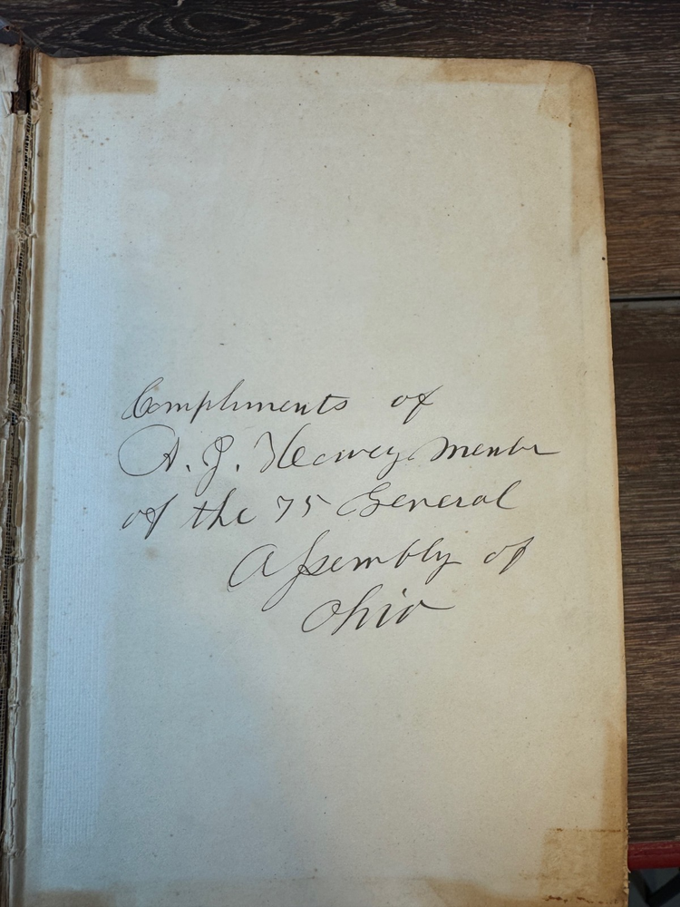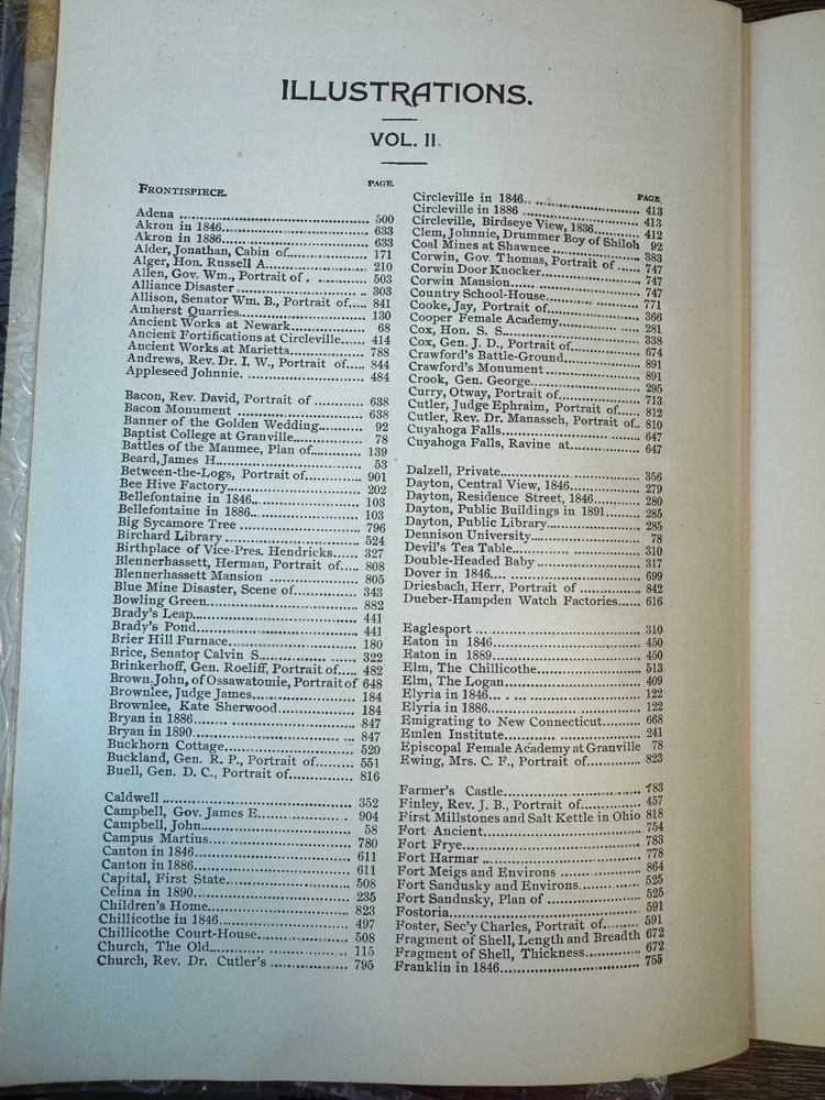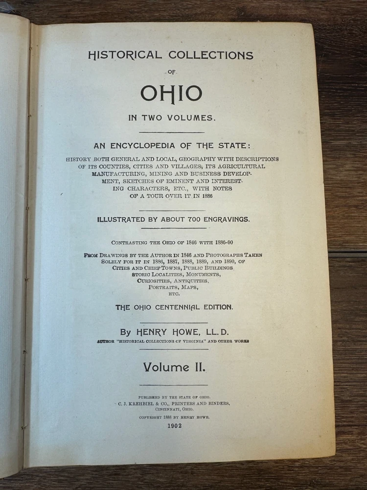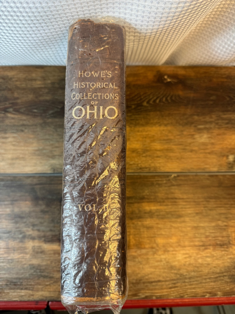 Historical Collections of Ohio in Volume 2. An Encyclopedia of the State: History Both General and Local, Geography with Descriptions of its Counties, Cities and Villages, Its Agricultural, Manufacturing, Mining and Business Development, Sketches of Eminent and Interesting Characters, Etc., with Notes of a Tour Over it in 1886, The Ohio Centennial Edition, by Henry Howe, LL.D., The State of Ohio, Cincinnati, 1900, 992pp, 911pp, 3/4 leather, 7.5 x 10", 8vo Fair condition. Wear and scuffing to boards with bumped tips; some board exposed at tips. Stamp on pastedowns (Compliments of Frank W. Hendley, Representative, 74th General Assembly of Ohio). Frontispiece in vol. 2 of Sherman's Army Wagons Going Through Gainesville. Slight toning through textblocks as well as some instances of age-staining and tea-staining. Includes over 700 engravings. Please see photos. Henry Howe (October 11, 1816 - October 14, 1893) was an American author who wrote histories of several states in the United States. His most celebrated work is the three volume Historical Collections of Ohio. Howe's research efforts in regards to Ohio began January 1846. With Ohio settled for only a half century, many of the original history makers were still around to interview. The first edition of Historical Collections of Ohio was published in September 1847 and became a best seller, outselling even Ulysses S. Grant's memoirs. Thank you for looking, I appreciate your business! Please share my shop with others who may be interested. ~Pleasant Street Pickers