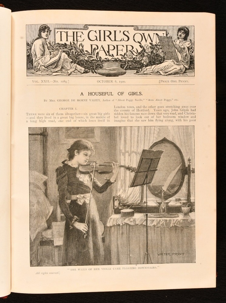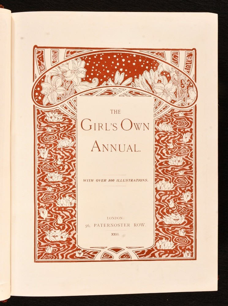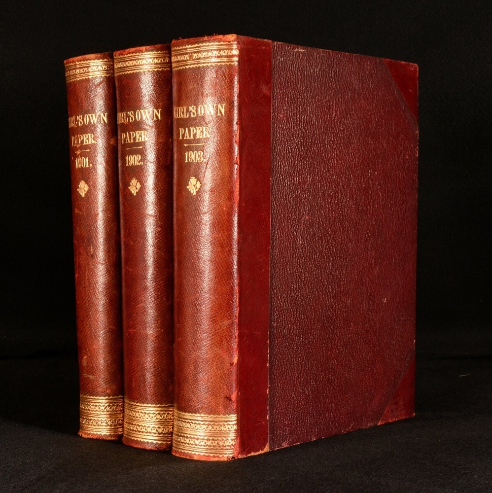 Click here to see our other books! The Girl's Own Annual Various 1900-1903 Not Stated : London 11" by 8.5" 832; 832; 832pp. SUMMARY Three smart volumes of The Girls Own Annual, from The Girl's Own Paper issues published from the years 1900 to 1903. Illustrated,Leather Binding Overall Condition: Very Good This book weighs 6 KG when packed UK Postage: £ 4.49 US Postage: £ 47.99 EU Postage : £ 28.99 European Postage: £ 49.99 Asia Postage: £ 79.99 Worldwide Postage: £ 159.99 DESCRIPTION Three volumes. The Girl's Own Paper was a British story paper for young women and girls which was published weekly from 1880 until 1956 by the Religious Tract Society, which subsequently became the Lutterworth Press. The paper provided a mixture of educational articles, stories, poetry, music, answers to correspondence, and plates or illustrations. Most of the content was created by female writers, artists, and musicians, and as the years progressed the paper included information on serious careers for women and advice on style and dress. For some years The Girl's Own Annual was published as a collection of issues throughout the year. This set includes: Volume XXII including issues number 1084, 6th October 1900, to number 1135, 28th September 1901. Illustrated with frontispiece, eleven plates, four of which are in full colour, and one folding plate. Volume XXIII including issue number 1136, 5th October 1901, to number1187, 27th September 1902. Illustrated with a coloured frontispiece and eleven plates, six of which are in full colour. Volume XXIV including issues number 1188, 4th October 1902, to number 1239, 26th September 1903. Illustrated with a coloured frontispiece, three folding plates, and ten plates, four of which are in full colour. CONDITION Bound in half crushed morocco with cloth boards. Externally, sound with shelf wear and rubbing resulting in minor loss to the extremities. Fading to the spine and marks to the boards. Light loss to the rear board of volume one. Internally, firmly bound. Pages are very bright and clean with the odd handling mark or spot. The odd small closed tear to the edge of a page. Overall Condition: Very Good GLOSSARY OF TERMS Overall Condition (Dustwrapper condition rating is shown after that for the book itself, where a dustwrapper is present) Fine - Very well preserved copy showing very little wear Very Good Indeed - Only one or two minor faults, really a very attractive copy Very Good - Quite a wide term meaning no major faults but probably several smaller ones often expected given the age of the book, but still a respectable copy Good - Meaning not very good. Some more serious faults as will be described in the condition report under 'condition' Good Only - Meaning one or more faults that could really do with repair Fair - As with good only above but with other faults leaving a compromised copy even after repair Poor - Really bad and possibly seriously incomplete. We only sell books in this condition where their rarity or value makes them attractive none the less. Major defects will be described. GUARANTEE We offer a full money back guarantee on our descriptions. Please ask for details and conditions. We prefer PAYPAL. If you pay via PAYPAL we will post the item off the same or the next working day with the postage you have selected. Please note we cannot accept USD cheques