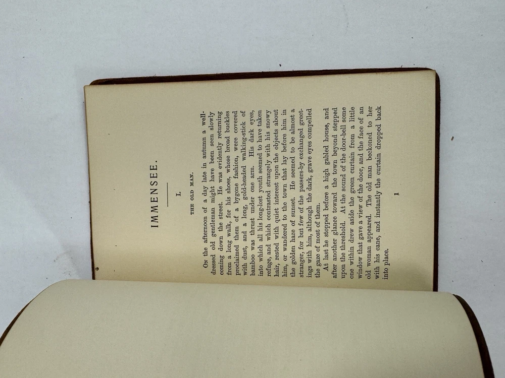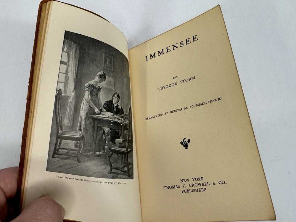 One of the rarest versions of this book. And in this condition is impossible to find. The grail of these books. Immensee by Theodor Storm – 1902 Leather-Bound Edition – Great Condition For sale is a 1902 leather-bound edition of Immensee by Theodor Storm, translated by Bertha M. Schimmelfennig and published by Thomas Y. Crowell & Co., New York. This beautiful antique book is over 120 years old and remains in great condition. The leather binding is well-preserved, with only minor signs of age-related wear. The pages are intact and free of major damage. A wonderful addition to any rare book collection, perfect for literary enthusiasts or collectors of classic German literature in English translation. 📚 Details: • Title: Immensee • Author: Theodor Storm • Translator: Bertha M. Schimmelfennig • Publisher: Thomas Y. Crowell & Co. • Year: 1902 • Binding: reverse Leather-bound • Condition: Great (minor signs of wear, pages intact and clean) Shipped securely with protective packaging. Feel free to message me with any questions! 🔹 Add this rare gem to your collection today! 🔹