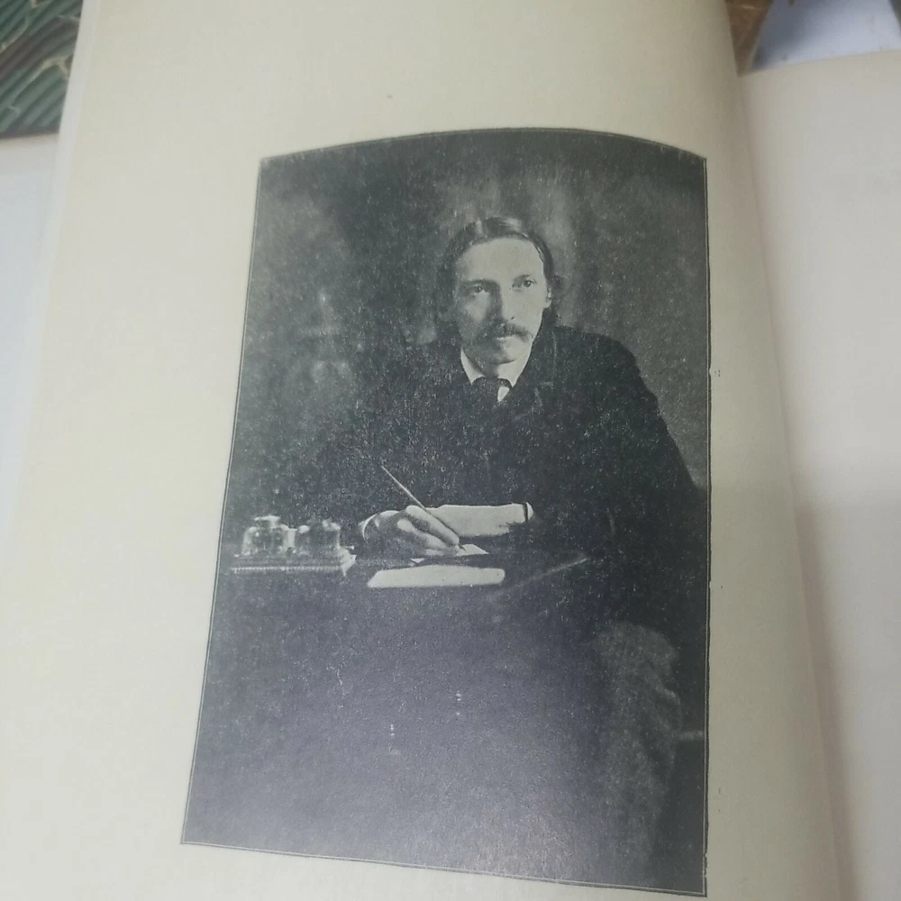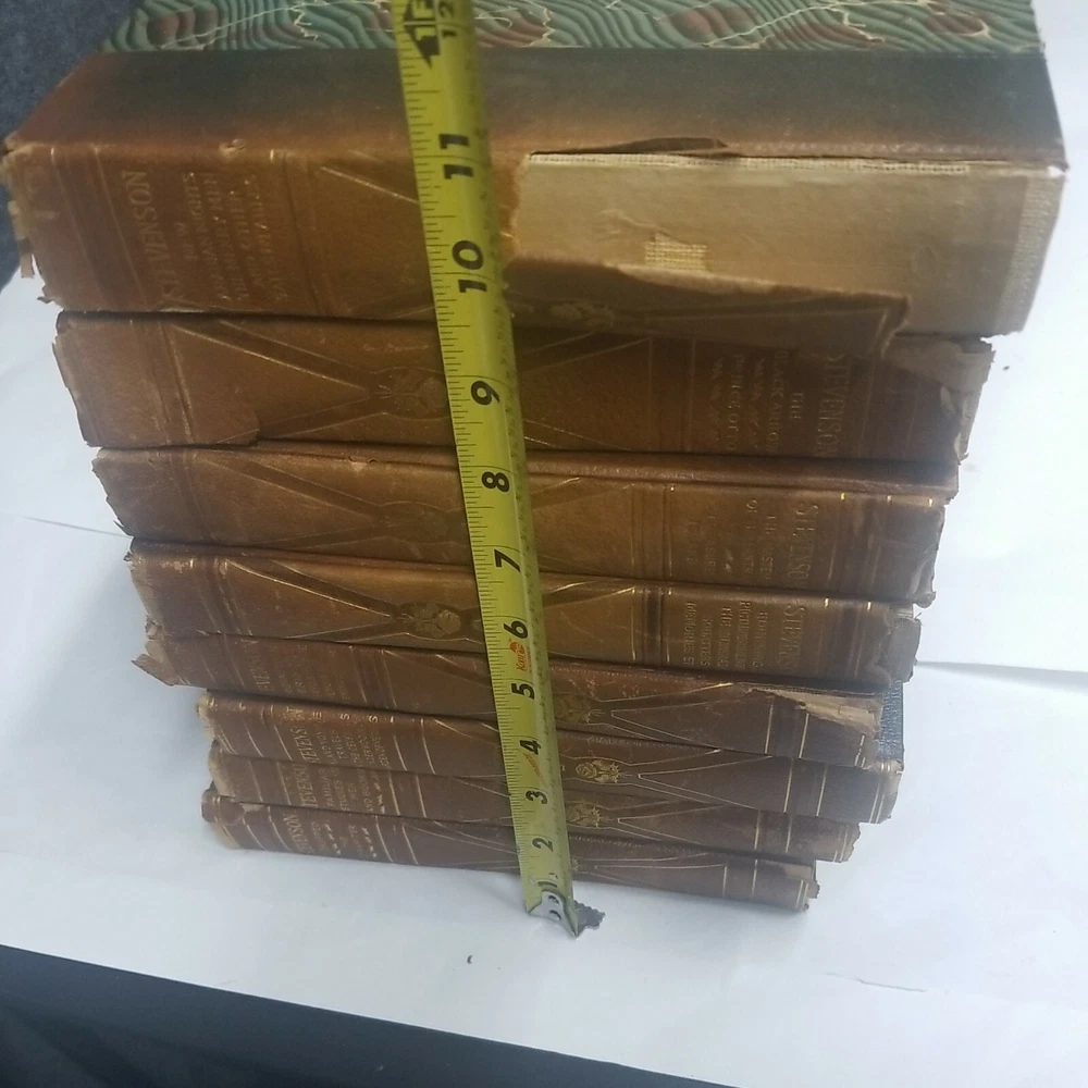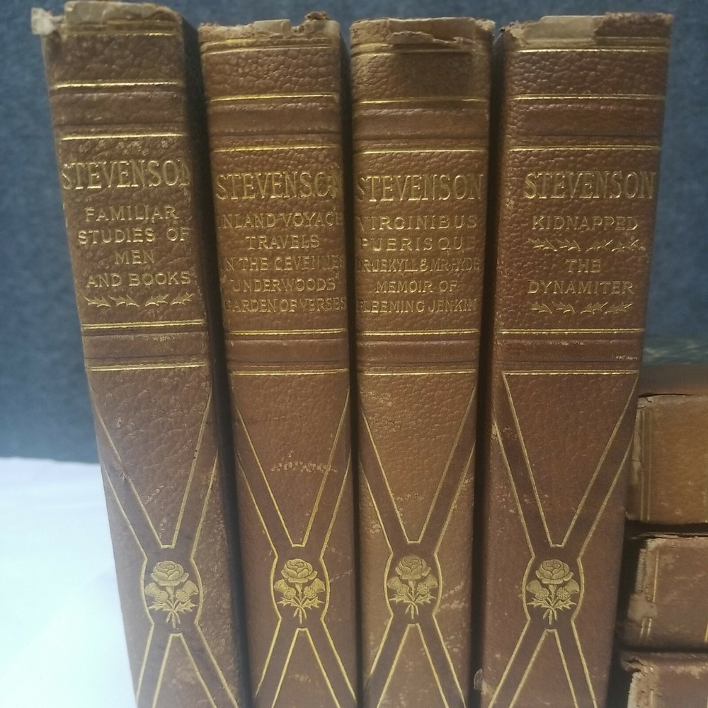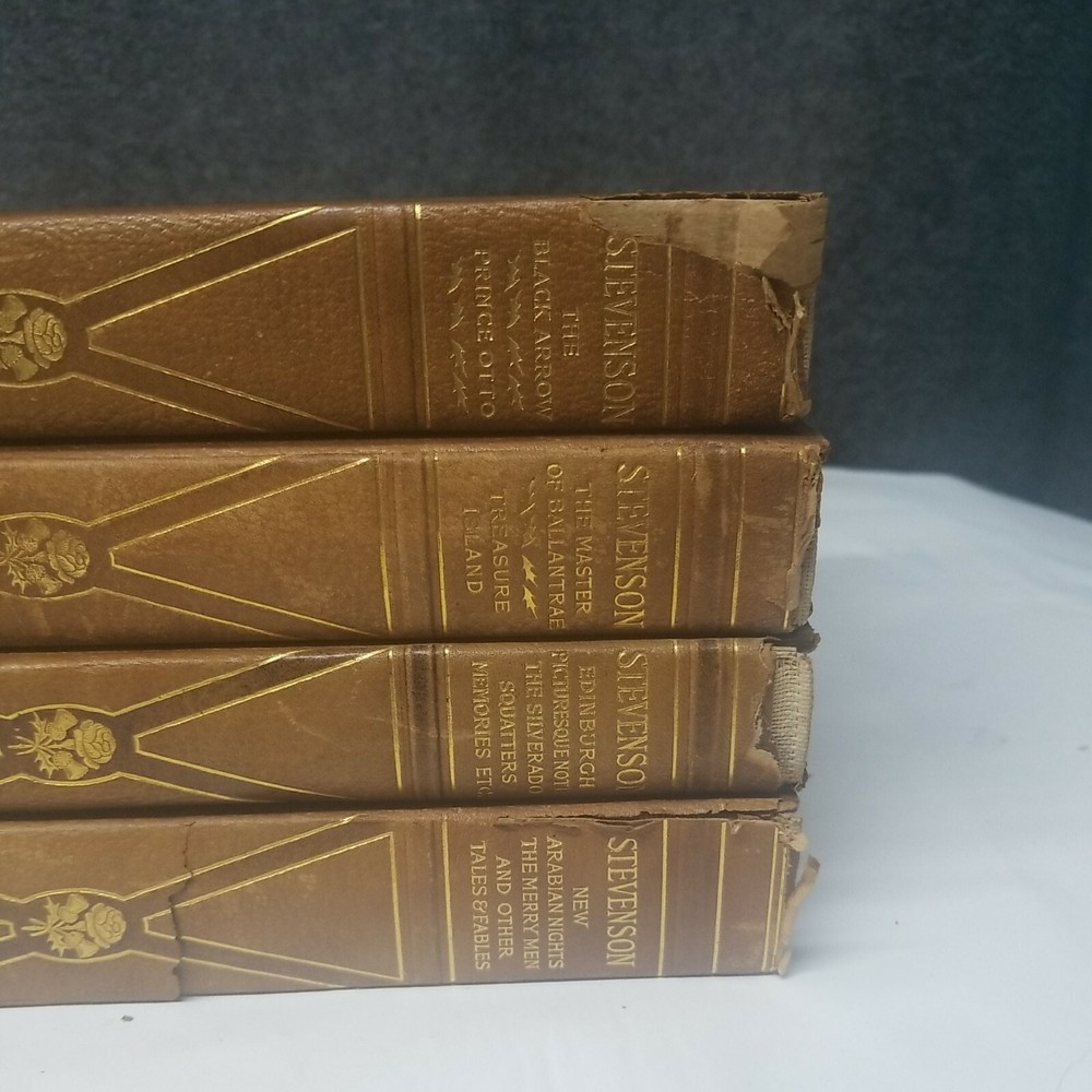 1904 WORKS OF ROBERT LOUIS STEVENSON 8 VOL Illustrated Co-operative Publications. 1904 WORKS OF ROBERT LOUIS STEVENSON 8 VOL SET circa 1904 Published by Co-Operative Publications See photos Volumes are solid and tight with sound hinges. Spines are all sunned, with light tearing at the top as pictured. Some spots on spines. Beautiful looking set lined up on the shelf, marbled boards sharing the cover with leather to make Book that looks good and feels good in the hand. Weight is 18 lb. 9 oz. Without packaging. 9¼" x 6⅝" x 10⅝" Offers always considered. Thank you for looking. PS1-1b.120923