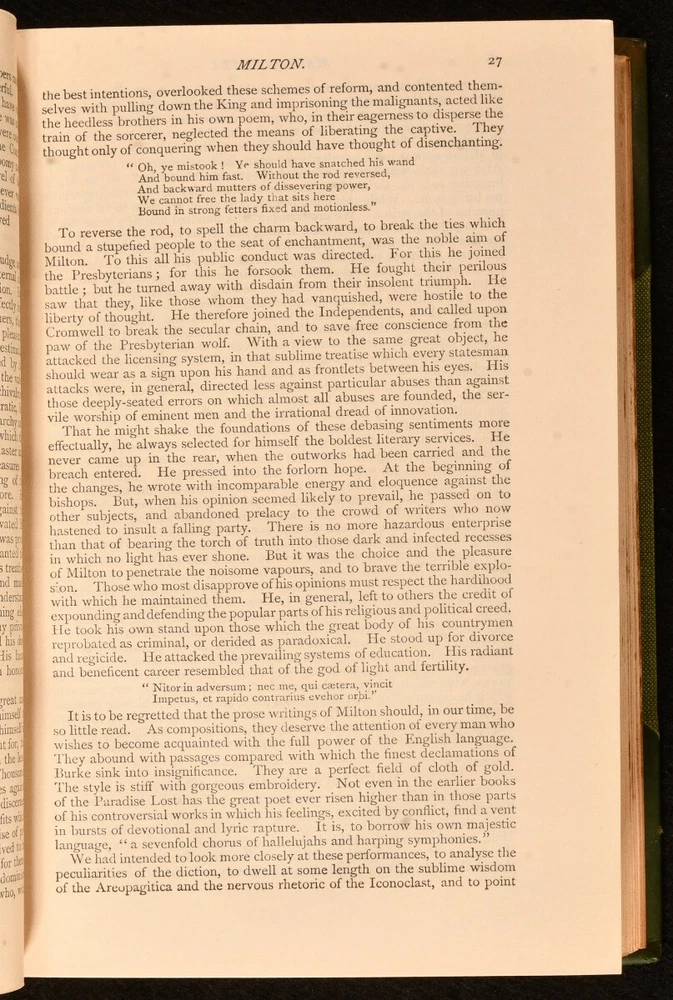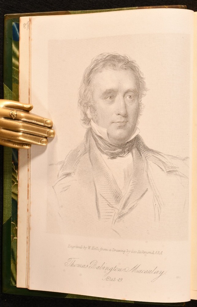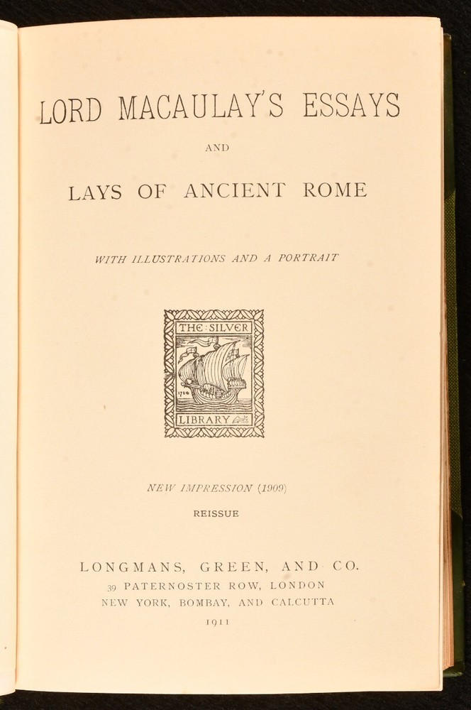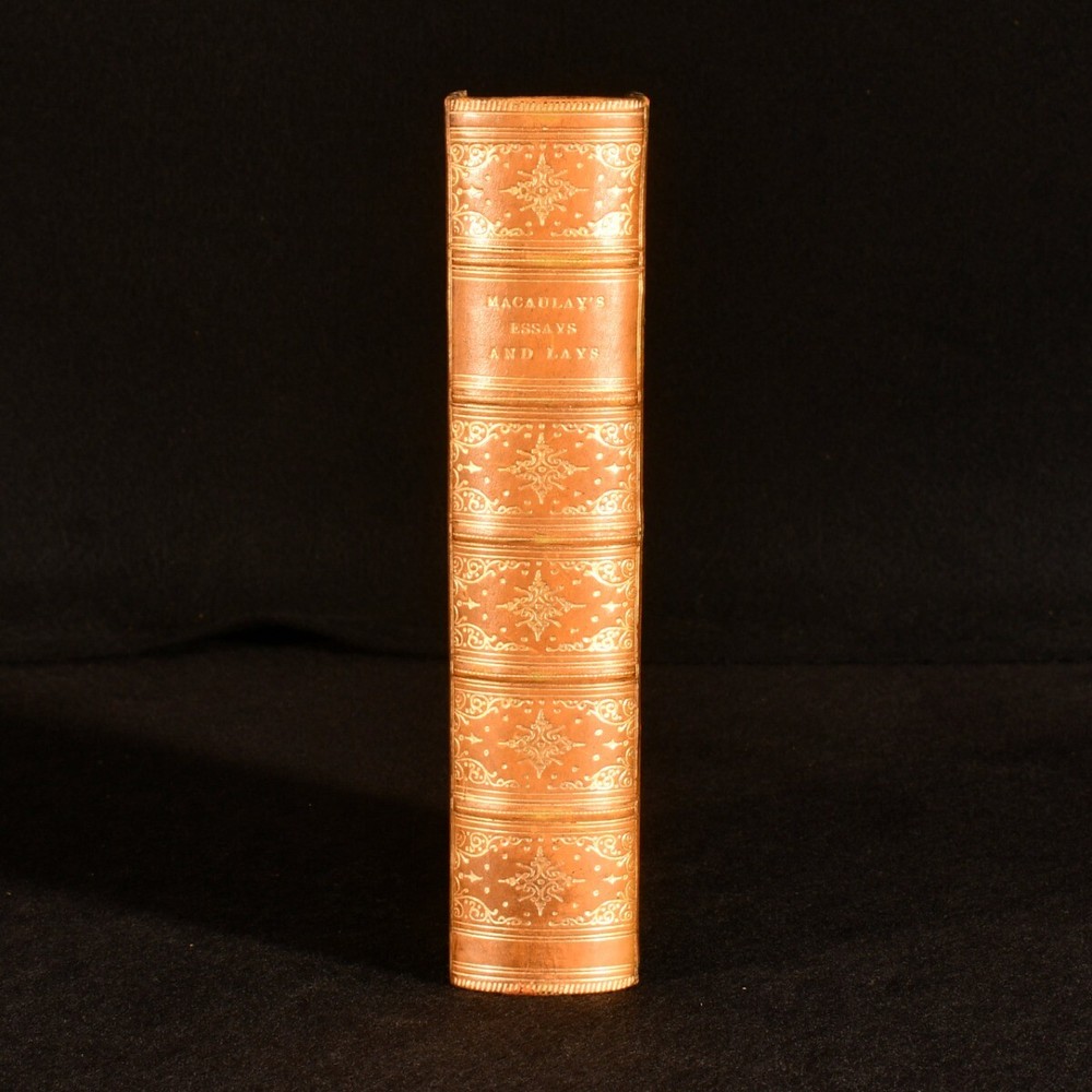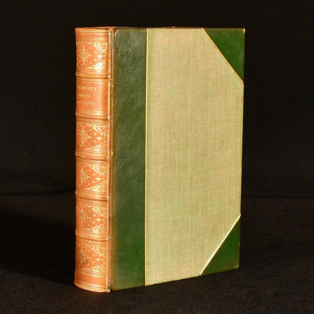 Click here to see our other books! Lord Macaulay's Essays and Lays of Ancient Rome Lord Macaulay 1911 Longmans, Green, and Co. : London 7.5" by 5" 923pp. SUMMARY A collection of Lord Macaulay's essays bound in half calf. Illustrated,Leather Binding,Original Binding Overall Condition: Very Good Indeed This book weighs 0.75 KG when packed UK Postage: £ 3.99 US Postage: £ 19.99 EU Postage : £ 15.99 European Postage: £ 16.99 Asia Postage: £ 21.99 Worldwide Postage: £ 25.99 DESCRIPTION Reissue of the 1909 new impression. Oxford binding. Bound in half calf with cloth to the boards with raised bands and gilt details to the spine. Illustrated with a monochrome frontispiece and four monochrome plates. Collated complete. This work features a collection of essays by the noted Thomas Babington Macaulay, a British historian and whig politician. This collection includes essays on literary works such as Southey's edition of the 'Pilgrim's Progress' and biographies on Lord Byron and Johnson, as well essays on the lays of ancient Rome. CONDITION Bound in half calf with cloth to the boards. Externally very smart with fading to the spine and very minimal shelf wear. Internally firmly bound with bright and generally clean pages with scattered spotting to the blanks and spotting to the fore edge. Overall Condition: Very Good Indeed GLOSSARY OF TERMS Overall Condition (Dustwrapper condition rating is shown after that for the book itself, where a dustwrapper is present) Fine - Very well preserved copy showing very little wear Very Good Indeed - Only one or two minor faults, really a very attractive copy Very Good - Quite a wide term meaning no major faults but probably several smaller ones often expected given the age of the book, but still a respectable copy Good - Meaning not very good. Some more serious faults as will be described in the condition report under 'condition' Good Only - Meaning one or more faults that could really do with repair Fair - As with good only above but with other faults leaving a compromised copy even after repair Poor - Really bad and possibly seriously incomplete. We only sell books in this condition where their rarity or value makes them attractive none the less. Major defects will be described. GUARANTEE We offer a full money back guarantee on our descriptions. Please ask for details and conditions. We prefer PAYPAL. If you pay via PAYPAL we will post the item off the same or the next working day with the postage you have selected. Please note we cannot accept USD cheques