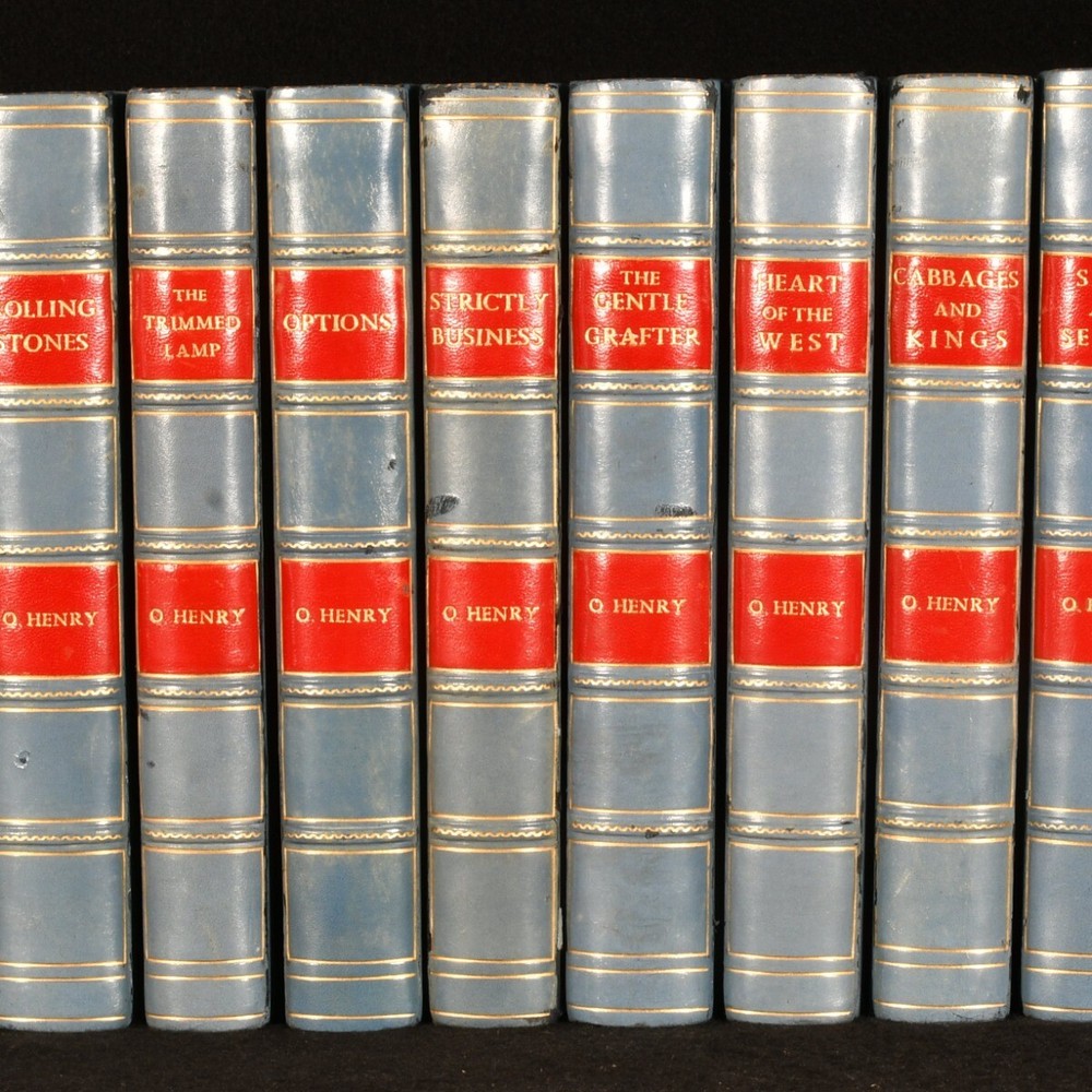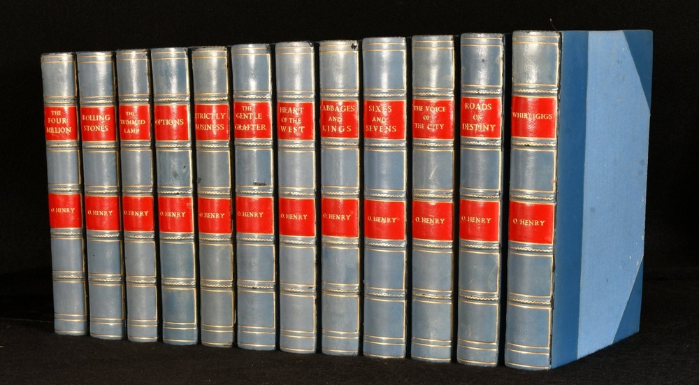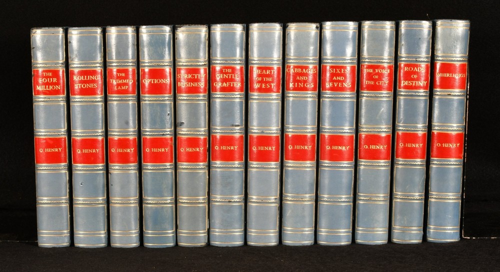 Click here to see our other books! O. Henry Collection: Cabbages and Kings; Heart of the West; The Trimmed Lamp; The Gentle Crafter; Strictly Business; Options; Rolling Stones; The Four Million; Whirligigs; Sixes and Sevens; The Voice of the City; Roads of Destiny O. Henry [William Sydney Porter] 1913-1920 Doubleday, Page & Company : New York 7.5" by 5" SUMMARY A well presented twelve-volume set of the works of William Sydney Porter, writing under the pen name O. Henry. Illustrated,Leather Binding Overall Condition: Very Good Indeed This book weighs 6 KG when packed UK Postage: £ 4.49 US Postage: £ 47.99 EU Postage : £ 28.99 European Postage: £ 49.99 Asia Postage: £ 79.99 Worldwide Postage: £ 159.99 DESCRIPTION A wonderfully presented twelve volume set of fiction by O. Henry. This work is in blue half calf binding, with blue cloth boards and attractive red leather spine labels. This set was published by Review of Reviews company between 1913 and 1920. Review of Reviews was a well-known group of monthly journals founded in 1890-1893 by British journalist William Thomas Stead, with the aim to bring publishing of this kind global. O. Henry was the pen name of American writer, William Sydney Porter. Henry was predominantly known for his short stories, although he also wrote poetry and non-fiction. This work is a collection of novels, comprised of Cabbages and Kings; Heart of the West; The Trimmed Lamp; The Gentle Crafter; Strictly Business; Options; Rolling Stones; The Four Million; Whirligigs; Sixes and Sevens; The Voice of the City; Roads of Destiny. With frontispieces to each volume, except Roads of Destiny. The frontispiece in Rolling Stones is of one of the last photographs ever taken of O. Henry, in 1909, before his death in 1910. Collated, complete. Bookseller stamp of Henry Sotheran to first blank of each novel. Sotheran's is a Rare Books & Prints company based in London, established in 1761. CONDITION In blue half calf binding with blue cloth boards. Externally very smart, with minor shelf wear only. Slight rubbing to hinges and to extremities. The occasional mark to boards. Light offsetting to endpapers. Bright colour to cloth. Internally firmly bound. Pages bright and clean with the occasional spot, mainly to first and last pages. Bookseller stamp of Henry Sotheran to first blank of each novel. Overall Condition: Very Good Indeed GLOSSARY OF TERMS Overall Condition (Dustwrapper condition rating is shown after that for the book itself, where a dustwrapper is present) Fine - Very well preserved copy showing very little wear Very Good Indeed - Only one or two minor faults, really a very attractive copy Very Good - Quite a wide term meaning no major faults but probably several smaller ones often expected given the age of the book, but still a respectable copy Good - Meaning not very good. Some more serious faults as will be described in the condition report under 'condition' Good Only - Meaning one or more faults that could really do with repair Fair - As with good only above but with other faults leaving a compromised copy even after repair Poor - Really bad and possibly seriously incomplete. We only sell books in this condition where their rarity or value makes them attractive none the less. Major defects will be described. GUARANTEE We offer a full money back guarantee on our descriptions. Please ask for details and conditions. We prefer PAYPAL. If you pay via PAYPAL we will post the item off the same or the next working day with the postage you have selected. Please note we cannot accept USD cheques