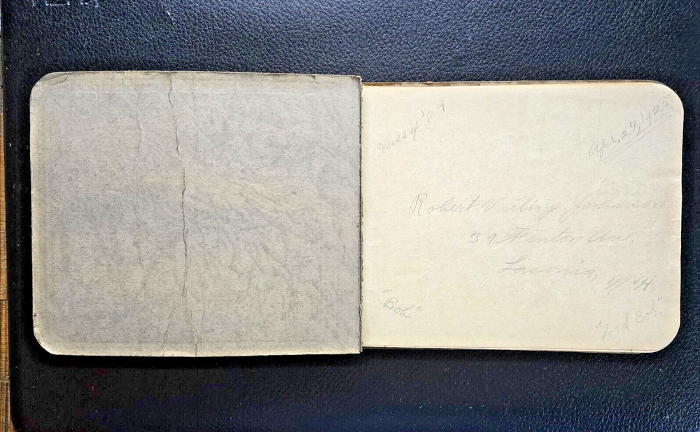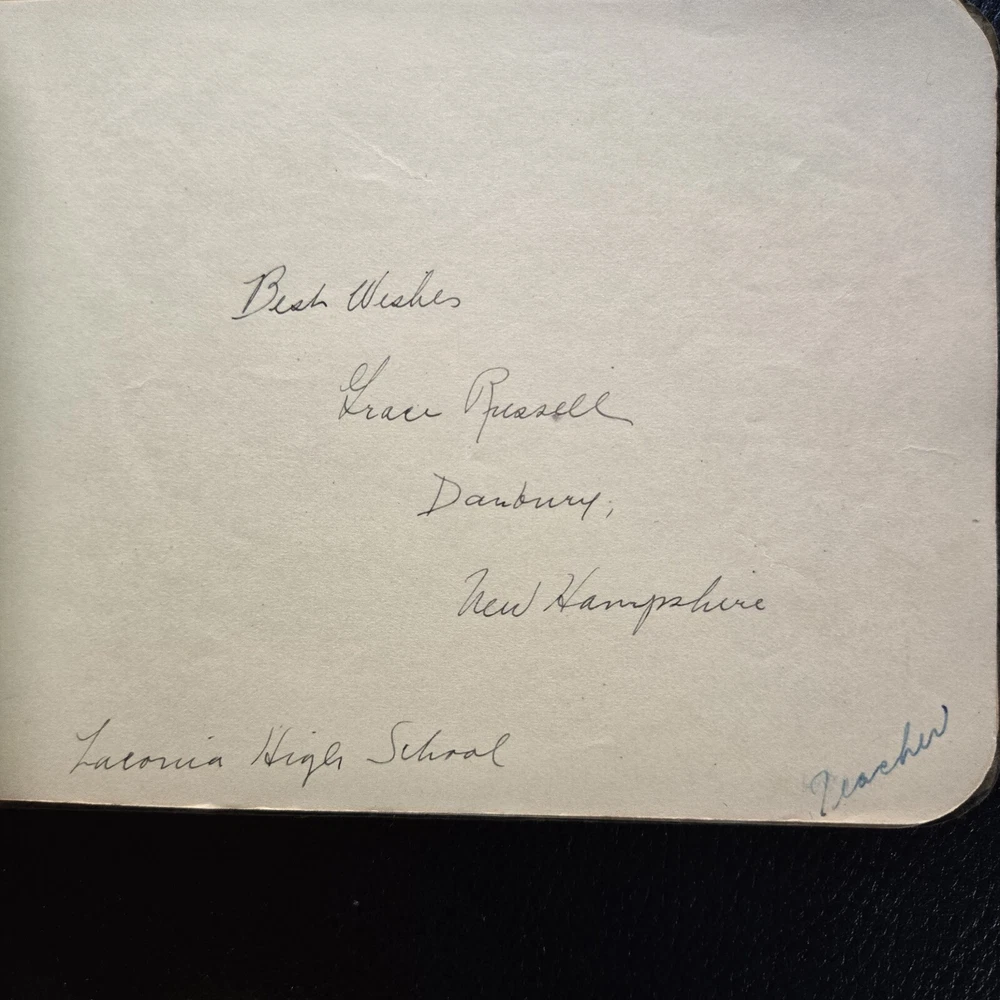 1920s Autograph Book Laconia NH High School Signed Leather Bound Handwritten This 1920s Autograph book is signed by Laconia NH school classmates. A nice piece of history from the Laconia NH area. At least one person was from Danbury. About half the pages are filled out and half are blank. This is a well-used original autograph book from the 1920s. Leather cover is creased, worn and stained. Original binding ribbon is present. No odors. See photos for exact condition. I ship quickly but am unable to control the speed of the Post Office.