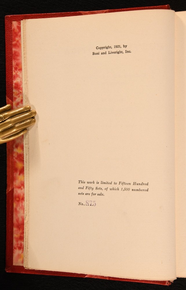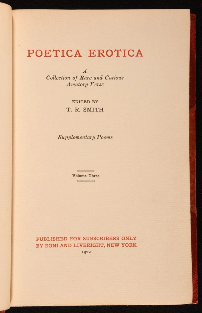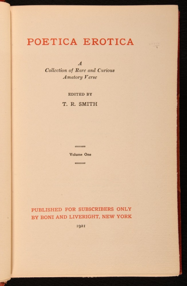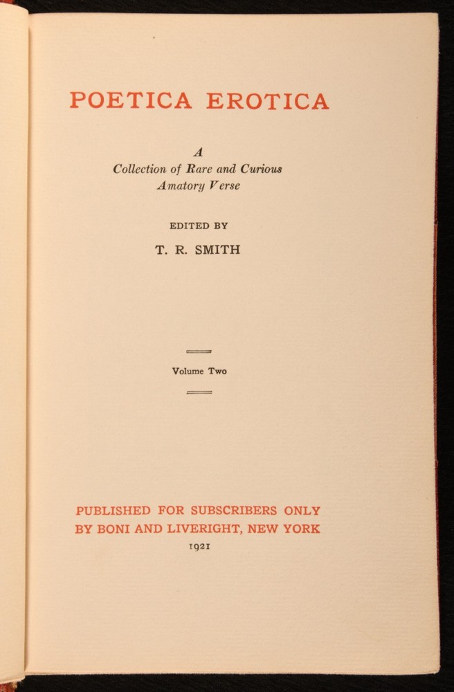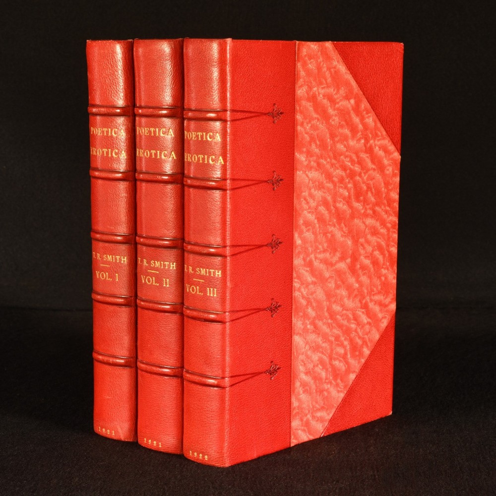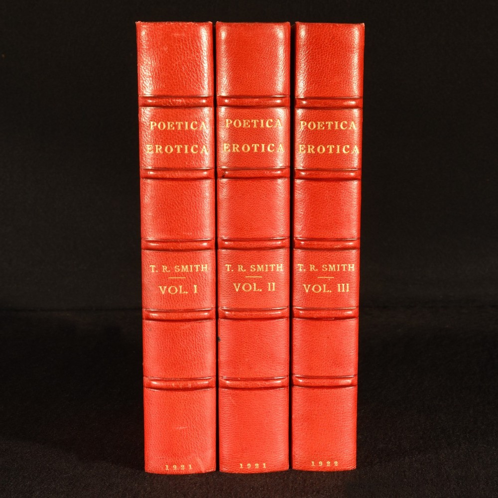 Click here to see our other books! Poetica Erotica: A Collection of Rare and Curious Amatory Verse T. R. Smith [ed.] 1921-1922 For Subscribers Only by Boni and Liveright : New York 9.5" by 6.5" xix [3], 3-324; 328; 278 [1]pp SUMMARY An exceptionally lovely example of the limited edition, three volume first edition, of T. R. Smith's anthology of erotic poetry. First Edition,Leather Binding,Limited Edition Overall Condition: Fine This book weighs 3 KG when packed UK Postage: £ 3.99 US Postage: £ 36.99 EU Postage : £ 25.99 European Postage: £ 27.99 Asia Postage: £ 47.99 Worldwide Postage: £ 69.99 DESCRIPTION The title page versos read 'This work is limited to fifteen hundred and fifty copies, of which fifteen hundred are for sale. No more will be printed'. This set is no. 875. The first edition of this collection, complete in three volumes. This work contains a collection of erotic and romantic poetry, edited by T. R. Smith. Including works of erotic and amatory poetry from such writers as Congreve William, Theocritus, Sir John Suckling, John Milton, Ovid, and Robert Burns. CONDITION In half morocco bindings, with paper covered boards. Externally, fine. Internally, firmly bound. Pages exceptionally clean and bright. Overall Condition: Fine GLOSSARY OF TERMS Overall Condition (Dustwrapper condition rating is shown after that for the book itself, where a dustwrapper is present) Fine - Very well preserved copy showing very little wear Very Good Indeed - Only one or two minor faults, really a very attractive copy Very Good - Quite a wide term meaning no major faults but probably several smaller ones often expected given the age of the book, but still a respectable copy Good - Meaning not very good. Some more serious faults as will be described in the condition report under 'condition' Good Only - Meaning one or more faults that could really do with repair Fair - As with good only above but with other faults leaving a compromised copy even after repair Poor - Really bad and possibly seriously incomplete. We only sell books in this condition where their rarity or value makes them attractive none the less. Major defects will be described. GUARANTEE We offer a full money back guarantee on our descriptions. Please ask for details and conditions. We prefer PAYPAL. If you pay via PAYPAL we will post the item off the same or the next working day with the postage you have selected. Please note we cannot accept USD cheques
