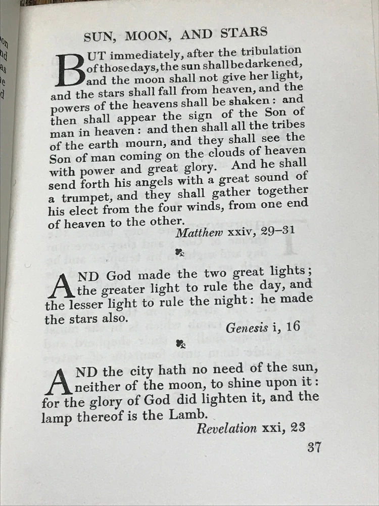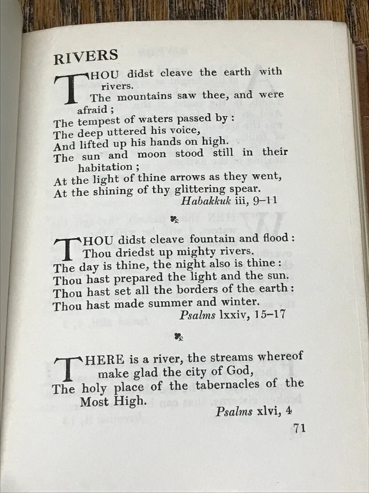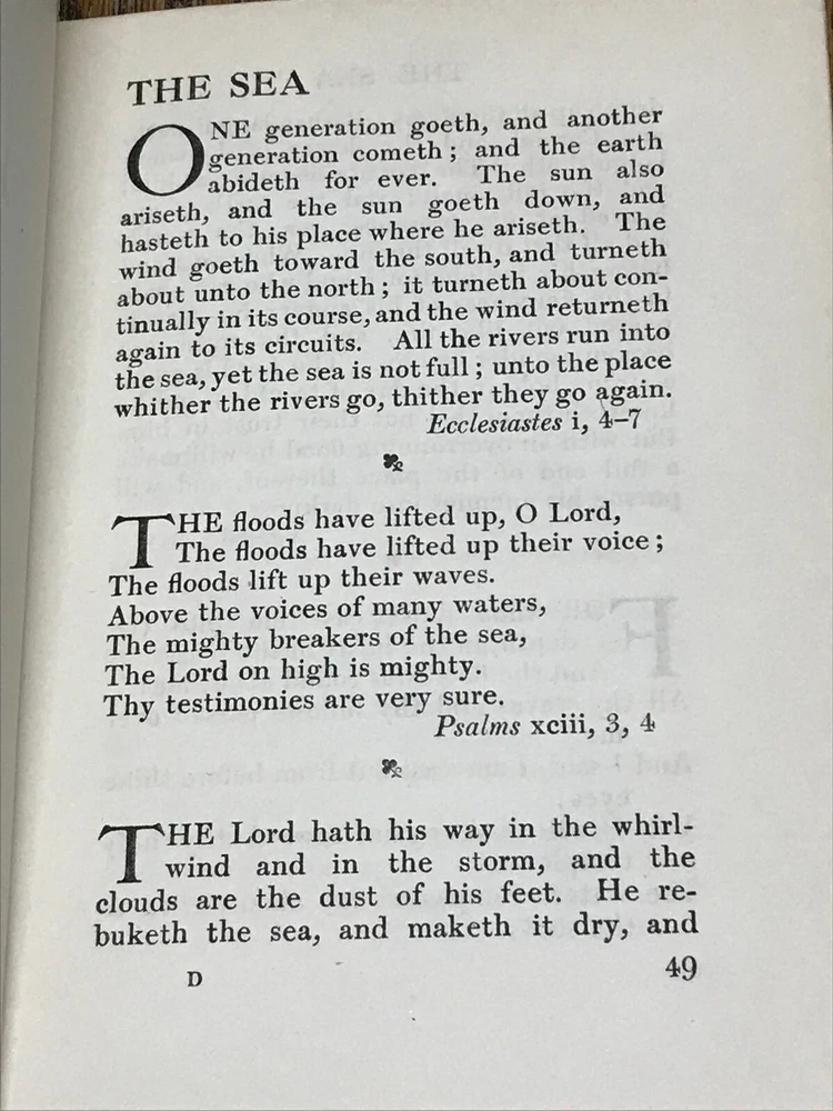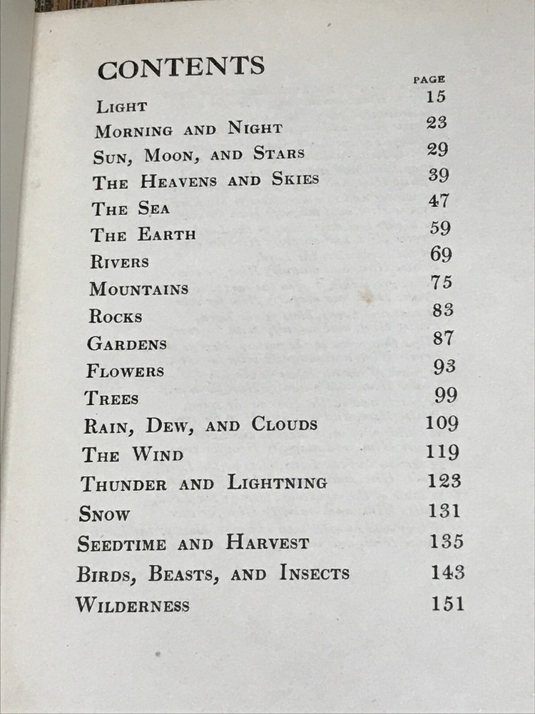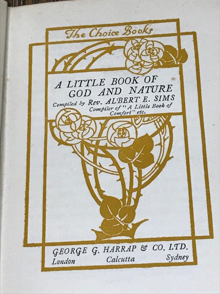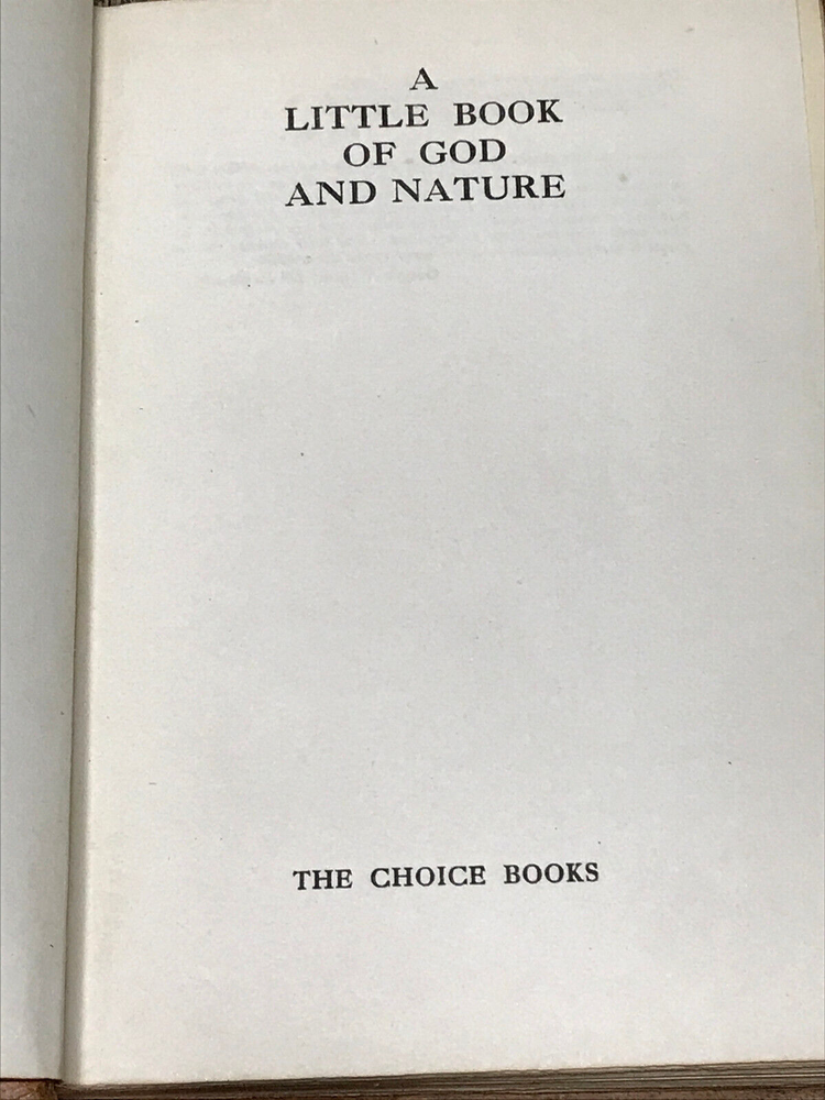 A Little Book Of God And Nature. by Rev. Albert E. Sims. The Choice Books. Published 1923 by George G. Harrap & Co. First edition. Publisher's very handsome leather covered boards, ornate embossed gilt decorations. 160 pp. top edges gilt. Illustrated with a frontispiece. Measures 5 3/4" x 4". Anthology of Bible quotations/verse emphasizing the close connection and complete harmony between Nature & Revelation. Very scarce 101 year old book. Long out-of-print.