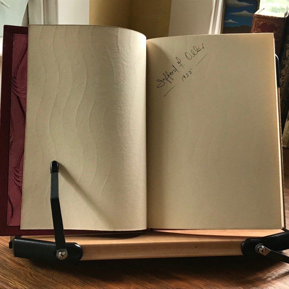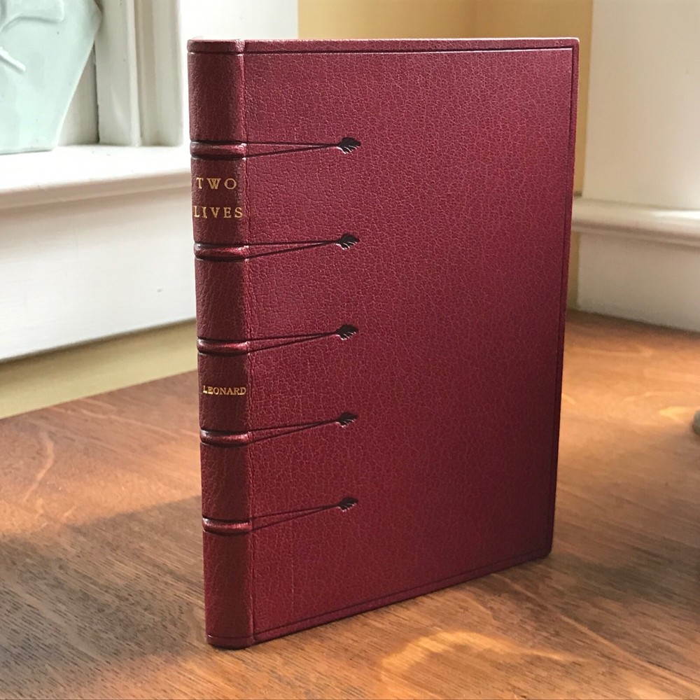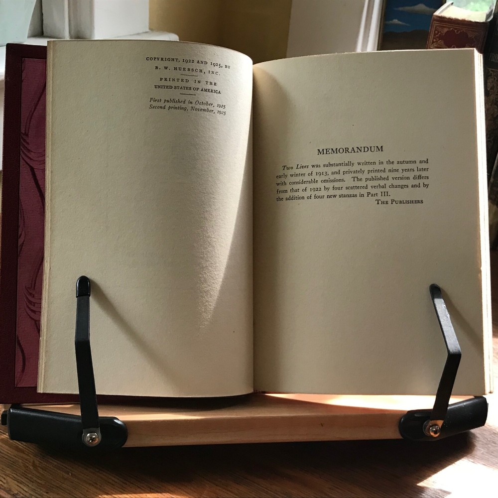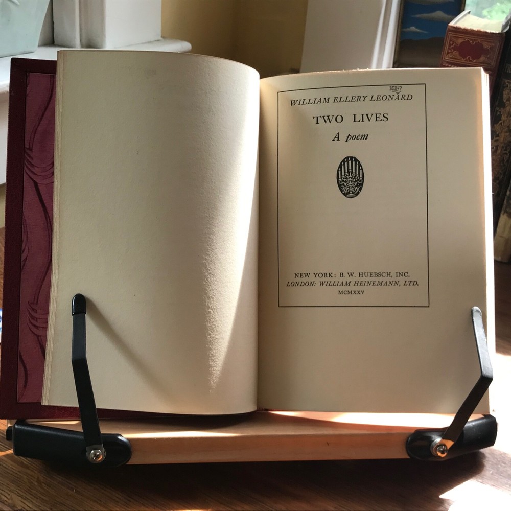Two Lives: A poem, William Ellery Leonard, B.W. Huebsch, Inc., New York, 1925, 109 pp, full leather, 8.5 x 6”, 8vo. In good condition. Beautifully bound in Deco style leather boards. Truly quite lovely. Light wear to extremities. Pink and purple swirled end papers remain bright and clean. Light toning to edges of front fly leaf. Jefford F. Oller 1925 signed on second fly leaf. Light toning to textblock. A few notations in Oller’s hand, mostly underlining and his review on the last leaf. Binding tight and intact. Top edge gilt. Please see photos. Owned previously by Jefford F. Oller of Waynesboro, PA. Oller was a financier, industrialist, and press book collector. Oller’s collection of books were all beautifully rebound in Deco style bindings. Quite impressive. William Ellery Leonard (1876-1944) was an American poet, playwright, translator and literary scholar. Over his career, Leonard wrote numerous volumes of poetry, this being his most well-known work. It is a cycle of 250 sonnets telling the story of a tragic marriage. COLL1925ABDN-FORN-0675 04/24 HKREVISION