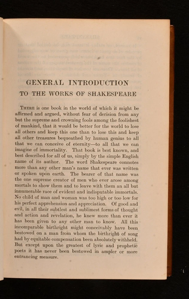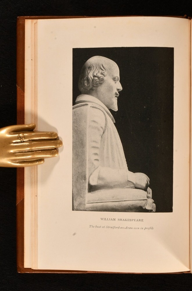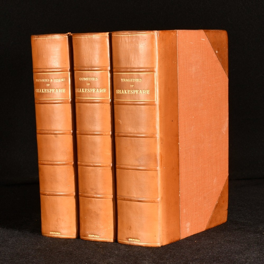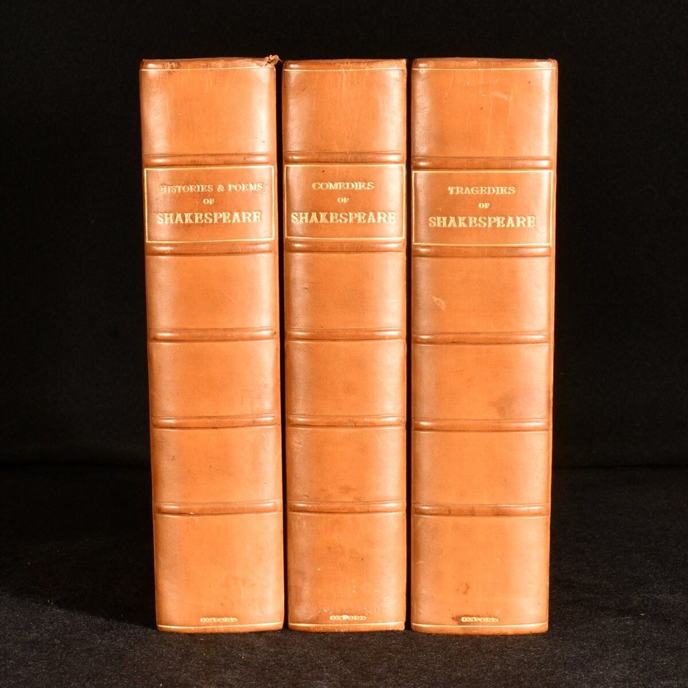 Click here to see our other books! The Histories and Poems of Shakespeare; The Tragedies of Shakespeare; The Comedies of Shakespeare William Shakespeare 1925-1927 Humphrey Milford Oxford University Press : London 7.5" by 5" [8], 1214, [2]; [8], 1315, [3]; [4], xxxviii, [2], 1128, [2pp.] SUMMARY A well presented collection of Shakespeare's works, compiled by Humphrey Milford at the Oxford University Press. Leather Binding Overall Condition: Near Fine This book weighs 3 KG when packed UK Postage: £ 3.99 US Postage: £ 36.99 EU Postage : £ 25.99 European Postage: £ 27.99 Asia Postage: £ 47.99 Worldwide Postage: £ 69.99 DESCRIPTION This collection is bound in half calf, with cloth boards. With an Oxford Binding label to the front paste down. 'The Histories and Poems of Shakespeare' and 'The Tragedies of Shakespeare' were both published in 1925, with 'The Comedies of Shakespeare' being published in 1927. This collection was published by Humphrey Milford at the Oxford University Press. Milford was an English editor who was publisher to the University of Oxford and head of the London branch of the Oxford University press between 1913 and 1945. He strived to make OUP a major worldwide publisher, with a focus on educational material for the general public. He was knighted for his contributions in 1936. This particular collection features Shakespeare's work in a clear, concise format. 'The Histories and Poems of Shakespeare' is comprised of many different works, including The Life and Death of King John, The Tragedy of King Richard the Second, as well as a chapter on Shakespeare's Sonnets. 'The Tragedies of Shakespeare' contains works such as King Lear, Macbeth and Romeo and Juliet. 'The Comedies of Shakespeare' volume includes The Tempest, The Merry Wives of Windsor and A Midsummer Night's Dream, among many others. 'The Comedies of Shakespeare' volume also includes and introduction to the works of Shakespeare by English poet, playwright and novelist, Algernon Charles Swinburne. With a photograph frontispiece of Shakespeare in painting or statue form to each volume. CONDITION In smart half calf binding with brown cloth to the boards and marbled endpapers. Externally, very smart, with light bumping to the extremities and the odd mark to the leather. The occasional mark to the boards and to endpapers. Internally, firmly bound. Pages bright and clean with the odd handling mark. Overall Condition: Near Fine GLOSSARY OF TERMS Overall Condition (Dustwrapper condition rating is shown after that for the book itself, where a dustwrapper is present) Fine - Very well preserved copy showing very little wear Very Good Indeed - Only one or two minor faults, really a very attractive copy Very Good - Quite a wide term meaning no major faults but probably several smaller ones often expected given the age of the book, but still a respectable copy Good - Meaning not very good. Some more serious faults as will be described in the condition report under 'condition' Good Only - Meaning one or more faults that could really do with repair Fair - As with good only above but with other faults leaving a compromised copy even after repair Poor - Really bad and possibly seriously incomplete. We only sell books in this condition where their rarity or value makes them attractive none the less. Major defects will be described. GUARANTEE We offer a full money back guarantee on our descriptions. Please ask for details and conditions. We prefer PAYPAL. If you pay via PAYPAL we will post the item off the same or the next working day with the postage you have selected. Please note we cannot accept USD cheques