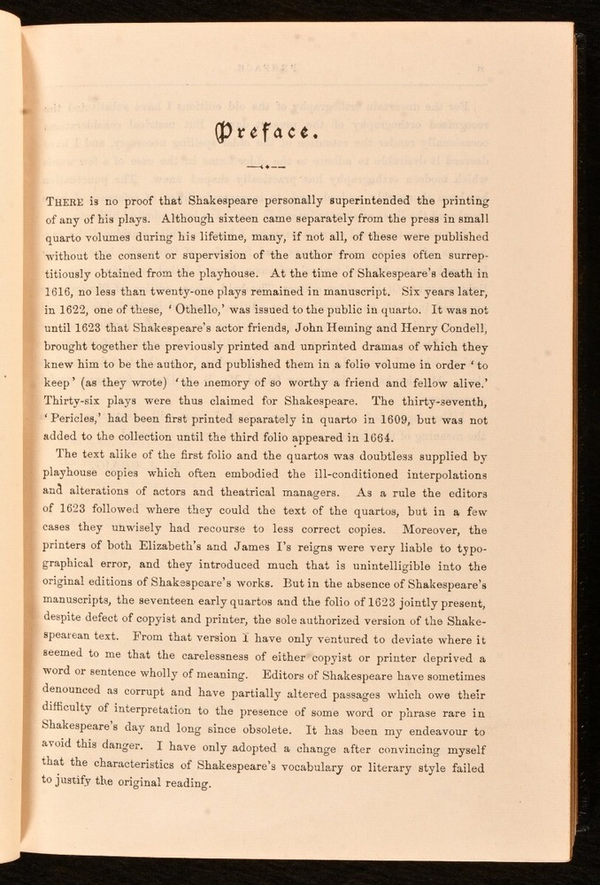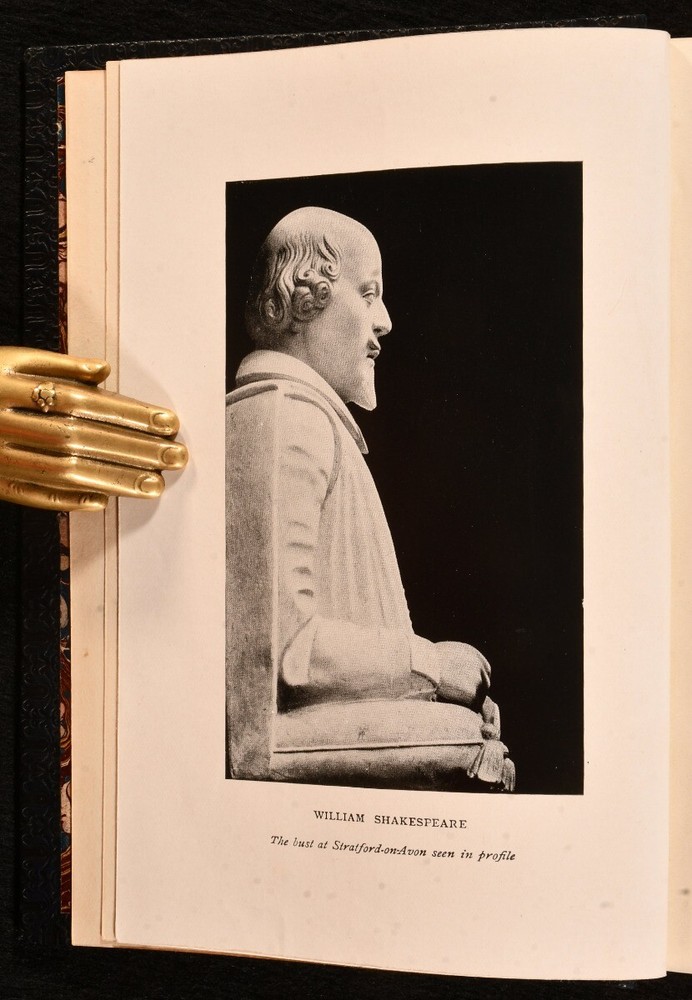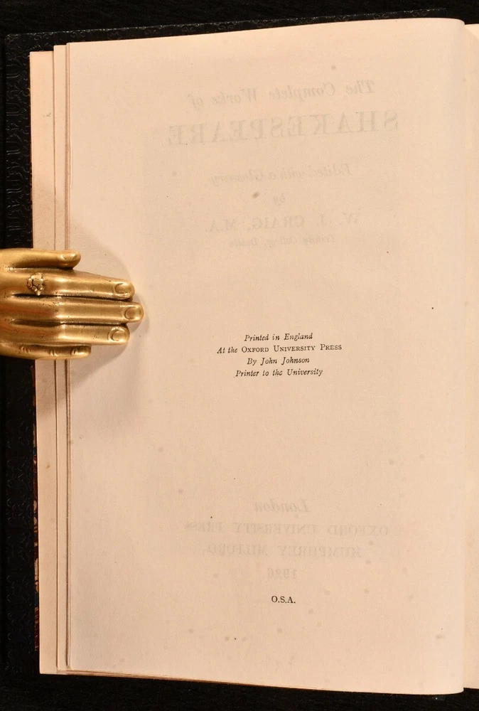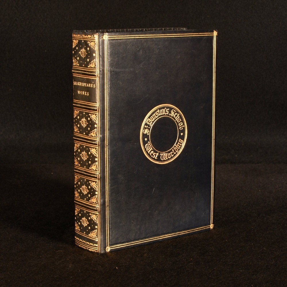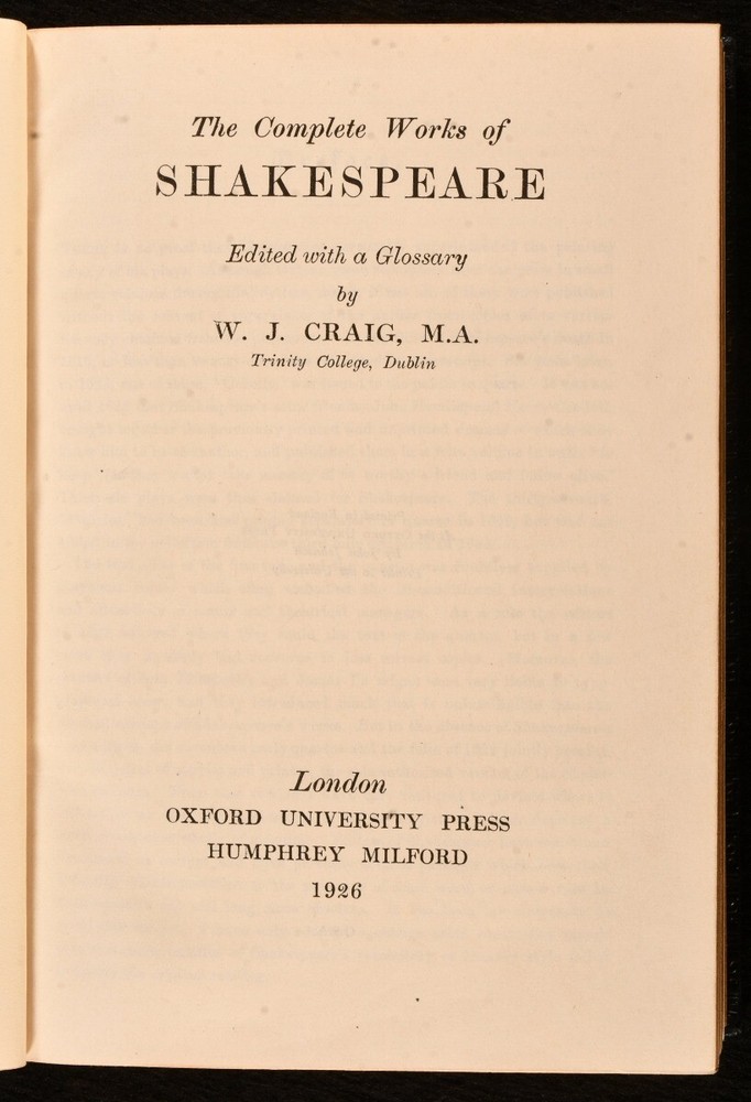 Click here to see our other books! The Complete Works of Shakespeare William Shakespeare 1926 Oxford University Press Humphrey Milford : London 7" by 5" viii, 1270pp. SUMMARY A complete collection of the works of Shakespeare, bound in a full calf prize binding. Leather Binding Overall Condition: Very Good Indeed This book weighs 0.75 KG when packed UK Postage: £ 3.99 US Postage: £ 19.99 EU Postage : £ 15.99 European Postage: £ 16.99 Asia Postage: £ 21.99 Worldwide Postage: £ 25.99 DESCRIPTION The complete works of Shakespeare. Illustrated with a monochrome frontispiece. Bound in a full calf prize binding from 'St Dunstan's School' with their gilt crest to the front. This work features the complete collection of works by the noted William Shakespeare. This edition has been edited with a glossary and introduction by W. J. Craig. This volume incudes all the celebrated author's poems plays and stories, including popular works such as Romeo and Juliet and Macbeth. CONDITION Bound in a full calf prize binding from 'St Dunstan's School' with their gilt crest to the front. Externally excellent with slight marks to the boards. Internally firmly bound with clean and bright pages. Past owner's signature to the blank. Overall Condition: Very Good Indeed GLOSSARY OF TERMS Overall Condition (Dustwrapper condition rating is shown after that for the book itself, where a dustwrapper is present) Fine - Very well preserved copy showing very little wear Very Good Indeed - Only one or two minor faults, really a very attractive copy Very Good - Quite a wide term meaning no major faults but probably several smaller ones often expected given the age of the book, but still a respectable copy Good - Meaning not very good. Some more serious faults as will be described in the condition report under 'condition' Good Only - Meaning one or more faults that could really do with repair Fair - As with good only above but with other faults leaving a compromised copy even after repair Poor - Really bad and possibly seriously incomplete. We only sell books in this condition where their rarity or value makes them attractive none the less. Major defects will be described. GUARANTEE We offer a full money back guarantee on our descriptions. Please ask for details and conditions. We prefer PAYPAL. If you pay via PAYPAL we will post the item off the same or the next working day with the postage you have selected. Please note we cannot accept USD cheques