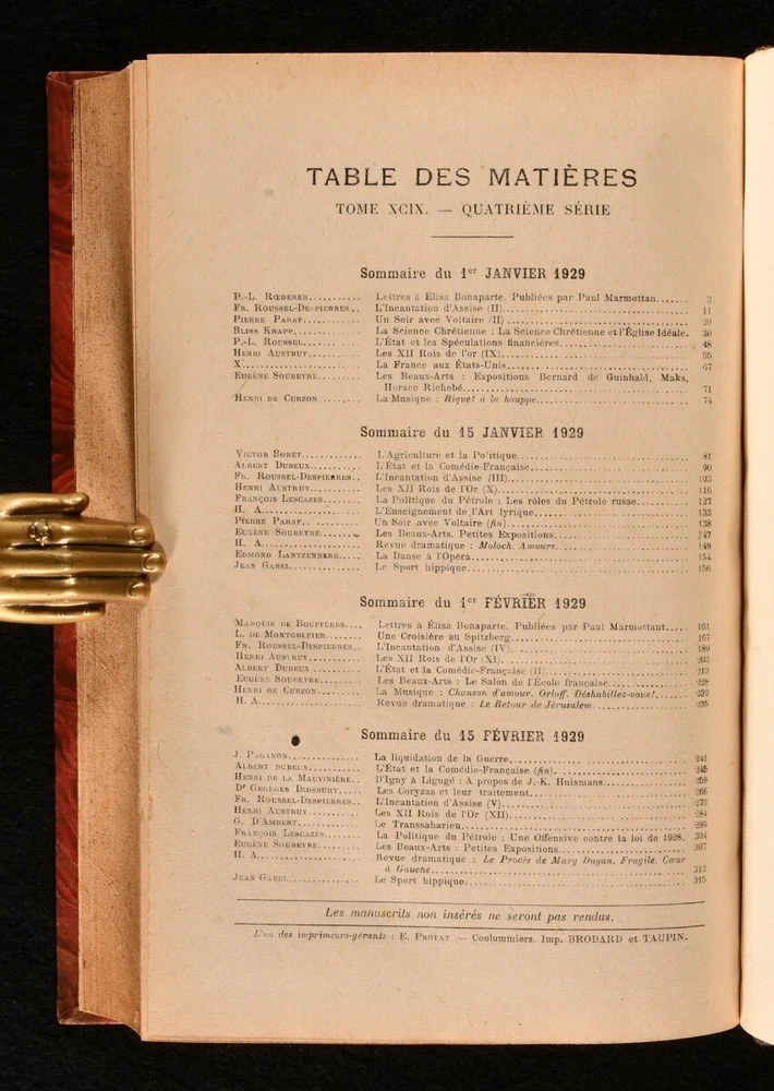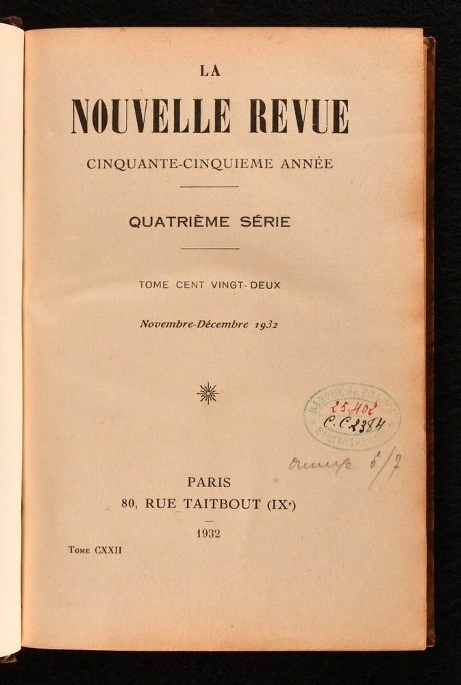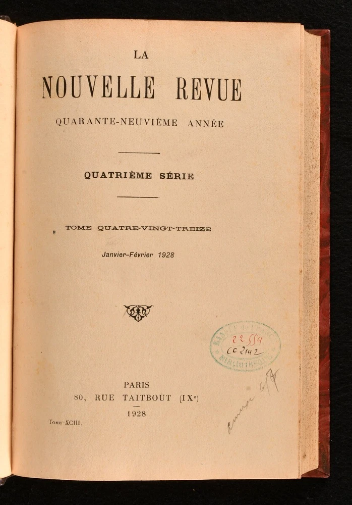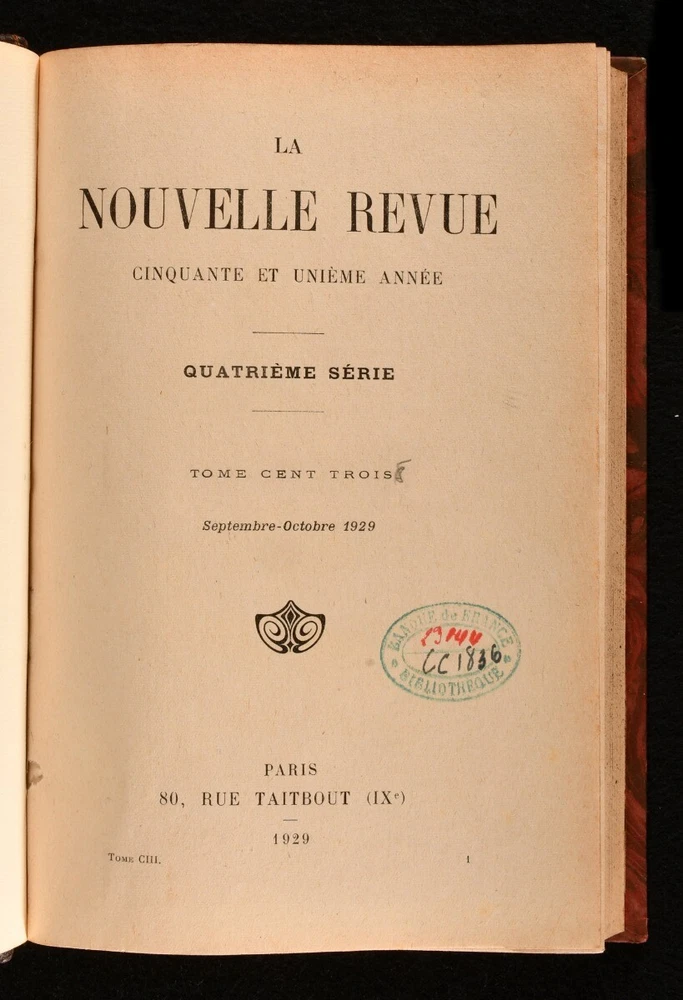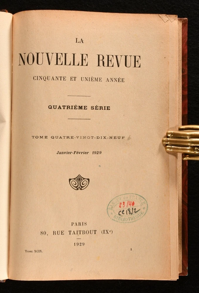 Click here to see our other books! La Nouvelle Revue Various 1928-1932 La Nouvelle Revue : Paris 9.5" by 6.5" [3] 319; [3] 318; [3] 319; [3] 319; [3] 318; [3] 316; [3] 317; [3] 319; [3] 317; [3] 320; [3] 316; [3] 319; [3] 318; [3], 318pp SUMMARY A very smart set of selected periodicals from 'La Nouvelle Revue' through the years 1928 to 1932, uniformly bound in quarter morocco. In French. Leather Binding,Rebound,Very Scarce Overall Condition: Very Good Indeed This book weighs 15 KG when packed UK Postage: £ 4.49 US Postage: £ 79.99 EU Postage : £ 40.99 European Postage: £ 75.99 Asia Postage: £ 159.99 Worldwide Postage: £ 249.99 DESCRIPTION Comprised of fourteen volumes published from 1928 to 1932. This set of selected works is comprised of periodicals from the French bimonthly review of print media, 'La Nouvelle Revue'. This periodical espoused Republican values, and was intended to oppose the other Republication periodical 'Revue Des Deux Mondes', which considered too conservative. This periodical was founded in October of 1879 by French socialite, writer, and republican, Juliette Adam. This set is comprised of the following volumes: Volumes XCIII, XCV, and XCVII from 1928 Volumes XCIX, CII, and CIII from 1929 Volumes CVI, CVII, and CX from 1930 Volumes CXI, CXIII, and CXVI from 1931 Volumes CXVIII and CXXII from 1932 Previously housed in the Banque de France Bibliotheque, with library stamps to the title pages. All volumes are also uniformly bound in the Banque de France quarter morocco binding, making it a very attractive and unique set. CONDITION Handsomely bound in quarter morocco with marble covered boards. Externally, excellent, with minimal shelf wear. Slight fading to the paper covered boards to Volume CX from 1930. Banque de France Bibliotheque library stamp to the title page of each volume. Internally, all volumes firmly bound. Page 6 to Volume CX from 1930 has a closed tear that has been crudely repaired. Pages slightly age-toned but otherwise clean throughout. Overall Condition: Very Good Indeed GLOSSARY OF TERMS Overall Condition (Dustwrapper condition rating is shown after that for the book itself, where a dustwrapper is present) Fine - Very well preserved copy showing very little wear Very Good Indeed - Only one or two minor faults, really a very attractive copy Very Good - Quite a wide term meaning no major faults but probably several smaller ones often expected given the age of the book, but still a respectable copy Good - Meaning not very good. Some more serious faults as will be described in the condition report under 'condition' Good Only - Meaning one or more faults that could really do with repair Fair - As with good only above but with other faults leaving a compromised copy even after repair Poor - Really bad and possibly seriously incomplete. We only sell books in this condition where their rarity or value makes them attractive none the less. Major defects will be described. GUARANTEE We offer a full money back guarantee on our descriptions. Please ask for details and conditions. We prefer PAYPAL. If you pay via PAYPAL we will post the item off the same or the next working day with the postage you have selected. Please note we cannot accept USD cheques