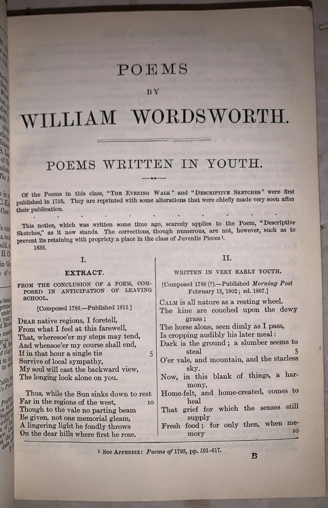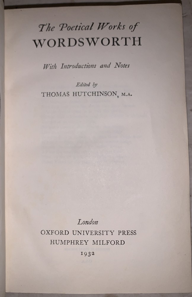 The Poetical Works of Wordsworth With Introduction and Notes Edited by Thomas Hutchinson, M.A. London: Oxford University Press 1932 Octavo, xxxii, 986 pages, period three quarter leather over cloth cov eered boards. Spine with raised bands, gilt decroation and lettering. Top edge gilt. Slight rubbing and wear to hinges and corners, else in good + condition. If you have any questions feel free to ask and don't forget to check out my other listings.